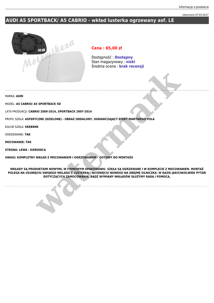 Informacje o produkcie Utworzono 07-03-2017 AUDI A5 SPORTBACK/ A5 CABRIO - wkład lusterka ogrzewany asf. LE Cena : 65,00 zł MARKA: AUDI er m ar k Dostępność : Dostępny Stan magazynowy : niski Średnia ocena : brak recenzji MODEL: A5 CABRIO/ A5 SPORTBACK 5D LATA PRODUKCJI: CABRIO 2009-2014, SPORTBACK 2007-2014 PROFIL SZKŁA: ASFERYCZNE (DZIELONE) - OBRAZ ODDALONY, OGRANICZAJĄCY EFEKT MARTWEGO POLA KOLOR SZKŁA: SREBRNE OGRZEWANIE: TAK MOCOWANIE: TAK STRONA: LEWA - KIEROWCA UWAGI: KOMPLETNY WKŁAD Z MOCOWANIEM I OGRZEWANIEM - GOTOWY DO MONTAŻU w at WKŁADY SĄ PRODUKTAMI NOWYMI, W FIRMOWYM OPAKOWANIU. SZKŁA SĄ OGRZEWANE I W KOMPLECIE Z MOCOWANIEM. MONTAŻ POLEGA NA USUNIĘCIU SWOJEGO WKLADU Z LUSTERKA I WCIŚNIĘCIU NOWEGO NA OBEJMĘ SILNICZKA. W RAZIE JAKICHKOLWIEK PYTAŃ DOTYCZĄCYCH ZAMOCOWANIA, BĄDŹ WYMIANY WKŁADÓW SŁUŻYMY RADĄ I POMOCĄ.