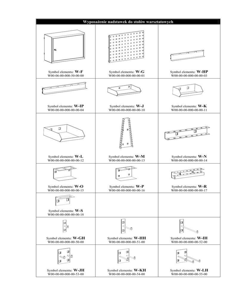 WyposaŜenie nadstawek do stołów warsztatowych Symbol elementu: W-F W00-06-00-000-50-00-00 Symbol elementu: W-G W00-00-00-000-00-00-01 Symbol elementu: W-HP W00-00-00-000-00-00-03 Symbol elementu: W-IP W00-00-00-000-00-00-04 Symbol elementu: W-J W00-00-00-000-00-00-10 Symbol elementu: W-K W00-00-00-000-00-00-11 Symbol elementu: W-L W00-00-00-000-00-00-12 Symbol elementu: W-M W00-00-00-000-00-00-13 Symbol elementu: W-N W00-00-00-000-00-00-14 Symbol elementu: W-O W00-00-00-000-00-00-15 Symbol elementu: W-P W00-00-00-000-00-00-16 Symbol elementu: W-R W00-00-00-000-00-00-17 Symbol elementu: W-GH W00-00-00-000-00-50-00 Symbol elementu: W-HH W00-00-00-000-00-51-00 Symbol elementu: W-IH W00-00-00-000-00-52-00 Symbol elementu: W-JH W00-00-00-000-00-53-00 Symbol elementu: W-KH W00-00-00-000-00-54-00 Symbol elementu: W-LH W00-00-00-000-00-55-00 Symbol elementu: W-S W00-00-00-000-00-00-18 Nadstawki do stołów warsztatowych 2-modułowych Symbol nadstawki: W-2N-1 Symbol nadstawki: W-2N-2 Symbol nadstawki : W-2N-3 Symbol nadstawki : W-2N-4 Symbol nadstawki: W-2N-5 Symbol nadstawki: W-2N-6 Nadstawki do stołów warsztatowych 3-modułowych Symbol nadstawki: W-3N-1 Symbol nadstawki: W-3N-4 Symbol nadstawki: W-3N-2 Symbol nadstawki: W-3N-5 Symbol nadstawki: W-3N-3 Symbol nadstawki: W-3N-6 Nadstawki do stołów warsztatowych 2-modułowych Wymiary zewnętrzne Nadstawka z dwoma panelami nadstawki: perforowanymi. Szerokość: 1355 mm Wysokość: 530 mm Nadstawka wykonana jest z profili metalowych, wyposaŜona w dwa panele perforowane, które umoŜliwiają montaŜ dodatkowego wyposaŜenia (np. uchwyty na wkrętaki, klucze, pojemniki). Malowana jest farbami proszkowymi (epoksydowo-poliestrowymi) w kolorze RAL7035. Wymiary zewnętrzne nadstawki: Nadstawka z czterema panelami perforowanymi. Szerokość: 1355 mm Wysokość: 1020 mm Nadstawka wykonana jest z profili metalowych, wyposaŜona w cztery panele perforowane, które umoŜliwiają montaŜ dodatkowego wyposaŜenia (np. uchwyty na wkrętaki, klucze, pojemniki). Malowana jest farbami proszkowymi (epoksydowo-poliestrowymi) w kolorze RAL7035. Symbol nadstawki: W-2N-1 Symbol nadstawki: W-2N-2 Wymiary zewnętrzne nadstawki: Szerokość: 1355 mm Wysokość: 1020 mm Nadstawka z jedną szafką Nadstawka wykonana jest z profili metalowych, wyposaŜona w trzy panele perforowane, które umoŜliwiają montaŜ dodatkowego wyposaŜenia (np. uchwyty na wkrętaki, klucze, pojemniki). Nadstawka posiada jedną szafkę z półką. Malowana jest farbami proszkowymi (epoksydowo-poliestrowymi) w kolorze RAL7035, a drzwi szafki w kolorze RAL6033. Symbol nadstawki: W-2N-3 Wymiary zewnętrzne nadstawki: Szerokość: 1355 mm Wysokość: 1020 mm Nadstawka z dwiema szafkami Nadstawka wykonana jest z profili metalowych, wyposaŜona w dwa panele perforowane, które umoŜliwiają montaŜ dodatkowego wyposaŜenia (np. uchwyty na wkrętaki, klucze, pojemniki). Nadstawka posiada dwie szafki z półką. Malowana jest farbami proszkowymi (epoksydowo-poliestrowymi) w kolorze RAL7035, a drzwi szafki w kolorze RAL6033. Symbol nadstawki: W-2N-4 Wymiary zewnętrzne nadstawki: Szerokość: 1355 mm Wysokość: 1020 mm Symbol nadstawki: W-2N-5 Wymiary zewnętrzne nadstawki: Szerokość: 1355 mm Wysokość: 1020 mm Symbol nadstawki : W-2N-6 Nadstawka z dwoma panelami perforowanymi i uchwytami na pojemniki. Nadstawka wykonana jest z profili metalowych, wyposaŜona w dwa panele perforowane, które umoŜliwiają montaŜ dodatkowego wyposaŜenia (np. uchwyty na wkrętaki, klucze, pojemniki). Nadstawka posiada cztery uchwyty na pojemniki małe (po 6 pojemników kaŜdy) i cztery uchwyty na pojemniki duŜe (po 4 pojemniki kaŜdy) Malowana jest farbami proszkowymi (epoksydowo-poliestrowymi) w kolorze RAL7035. Nadstawka z dwoma panelami perforowanymi i uchwytami na pojemniki. Nadstawka wykonana jest z profili metalowych, wyposaŜona w dwa panele perforowane, które umoŜliwiają montaŜ dodatkowego wyposaŜenia (np. uchwyty na wkrętaki, klucze, pojemniki). Nadstawka posiada cztery uchwyty na pojemniki małe (po 6 pojemników kaŜdy) i cztery uchwyty na pojemniki duŜe (po 4 pojemniki kaŜdy) Malowana jest farbami proszkowymi (epoksydowo-poliestrowymi) w kolorze RAL7035. Nadstawki do stołów warsztatowych 3-modułowych Wymiary zewnętrzne Nadstawka z trzema panelami nadstawki: perforowanymi. Szerokość: 2000 mm Wysokość: 530 mm Nadstawka wykonana jest z profili metalowych, wyposaŜona w trzy panele perforowane, które umoŜliwiają montaŜ dodatkowego wyposaŜenia (np. uchwyty na wkrętaki, klucze, pojemniki). Malowana jest farbami proszkowymi (epoksydowo-poliestrowymi) w kolorze RAL7035. Wymiary zewnętrzne nadstawki: Nadstawka z sześcioma panelami perforowanymi. Szerokość: 2000 mm Wysokość: 1020 mm Nadstawka wykonana jest z profili metalowych, wyposaŜona w sześć paneli perforowanych, które umoŜliwiają montaŜ dodatkowego wyposaŜenia (np. uchwyty na wkrętaki, klucze, pojemniki). Malowana jest farbami proszkowymi (epoksydowo-poliestrowymi) w kolorze RAL7035. Symbol nadstawki : W-3N-1 Symbol nadstawki: W-3N-2 Wymiary zewnętrzne nadstawki: Szerokość: 2000 mm Wysokość: 1020 mm Symbol nadstawki: W-3N-3 Wymiary zewnętrzne nadstawki: Szerokość: 2000 mm Wysokość: 1020 mm Symbol nadstawki: W-3N-4 Wymiary zewnętrzne nadstawki: Szerokość: 2000 mm Wysokość: 1020 mm Symbol nadstawki: W-3N-5 Wymiary zewnętrzne nadstawki: Szerokość: 2000 mm Głębokość: 730 mm Wysokość: 830 mm Wysokość ze regulowanymi stopkami: od 845-860 mm Symbol nadstawki: W-3N-6 Nadstawka z jedną szafką Nadstawka wykonana jest z profili metalowych, wyposaŜona w pięć paneli perforowanych, które umoŜliwiają montaŜ dodatkowego wyposaŜenia (np. uchwyty na wkrętaki, klucze, pojemniki). Nadstawka posiada jedną szafkę z półką. Malowana jest farbami proszkowymi (epoksydowo-poliestrowymi) w kolorze RAL7035, a drzwi szafki w kolorze RAL6033. Nadstawka z dwiema szafkami Nadstawka wykonana jest z profili met