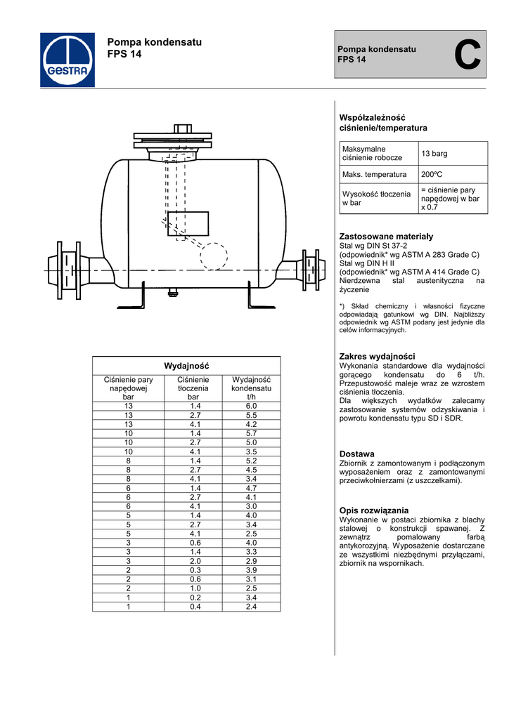 Pompa kondensatu FPS 14 C Pompa kondensatu FPS 14 Współzależność ciśnienie/temperatura Maksymalne ciśnienie robocze 13 barg Maks. temperatura 200ºC Wysokość tłoczenia w bar = ciśnienie pary napędowej w bar x 0.7 Zastosowane materiały Stal wg DIN St 37-2 (odpowiednik* wg ASTM A 283 Grade C) Stal wg DIN H II (odpowiednik* wg ASTM A 414 Grade C) Nierdzewna stal austenityczna na życzenie *) Skład chemiczny i własności fizyczne odpowiadają gatunkowi wg DIN. Najbliższy odpowiednik wg ASTM podany jest jedynie dla celów informacyjnych. Zakres wydajności Wydajność Ciśnienie pary napędowej bar 13 13 13 10 10 10 8 8 8 6 6 6 5 5 5 3 3 3 2 2 2 1 1 Ciśnienie tłoczenia bar 1.4 2.7 4.1 1.4 2.7 4.1 1.4 2.7 4.1 1.4 2.7 4.1 1.4 2.7 4.1 0.6 1.4 2.0 0.3 0.6 1.0 0.2 0.4 Wydajność kondensatu t/h 6.0 5.5 4.2 5.7 5.0 3.5 5.2 4.5 3.4 4.7 4.1 3.0 4.0 3.4 2.5 4.0 3.3 2.9 3.9 3.1 2.5 3.4 2.4 Wykonania standardowe dla wydajności gorącego kondensatu do 6 t/h. Przepustowość maleje wraz ze wzrostem ciśnienia tłoczenia. Dla większych wydatków zalecamy zastosowanie systemów odzyskiwania i powrotu kondensatu typu SD i SDR. Dostawa Zbiornik z zamontowanym i podłączonym wyposażeniem oraz z zamontowanymi przeciwkołnierzami (z uszczelkami). Opis rozwiązania Wykonanie w postaci zbiornika z blachy stalowej o konstrukcji spawanej. Z zewnątrz pomalowany farbą antykorozyjną. Wyposażenie dostarczane ze wszystkimi niezbędnymi przyłączami, zbiornik na wspornikach. C POZNAŃ www.armaterm.pl Pompa kondensatu FPS 14 Opis Zasilana parą pompa kondensatu typu FPS 14 wykorzystuje podczas pracy specjalny zawór sterowany pływakiem tel. +48 (61) 8488 431 fax +48 (61) 8488 431 e-mail: [email protected] Wymiary Kondensat wchodzi do zbiornika pompy kondensatu przez rurociąg wlotowy (1) i zawór zwrotny (C). Zawór upustowy (3) jest otwarty natomiast zawór pary napędowej (4) jest zamknięty. Kiedy poziom kondensatu w zbiorniku podnosi się, kula zaworu pływakowego jest unoszona. Jak tylko uzyskany zostanie maksymalny poziom, mechanizm sprężynowy zamontowany w zaworze pływakowym przeskakuje, zamyka zawór upustowy (3), i równocześnie otwiera zwór pary napędowej (4). Ciśnienie pary do podwyższania ciśnienia kondensatu zamyka zawór zwrotny (C), i wypycha kondensat na zewnątrz poprzez rurociąg wylotowy (2) oraz zawór zwrotny (D). Kiedy poziom kondensatu dojdzie do najniższego punktu, mechanizm sprężynowy zamyka zawór pary napędowej (4) i jednocześnie otwiera zawór upustowy (3). Kondensat może ponownie wpływać do zbiornika zaczynając nowy cykl pracy. A Kołnierz DN 80 PN 16 B Kołnierz DN 50 PN 16 C Zawór zwrotny typu RK 76 D Zawór zwrotny typu RK 76 E Zawór pływakowy 1 Wlot kondensatu 2 Wylot kondensatu 3 Zwór upustowy 4 Zawór pary napędowej 5 Korek odwodnienia Przy zamawianiu należy podać: Ciśnienie pary lub ciśnienie robocze, ciśnienie tłoczenia, ilość przetłaczanego kondensatu, wymiary nominalne, zastosowanie lub rodzaj wymiennika ciepła. Wszystkie wymagania odnośnie odbioru powinny zostać podane w zamówieniu. Po dostawie wyposażenia wystawienie certyfikatu nie będzie możliwe. W sprawie wysokości opłat za próby i odbiory prosimy o kontakt z naszym biurem. Schemat instalacji Upust do atmosfery Dostawa zgodnie z obowiązującymi ogólnymi warunkami dostaw. Zmiany techniczne zastrzeżone Pompa kondensatu © 2000 GESTRA Polonia sp. z o.o. - Gdańsk