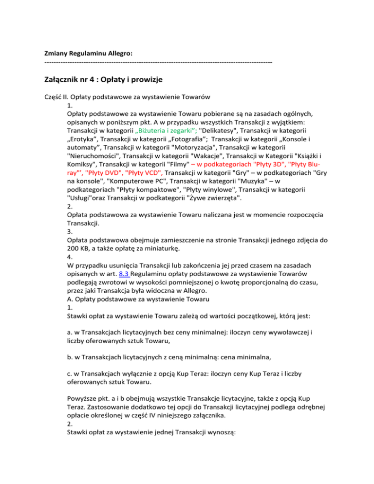 Zmiany Regulaminu Allegro: --------------------------------------------------------------------------------------------------- Załącznik nr 4 : Opłaty i prowizje Część II. Opłaty podstawowe za wystawienie Towarów 1. Opłaty podstawowe za wystawienie Towaru pobierane są na zasadach ogólnych, opisanych w poniższym pkt. A w przypadku wszystkich Transakcji z wyjątkiem: Transakcji w kategorii „Biżuteria i zegarki”; "Delikatesy", Transakcji w kategorii „Erotyka”, Transakcji w kategorii „Fotografia”; Transakcji w kategorii „Konsole i automaty”, Transakcji w kategorii "Motoryzacja", Transakcji w kategorii "Nieruchomości", Transakcji w kategorii "Wakacje", Transakcji w Kategorii "Książki i Komiksy", Transakcji w kategorii "Filmy" – w podkategoriach "Płyty 3D", "Płyty Bluray"’, "Płyty DVD", "Płyty VCD", Transakcji w kategorii "Gry" – w podkategoriach "Gry na konsole", "Komputerowe PC", Transakcji w kategorii "Muzyka" – w podkategoriach "Płyty kompaktowe", "Płyty winylowe", Transakcji w kategorii "Usługi"oraz Transakcji w podkategorii "Żywe zwierzęta". 2. Opłata podstawowa za wystawienie Towaru naliczana jest w momencie rozpoczęcia Transakcji. 3. Opłata podstawowa obejmuje zamieszczenie na stronie Transakcji jednego zdjęcia do 200 KB, a także opłatę za miniaturkę. 4. W przypadku usunięcia Transakcji lub zakończenia jej przed czasem na zasadach opisanych w art. 8.3 Regulaminu opłaty podstawowe za wystawienie Towarów podlegają zwrotowi w wysokości pomniejszonej o kwotę proporcjonalną do czasu, przez jaki Transakcja była widoczna w Allegro. A. Opłaty podstawowe za wystawienie Towaru 1. Stawki opłat za wystawienie Towaru zależą od wartości początkowej, którą jest: a. w Transakcjach licytacyjnych bez ceny minimalnej: iloczyn ceny wywoławczej i liczby oferowanych sztuk Towaru, b. w Transakcjach licytacyjnych z ceną minimalną: cena minimalna, c. w Transakcjach wyłącznie z opcją Kup Teraz: iloczyn ceny Kup Teraz i liczby oferowanych sztuk Towaru. Powyższe pkt. a i b obejmują wszystkie Transakcje licytacyjne, także z opcją Kup Teraz. Zastosowanie dodatkowo tej opcji do Transakcji licytacyjnej podlega odrębnej opłacie określonej w część IV niniejszego załącznika. 2. Stawki opłat za wystawienie jednej Transakcji wynoszą: Wartość początkowa Opłata za wystawienie 1,00 - 9,99 zł 0,08 zł 10,00 - 24,99 zł 0,13 zł 25,00 - 49,99 zł 0,25 zł 50,00 - 249,99 zł 0,50 zł 250 zł i więcej 1,00 zł 3. W przypadku podwyższenia w trakcie trwania Transakcji ceny minimalnej lub ceny Kup Teraz bądź liczby sprzedawanych sztuk Towarów opłata ulega odpowiedniemu podwyższeniu. 4. W przypadku obniżenia w trakcie trwania Transakcji ceny Kup Teraz bądź liczby sprzedawanych sztuk Towaru obniżenie opłaty i zwrot różnicy kosztów następuje wyłącznie w sytuacji, gdy obniżenie nastąpiło przed upływem 12 godzin od rozpoczęcia Transakcji. B. Opłaty podstawowe za wystawienie maszyny rolniczej, maszyny budowlanej, łodzi, przyczepy, naczepy, wózka widłowego lub pojazdu innego niż nowy motocykl bądź nowy quad w kategorii "Motoryzacja" 1. Opłata ma charakter ryczałtowy, tzn. jest stała niezależnie od wartości wystawionego pojazdu czy ustalonych cen. 2. Stawki opłat za wystawienie jednej Transakcji wynoszą: Opłata za Kategoria wystawienie "Samochody" oraz "Maszyny rolnicze" 25,00 zł "Motocykle i quady" (dotyczy wyłącznie motocykli i quadów używanych)", "Inne pojazdy i łodzie", "Przyczepy, naczepy" oraz 15,00 zł "Wózki widłowe" "Maszyny budowlane" z wyjątkiem wózków widłowych 30,00 zł C. Opłaty podstawowe za wystawienie Towaru w kategorii "Nieruchomości" Opłata za wystawienie Towaru w kategorii "Nieruchomości" ma charakter ryczałtowy, tzn. jest stała niezależnie od wartości wystawionego Towaru czy ustalonych cen i wynosi 20,00 zł za wyjątkiem kategorii „Pokoje do wynajęcia”, „Gotowe domy bez działki” oraz „Garaże i miejsca postojowe”, w których opłata wynosi 5,00 zł oraz kategorii „Projekty domów”, w której opłata wynosi 3,00 zł. D. Opłaty podstawowe za wystawienie Towaru w kategorii "Wakacje" Opłata za wystawienie Towaru w kategorii "Wakacje" ma charakter ryczałtowy, tzn. jest stała niezależnie od wartości wystawionego Towaru czy ustalonych cen i wynosi 15,00 zł. E. Opłaty podstawowe za wystawienie Towaru w kategoriach "Książki i Komiksy", Transakcji w kategorii "Filmy" – w podkategoriach "Płyty 3D", "Płyty Blu-ray"’, "Płyty DVD", "Płyty VCD", Transakcji w kategorii "Gry" – w podkategoriach "Gry na konsole", "Komputerowe PC", Transakcji w kategorii "Muzyka" – w podkategoriach "Płyty kompaktowe", "Płyty winylowe". Stawki opłat za wystawienie Towaru w kategoriach "Książki i Komiksy", Transakcji w kategorii "Filmy" – w podkategoriach "Płyty 3D", "Płyty Blu-ray"’, "Płyty DVD", "Płyty VCD", Transakcji w kategorii "Gry" – w podkategoriach "Gry na konsole", "Komputerowe PC", Transakcji w kategorii "Muzyka" – w podkategoriach "Płyty kompaktowe", "Płyty winylowe" wynoszą: Wartość początkowa Opłata za wystawienie 1,00 - 9,99 zł 0,05 zł 10,00 - 24,99 zł 0,08 zł 25,00 - 49,99 zł 0,10 zł 50,00 - 249,99 zł 0,15 zł 250 zł i więcej 0,20 zł F. Opłaty podstawowe za wystawienie Towaru w kategoriach "Usługi"* Opłata za wystawienie Towaru w kategoriach "Usługi" ma charakter ryczałtowy, tzn. jest stała niezależnie od wartości wystawionego Towaru czy ustalonych cen i wynosi 9,00 zł. *Przez kategorie „Usługi” rozumie się: a. Wszystkie podkategorie o nazwie „Usługi” w ramach kategorii „Antyki i Sztuka”; „Biżuteria i Zegarki”; „Delikatesy”; „Dziecko”; „Filmy”; „Fotografia”; „Gry”; „Instrumenty”; „Kolekcje”; „Komputery”; „Konsole i automaty”; „Książki i Komiksy”; „Motoryzacja”; „Muzyka”; „Odzież, Obuwie, Dodatki”; „Przemysł”; „RTV i AGD”;