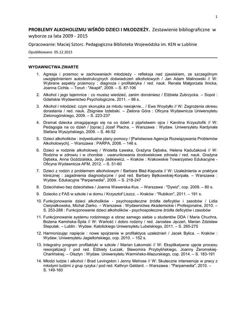 PROBLEMY ALKOHOLIZMU WŚRÓD DZIECI I MŁODZIEŻY. Zestawienie bibliograficzne w