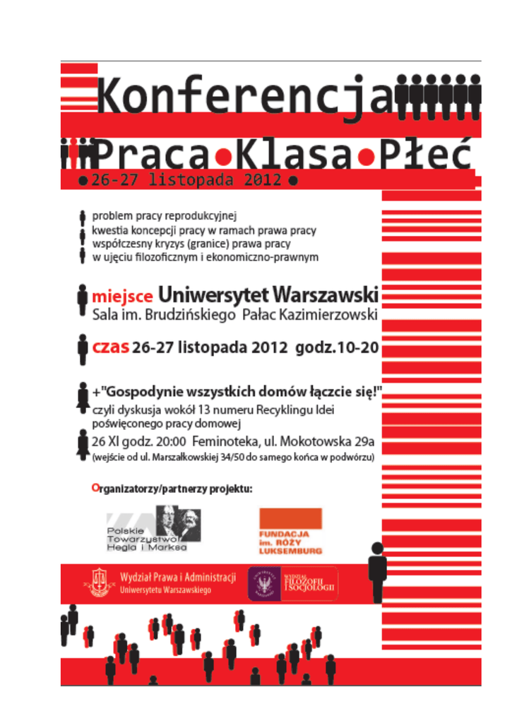 Konferencja Praca, klasa, płeć 26-27 listopada 2012, Uniwersytet Warszawski Pałac Kazimierzowski, Sala im. Brudzińskiego Organizatorzy/Partnerzy – Uniwersytet Warszawski: Wydział Filozofii i Socjologii Wydział Prawa i Administracji – Polskie Towarzystwo Hegla i Marksa – Wschodnioeuropejska Inicjatywa Filozoficzna „WIF” (konsorcjum naukowe Wydziału Filozofii i Socjologii UW, Instytutu Filozofii i Socjologii PAN, Uniwersytetu w Białymstoku, Wyższej Szkoły Administracji Publicznej w Białymstoku) – Rosa Luxemburg Stiftung Program konferencji Poniedziałek, 26 listopada 9.30 Rejestracja uczestników 10.00 Otwarcie konferencji przez Zastępcę Dyrektora Instytutu Filozofii UW Jakuba Kloc-Konkołowicza 10.30 Ewa Majewska (Instytut Kulturoznawstwa UJ) Społeczna filozofia feministyczna wobec wyzwań późnej nowoczesności Dyskusja 11.00 Agnieszka Mróz (Instytut Socjologii UAM) Opór w utowarowionym sektorze pracy domowej – taktyki polskich sprzątaczek Dyskusja 11.30 Andrzej Grzybowski (Instytut Filozofii UW) Podmiot (?) nieheteronormatywny jako podmiot radykalnej zmiany społecznej Dyskusja 12.00-12.15 Przerwa na kawę 12.15 Barbara Godlewska-Bujok (WPiA UW) Konstrukcja stosunku pracy w perspektywie feministycznej Dyskusja 12.45 Tomasz Lasocki (WPiA UW) Praca jako podstawa objęcia ubezpieczeniami społecznymi Dyskusja 13.15 Michał Kozłowski (Instytut Filozofii UW) Walka o pracę - o aktualności pewnych idei Marksa Dyskusja 14.15 – 16.00 Przerwa na lunch 16.00 Natalia Juchniewicz (Instytut Filozofii UW) Od niewolnictwa do zarządzania społecznego - Hegel o związku prawa i pracy Dyskusja 16.30 Katarzyna Hładec (Instytut Socjologii UJ) Konflikt, klasa, praca a koncepcja społecznej produkcji przestrzeni Dyskusja 17.00 Borys Cymbrowski (Instytut Socjologii Uniwersytetu Opolskiego) „18 brumaire'a Ludwika Bonaparte” jako teoretyzacja dynamiki przemian społecznych Dyskusja 17.30 Przerwa na kawę 17.45 Magda Malinowska (OZZ Inicjatywa Pracownicza, Poznań) Reprodukcja a strategie polityczne Dyskusja 18.15-18.45 Sebastian Michalik (Instytut Stosowanych Nauk Społecznych UW) Defamilizacja i praca zawodowa kobiet: pomiędzy obietnica wyzwolenia a dyktatem kapitału Dyskusja Wtorek, 27 listopada 10.00 Florian Nowicki (Instytut Filozofii UW, PTHM), Janusz Ostrowski (Instytut Filozofii UW, PTHM) Prezentacja Wykładów z filozofii nowoczesności Profesora Marka J. Siemka, członkazałożyciela PTHM, w kontekście problematyki konferencji Dyskusja 10.30 Lucyna Juśkiewicz (Instytut Filozofii UW) Agere et intelligere, albo z czym będzie się musiał człowiek zmierzyć nim zazna szabasu 11.00 Halina Walentowicz (Instytut Filozofii UW) Od Marksa do teorii (post)krytycznej Dyskusja 11.45 Janusz Ostrowski (Instytut Filozofii UW) Ontologiczna współzależność kapitalizmu, prawa pracy i polityki społecznej. Przyczynek do interpretacji koncepcji społeczeństwa obywatelskiego u Hegla i Marksowskiej teorii rozwoju technologicznego Dyskusja 12.15 Przerwa na kawę 12.30 Joanna Bednarek (Instytut Filozofii UAM) Krótka historia pracy domowej Dyskusja 13.00 Maciej Gdula (Instytut Socjologii UW) Praca i konflikt klasowy we współczesnym kapitalizmie Dyskusja 13.30 Rafał Krajzewicz (WPiA UW) Kto jest zatrudniony? - historyczna i filozoficzna analiza granic prawa pracy Dyskusja 14.00 Przerwa na kawę 14.15 Dyskusja panelowa z udziałem m.in. Wicemarszałek Sejmu RP Wandy Nowickiej, Doroty Dzienisiuk (Katedra Prawa Pracy i Polityki Społecznej WPiA UW), Macieja Gduli (IS UW, „Krytyka Polityczna”), Janusza Ostrowskiego (IF UW, PTHM) 15.45 Przerwa na lunch 16.45 Iwona Młoźniak (WFiS UW) Genderowe i klasowe uwarunkowania pracy reprodukcyjnej „seniorów” Dyskusja 17.15 Krzysztof Nowak (Instytut Filozofii UAM) O kapitalizacji pojęcia pracy Dyskusja 18.30-19.30 Florian Nowicki (Instytut Filozofii UW), Krzysztof Król (OZZ Inicjatywa Pracownicza, Poznań) Kapitalizm absolutny a nienajemna praca reprodukcyjna Dyskusja Komitet organizacyjny konferencji: – dr Barbara Godlewska–Bujok (WPiA UW) – Natalia Juchniewicz (WFiS UW) – dr Michał Kozłowski (WFiS UW) – dr Tomasz Kozłowski (WPiA UW) – Florian Nowicki (WFiS UW) – dr Janusz Ostrowski (koordynator, WFiS UW) – [email protected], 609 293 067 (uwagi prosimy zgłaszać mailem lub telefonicznie)