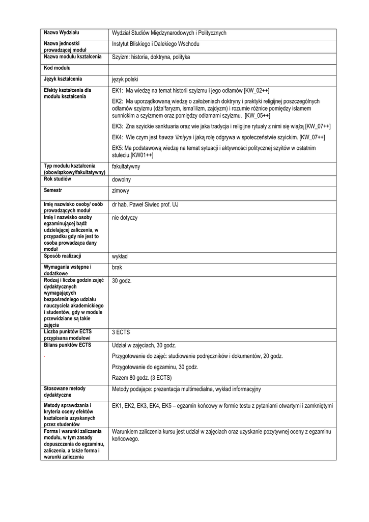 Nazwa Wydziału Wydział Studiów Międzynarodowych i Politycznych Nazwa jednostki prowadzącej moduł Nazwa modułu kształcenia Instytut Bliskiego i Dalekiego Wschodu Szyizm: historia, doktryna, polityka Kod modułu Język kształcenia język polski Efekty kształcenia dla modułu kształcenia EK1: Ma wiedzę na temat historii szyizmu i jego odłamów [KW_02++] EK2: Ma uporządkowaną wiedzę o założeniach doktryny i praktyki religijnej poszczególnych odłamów szyizmu (dża’faryzm, isma’ilizm, zajdyzm) i rozumie różnice pomiędzy islamem sunnickim a szyizmem oraz pomiędzy odłamami szyizmu. [KW_05++] EK3: Zna szyickie sanktuaria oraz wie jaka tradycja i religijne rytuały z nimi się wiążą [KW_07++] EK4: Wie czym jest hawza ‘ilmiyya i jaką rolę odgrywa w społeczeństwie szyickim. [KW_07++] EK5: Ma podstawową wiedzę na temat sytuacji i aktywności politycznej szyitów w ostatnim stuleciu.[KW01++] Typ modułu kształcenia (obowiązkowy/fakultatywny) Rok studiów fakultatywny Semestr zimowy Imię nazwisko osoby/ osób prowadzących moduł Imię i nazwisko osoby egzaminującej bądź udzielającej zaliczenia, w przypadku gdy nie jest to osoba prowadząca dany moduł Sposób realizacji dr hab. Paweł Siwiec prof. UJ Wymagania wstępne i dodatkowe Rodzaj i liczba godzin zajęć dydaktycznych wymagających bezpośredniego udziału nauczyciela akademickiego i studentów, gdy w module przewidziane są takie zajęcia Liczba punktów ECTS przypisana modułowi Bilans punktów ECTS brak . Przygotowanie do zajęć: studiowanie podręczników i dokumentów, 20 godz. dowolny nie dotyczy wykład 30 godz. 3 ECTS Udział w zajęciach, 30 godz. Przygotowanie do egzaminu, 30 godz. Razem 80 godz. (3 ECTS) Stosowane metody dydaktyczne Metody podające: prezentacja multimedialna, wykład informacyjny Metody sprawdzania i kryteria oceny efektów kształcenia uzyskanych przez studentów Forma i warunki zaliczenia modułu, w tym zasady dopuszczenia do egzaminu, zaliczenia, a także forma i warunki zaliczenia EK1, EK2, EK3, EK4, EK5 – egzamin końcowy w formie testu z pytaniami otwartymi i zamkniętymi Warunkiem zaliczenia kursu jest udział w zajęciach oraz uzyskanie pozytywnej oceny z egzaminu końcowego. poszczególnych zajęć wchodzących w zakres danego modułu Treści modułu kształcenia Wykaz literatury podstawowej i uzupełniającej, obowiązującej do zaliczenia danego modułu Geneza szyizmu. Kształtowanie się doktryny dża‘faryckiej w czasach imamów: koncepcja imamatu, tradycja i praktyki religijne. Szyizm dwunastoimamowy okresu okultacji mniejszej - po 874 r.) i okultacji większej – po 941 r.). Pierwsze ośrodki myśłi dża’faryckiej; rozwój szkolnictwa szyickiego, ewolucja koncepcji wilayat alfaqīh. Główne sanktuaria szyitów dwunastoimamowych oraz związane z nimi praktyki religijne. Zaydyci – historia, doktryna, współczesność. Isma’ilici – historia, podziały doktrynalne i polityczne, współczesność. Zaangażowanie polityczne szyitów w XIX i XX w.. Literatura podstawowa: Phillip Hitti, Dzieje Arabów Dziekan, M., Irak – religia i polityka. Warszawa 2005. Thierry Coville, Najnowsza historia Iranu. Republika islamska, Warszawa 2009. Małgorzata Stolarczyk, Iran. Państwo i religia, Warszawa 2015. The Encyclopaedia of Islam. Brill. Farhad Daftary, Ismailici. Zarys historii, Wydawnictwo „Dialog” 2009. http://www.jepeterson.net/sitebuildercontent/sitebuilderfiles/apbn-006_yemen_alhuthi_conflict.pdf. http://laur.lau.edu.lb:7080/xmlui/bitstream/handle/10725/385/Hani_Anouti_Thesis.pdf?sequence=1 Literatura uzupełniająca: http://www.shia.org. http://www.al-islam.org. http://ismailignosis.com http://www.academia.edu/Documents/in/Shia_Zaydis_in_Yemen_Zaydi_leadership Wymiar, zasady i forma odbywania praktyk, w przypadku gdy program kształcenia przewiduje praktyki brak