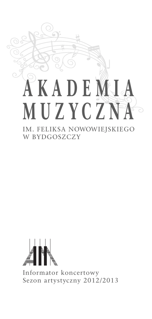AKADEMIA M U Z YC Z NA IM. FELIKSA NOWOWIEJSKIEGO W BYDGOSZCZY Informator koncertowy Sezon artystyczny 2012/2013 PAŹDZIERNIK poniedziałek, 1.10.2012, godz. 19.00 KONCERT Z OKAZJI INAUGURACJI ROKU AKADEMICKIEGO 2012/2013 Sala Koncertowa im. prof. R. Sucheckiego, ul. Staszica 3 Pavel Vernikov, skrzypce Orkiestra Kameralna Accademia dell’arco Paweł Radziński, dyrygent wtorek, 9.10.2012, godz. 19.00 CCXXXVIII BYDGOSKI WTOREK MUZYCZNY Sala Koncertowa im. prof. R. Sucheckiego, ul. Staszica 3 Lech Bałaban, altówka Krzysztof Sowiński, fortepian niedziela, 21.10.2012, godz. 10.00 i 11.30 CXLIX PORANEK MUZYCZNY dla dzieci z rodzicami Sala Koncertowa im. prof. R. Sucheckiego, ul. Staszica 3 Na wiślanym szlaku niedziela, 21.10.2012, godz. 17.00 CXXVII KONCERT PAŁACOWY Pałac w Lubostroniu Andrzej Łęgowski, flet Marek Swatowski, obój Magdalena Swatowska, fortepian INFORMATOR KONCERTOWY S e z o n A r t y s t yc z n y 2 0 1 2 / 2 0 1 3 3 wtorek, 23.10.2012, godz. 19.00 WIELKIE CYKLE CLAUDE DEBUSSY. Z OKAZJI 150. ROCZNICY URODZIN Sala Koncertowa im. prof. R. Sucheckiego, ul. Staszica 3 Daniel Rybicki, flet Paweł Radziński, skrzypce Beata Biernikiewicz, skrzypce Michalina Radzińska, skrzypce Jadwiga Stanek, altówka Maria Lewandowska, harfa Mariusz Klimsiak, fortepian wtorek, 30.10.2012, godz. 19.00 JADWIGA KALISZEWSKA IN MEMORIAM Sala Koncertowa im. prof. R. Sucheckiego, ul. Staszica 3 Agnieszka Dębkowska, skrzypce Marianna Szadowiak, skrzypce Bolesław Siarkiewicz, skrzypce Lech Bałaban, altówka Renata Marzec, wiolonczela Maciej Kamrowski, wiolonczela Joanna Czapińska-Wróblewska, fortepian Marcin Sikorski, fortepian 4 INFORMATOR KONCERTOWY S e z o n A r t y s t yc z n y 2 0 1 2 / 2 0 1 3 LISTOPAD czwartek, 8.11.2012, godz. 19.00 XCVII KONCERT ORGANOWY Sala Koncertowa im. prof. R. Sucheckiego, ul. Staszica 3 Roman Perucki, organy Paderewski Kwartet Bydgoszcz Aldona Cisewska, I skrzypce Marcin Pawełczyk, II skrzypce Zbigniew Milewski, altówka Maciej Kamrowski, wiolonczela niedziela, 18.11.2012, godz. 18.00 KONCERT SYMFONICZNY Sala Koncertowa Filharmonii Pomorskiej ul. A. Szwalbego 6 Chór Akademicki AM w Bydgoszczy Orkiestra Symfoniczna AM w Bydgoszczy Rafał Jacek Delekta, dyrygent wtorek, 20.11.2012, godz. 19.00 KONCERT KOMPOZYTORSKI w ramach IX Międzynarodowego Sympozjum Dzieło muzyczne i jego źródła Sala Koncertowa im. prof. R. Sucheckiego, ul. Staszica 3 Pedagodzy, studenci, goście AM w Bydgoszczy INFORMATOR KONCERTOWY S e z o n A r t y s t yc z n y 2 0 1 2 / 2 0 1 3 5 niedziela, 25.11.2012, godz. 10.00 i 11.30 CL PORANEK MUZYCZNY dla dzieci z rodzicami Sala Koncertowa im. prof. R. Sucheckiego, ul. Staszica 3 Z wizytą u Kota w butach wtorek, 27.11.2012, godz. 19.00 CCXXXIX BYDGOSKI WTOREK MUZYCZNY Sala Koncertowa im. prof. R. Sucheckiego, ul. Staszica 3 Agata Nowakowska-Gumiela, fortepian Piotr Kępiński, fortepian GRUDZIEŃ wtorek, 4.12.2012, godz. 19.00 WIELKIE CYKLE POLSKA PIEŚŃ ARTYSTYCZNA Sala Koncertowa im. prof. R. Sucheckiego, ul. Staszica 3 Ingrida Gápová, sopran Wojciech Dyngosz, baryton Adam Zaremba, baryton Justyna Jakubowska, fortepian czwartek, 6.12.2012, godz. 19.00 XCVIII KONCERT ORGANOWY Sala Koncertowa im. prof. R. Sucheckiego, ul. Staszica 3 Sławomir Kamiński, organy Kamila Kułakowska, sopran Tomasz Gust, fortepian 6 INFORMATOR KONCERTOWY S e z o n A r t y s t yc z n y 2 0 1 2 / 2 0 1 3 wtorek, 11.12.2012, godz. 19.00 CCXL BYDGOSKI WTOREK MUZYCZNY Sala Koncertowa im. prof. R. Sucheckiego, ul. Staszica 3 Katarzyna Bąkowska, skrzypce Dorota Zimna, klawesyn Franciszek Jasionowski, fortepian niedziela, 16.12.2012, godz. 10.00 i 11.30 CLI PORANEK MUZYCZNY dla dzieci z rodzicami Sala Koncertowa im. prof. R. Sucheckiego, ul. Staszica 3 Witamy Świętego Mikołaja niedziela, 16.12.2012, godz. 17.00 CXXVIII KONCERT PAŁACOWY Pałac w Lubostroniu Magdalena Krzyńska, sopran Maria Murawska, fortepian wtorek, 18.12.2012, godz. 19.00 KONCERT WIGILIJNY Sala Koncertowa im. prof. R. Sucheckiego, ul. Staszica 3 Orkiestra Kameralna Accademia dell’arco Paweł Radziński, dyrygent INFORMATOR KONCERTOWY S e z o n A r t y s t yc z n y 2 0 1 2 / 2 0 1 3 7 STYCZEŃ niedziela, 6.01.2013, godz. 17.00 CXXIX KONCERT PAŁACOWY Pałac w Lubostroniu Maciej Witkiewicz, bas Dorota Kuczyńska-Tlałka, fortepian niedziela, 13.01.2013, godz. 10.00 i 11.30 CLII PORANEK MUZYCZNY dla dzieci z rodzicami Sala Koncertowa im. prof. R. Sucheckiego, ul. Staszica 3 Spotkanie z włoską czarownicą niedziela, 13.01.2013, godz. 18.00 KONCERT KARNAWAŁOWY Sala Koncertowa Filharmonii Pomorskiej ul. A. Szwalbego 6 Orkiestra Symfoniczna AM w Bydgoszczy Zygmunt Rychert, dyrygent wtorek, 15.01.2013, godz. 19.00 CCXLI BYDGOSKI WTOREK MUZYCZNY Sala Koncertowa im. prof. R. Sucheckiego, ul. Staszica 3 Mariusz Klimsiak, fortepian 8 INFORMATOR KONCERTOWY S e z o n A r t y s t yc z n y 2 0 1 2 / 2 0 1 3 czwartek, 17.01.2013, godz. 19.00 XCIX KONCERT ORGANOWY Sala Koncertowa im. prof. R. Sucheckiego, ul. Staszica 3 Julian Gembalski, organy Rafał Żółkoś, flet Marek Kamola, fortepian czwartek, 24.01.2013, godz. 19.00 KONCERT Z OKAZJI 100. ROCZNICY URODZIN WITOLDA LUTOSŁAWSKIEGO Sala Koncertowa im. prof. R. Sucheckiego, ul. Staszica 3 Pedagodzy, studenci, goście AM w Bydgoszczy LUTY wtorek, 12.02.2013, godz. 19.00 KONCERT SPECJALNY Sala Koncertowa im. prof. R. Sucheckiego, ul. Staszica 3 Aleksander Andreyev, fortepian (Moskwa) Jekaterina Maretskaya, fortepian (Mińsk) LAUREACI NAGRODY REKTORA AM W BYDGOSZCZY VII MIĘDZYNARODOWEGO FORUM PIANISTYCZNEGO BIESZCZADY BEZ GRANIC INFORMATOR KONCERTOWY S e z o n A r t y s t yc z n y 2 0 1 2 / 2 0 1 3 9 niedziela, 17.02.2013, godz. 17.00 CXXX KONCERT PAŁACOWY Pałac w Lubostroniu Mariusz Klimsiak, fortepian Kwartet Smyczkowy Arte Con Brio Krystyna Prystasz, I skrzypce Marta Bilińska, II skrzypce Mirosław Przybył, altówka Agata Jarecka, wiolonczela wtorek, 19.02.2013, godz. 19.00 CCXLII BYDGOSKI WTOREK MUZYCZNY Sala Koncertowa im. prof. R. Sucheckiego,