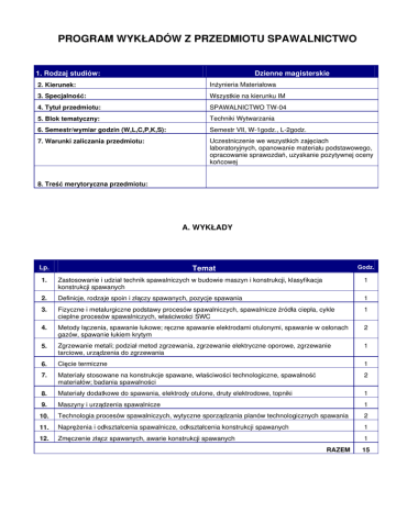 PROGRAM WYKŁADÓW Z PRZEDMIOTU SPAWALNICTWO 1. Rodzaj studiów: In ynieria Materiałowa 2. Kierunek: 3. Specjalno Dzienne magisterskie : Wszystkie na kierunku IM 4. Tytuł przedmiotu: SPAWALNICTWO TW-04 5. Blok tematyczny: Techniki Wytwarzania 6. Semestr/wymiar godzin (W,L,C,P,K,S): Semestr VII, W-1godz., L-2godz. 7. Warunki zaliczania przedmiotu: Uczestniczenie we wszystkich zaj ciach laboratoryjnych, opanowanie materiału podstawowego, opracowanie sprawozda , uzyskanie pozytywnej oceny ko cowej 8. Tre merytoryczna przedmiotu: A. WYKŁADY Lp. Godz. Temat 1. Zastosowanie i udział technik spawalniczych w budowie maszyn i konstrukcji, klasyfikacja konstrukcji spawanych 1 2. Definicje, rodzaje spoin i zł czy spawanych, pozycje spawania 1 3. Fizyczne i metalurgiczne podstawy procesów spawalniczych, spawalnicze ródła ciepła, cykle cieplne procesów spawalniczych, wła ciwo ci SWC 1 4. Metody ł czenia, spawanie łukowe; r czne spawanie elektrodami otulonymi, spawanie w osłonach gazów, spawanie łukiem krytym 2 5. Zgrzewanie metali; podział metod zgrzewania, zgrzewanie elektryczne oporowe, zgrzewanie tarciowe, urz dzenia do zgrzewania 1 6. Ci cie termiczne 1 7. Materiały stosowane na konstrukcje spawane, wła ciwo ci technologiczne, spawalno materiałów; badania spawalno ci 2 8. Materiały dodatkowe do spawania, elektrody otulone, druty elektrodowe, topniki 1 9. Maszyny i urz dzenia spawalnicze 1 10. Technologia procesów spawalniczych, wytyczne sporz dzania planów technologicznych spawania 2 11. Napr 1 12. Zm czenie zł cz spawanych, awarie konstrukcji spawanych enia i odkształcenia spawalnicze, odkształcenia konstrukcji spawanych 1 RAZEM 15 B. LABORATORIUM Lp. Godz. Temat 1. Zagro enia wyst puj ce przy spawaniu i ci ciu, zasady bezpiecze stwa przy pracach spawalniczych i obsłudze sprz tu spawalniczego 1 2. Sprz t spawalniczy, zasady eksploatacji i obsługi 2 3. Podstawowe metody ł czenia metali: spawanie gazowe, łukowe elektrodami otulonymi, w osłonach gazów; napawanie, ci cie termiczne, technika spawania i ci cia tworzyw metalowych 4 4. Projektowanie procesów technologicznych; 2 5. Weryfikacja dokumentacji technicznej, ocena przydatno ci materiałów podstawowych i dodatkowych; spawalno stali, wyznaczanie równowa nika w gla podstawowych gatunków stali konstrukcyjnych 3 6. Przygotowanie do spawania, trasowanie, ci cie, ukosowanie 2 7. Wytyczne technologii spawania, wybór metody ł czenia, dobór materiałów dodatkowych 2 8. Dobór parametrów spawania 2 9. Opracowanie kart technologicznych (operacyjnych) wybranych procesów spawania 4 10. Obróbka cieplna zł cz spawanych; podgrzewanie wst pne, zabiegi cieplne w czasie spawania, 3 11. Zabiegi i czynno ci ko cowe po spawaniu 1 12. Ocena własno ci zł cz spawanych 2 13. Dokumentacja spawalnicza 2 RAZEM 9. Osoba odpowiedzialna za przedmiot: dr hab. in . Andrzej Zaj c prof. PK 10. Jednostka organizacyjna: Z-d Spawalnictwa IIM 11. Pomoce dydaktyczne: Urz dzenia spawalnicze, sprz t laboratoryjny 30