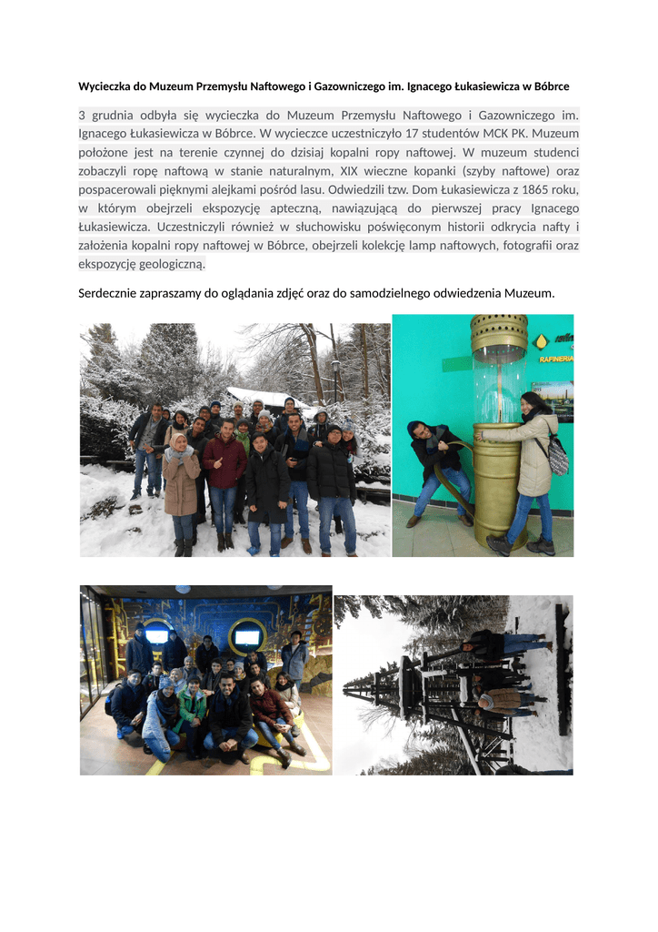 Wycieczka do Muzeum Przemysłu Naftowego i Gazowniczego im. Ignacego Łukasiewicza w Bóbrce 3 grudnia odbyła się wycieczka do Muzeum Przemysłu Naftowego i Gazowniczego im. Ignacego Łukasiewicza w Bóbrce. W wycieczce uczestniczyło 17 studentów MCK PK. Muzeum położone jest na terenie czynnej do dzisiaj kopalni ropy naftowej. W muzeum studenci zobaczyli ropę naftową w stanie naturalnym, XIX wieczne kopanki (szyby naftowe) oraz pospacerowali pięknymi alejkami pośród lasu. Odwiedzili tzw. Dom Łukasiewicza z 1865 roku, w którym obejrzeli ekspozycję apteczną, nawiązującą do pierwszej pracy Ignacego Łukasiewicza. Uczestniczyli również w słuchowisku poświęconym historii odkrycia nafty i założenia kopalni ropy naftowej w Bóbrce, obejrzeli kolekcję lamp naftowych, fotografii oraz ekspozycję geologiczną. Serdecznie zapraszamy do oglądania zdjęć oraz do samodzielnego odwiedzenia Muzeum.
