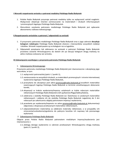 I Warunki rozpatrzenia wniosku o patronat medialny Polskiego Radia Białystok 1. Polskie Radio Białystok przyznaje patronat medialny tylko na wyłączność wśród rozgłośni. Wyłączność obejmuje również zamieszczanie na materiałach i drukach informacyjnych i promocyjnych logotypu Polskiego Radia Białystok. 2. Warunkiem uzyskania patronatu medialnego Polskiego Radia Białystok jest opłacanie abonamentu radiowo-telewizyjnego. II Rozpatrywanie wniosków o patronat / odpowiedzi na wnioski 1. O przyznaniu patronatu medialnego Polskiego Radia Białystok oraz o jego zakresie decyduje kolegium redakcyjne Polskiego Radia Białystok złożone z kierowników wszystkich redakcji i działów. Wnioski rozpatrywane są na kolegium raz w tygodniu. 2. Odpowiedź pozytywna lub odmowna na wniosek o patronat Polskiego Radia Białystok przesłana zostanie Wnioskującemu do dwóch dni po decyzji kolegium drogą mailową na adres mailowy wskazany we wniosku. III Zobowiązania wynikające z przyznania patronatu Polskiego Radia Białystok 1. Zobowiązania Wnioskującego Przyznanie patronatu medialnego Polskiego Radia Białystok jest równoznaczne z akceptacją jego warunków, w tym: 1.1. wyłączności patronackiej (patrz I / punkt 1), 1.2. zamieszczenia na wszystkich drukach, w materiałach promocyjnych i stronie internetowej wydarzenia logotypu Polskiego Radia Białystok, 1.3. przesyłania do akceptacji pod adres [email protected] wszelkich materiałów zawierających logotyp Polskiego Radia Białystok w terminie umożliwiającym dokonanie korekt, 1.4. ekspozycji w trakcie wydarzenia/imprezy ustalonych w trybie roboczym materiałów reklamowych Polskiego Radia Białystok (roll-up/banner/flaga/tablica/balon), 1.5. odebrania z siedziby Polskiego Radia Białystok (ul. Świerkowa 1) ustalonych materiałów reklamowych i oddania ich do siedziby Polskiego Radia Białystok najpóźniej do 3 dni roboczych po zakończeniu objętej patronatem imprezy/ wydarzenia, 1.6. przesłania po wydarzeniu/imprezie na adres [email protected] dokumentacji zdjęciowej z ekspozycji przekazanych materiałów reklamowych, 1.7. odpowiedzialności materialnej za odebrane materiały reklamowe, a w przypadku ich zniszczenia/uszkodzenia/zgubienia do pokrycia kosztów ich naprawy lub ponownego wykonania. 2. Zobowiązania Polskiego Radia Białystok Objęcie przez Polskie Radio Białystok patronatem medialnym imprezy/wydarzenia jest równoznaczne z: 2.1. obsługą danego wydarzenia w zakresie przekazanym Wnioskującemu drogą mailową (patrz II / punkt 2), 2.2. zgodą na użycie logotypu Polskiego Radia Białystok na stronie internetowej poświęconej wydarzeniu/imprezie oraz na wszystkich drukach i materiałach promocyjnych dotyczących imprezy wydarzenia. IV Specyfikacja materiałów do publikacji w serwisie internetowym Polskiego Radia Białystok www.radiobialystok.pl Materiały do imprezy/wydarzenia objętego patronatem przez Polskie Radio Białystok proszę nadsyłać na adres: [email protected] najpóźniej do 7 dni przed planowanym wydarzeniem/imprezą. E-mail proszę koniecznie zatytułować „Materiały na www: nazwa i data imprezy/wydarzenia”. Informacja pojawi się na stronach Polskiego Radia Białystok w dziale Patronaty do 3 dni roboczych po otrzymaniu materiałów, nie wcześniej niż 7 dni przed imprezą/wydarzeniem. W celu aktualizacji danych dotyczących wydarzenia, należy przesłać na adres [email protected] wiadomość e-mail zatytułowaną: „Aktualizacja: nazwa i data imprezy/wydarzenia”. Aktualizacja nastąpi w ciągu trzech dni roboczych. Przy czym Polskie Radio Białystok zastrzega sobie możliwość redagowania i skracania nadesłanych materiałów. 1. Specyfikacja plików tekstowych z informacją o imprezie/wydarzeniu. 1.1. materiały informacyjne proszę przesyłać w pliku tekstowym, w jednym ze wskazanych formatów: *.txt, *.rtf, *.doc , *.odt., 1.2. w pliku tekstowym powinien znajdować się tylko krótki opis imprezy/wydarzenia przeznaczony do publikacji na stronach Polskiego Radia Białystok – organizator, data, miejsce oraz cel imprezy/wydarzenia, 1.3. nie mogą znajdować w nim zaimpotrowane pliki graficzne (zdjęcia, plakaty, logotypy, itp.). Całość tekstu nie może przekroczyć 500 słów – nie dotyczy ewentualnego programu imprezy. 2. Specyfikacja plików graficznych, uzupełniających informację o imprezie/wydarzeniu. Materiały graficzne prosimy przesyłać w formacie *.jpg, *.bmp, *.tiff. Rozmiar pliku graficznego nie może przekraczać 500 kB (0,5 MB). Wymiary zdjęcia, plakatu, logotypu, itp. nie mogą przekraczać 1024 x 800 lub 800 x 1024 (szerokość x wysokość) w jednym pliku. Plik graficzny powinien być typu (paleta kolorów) RBG - NIE CMYK. Przesłane materiały, które nie spełniają wymagań zawartych w w/w specyfikacji, zostaną odrzucone przez administratora strony. Kontakt Patronaty medialne Polskiego Radia Białystok – pytania, kontakt: E-mail: [email protected] Tel. 85 745 62 45