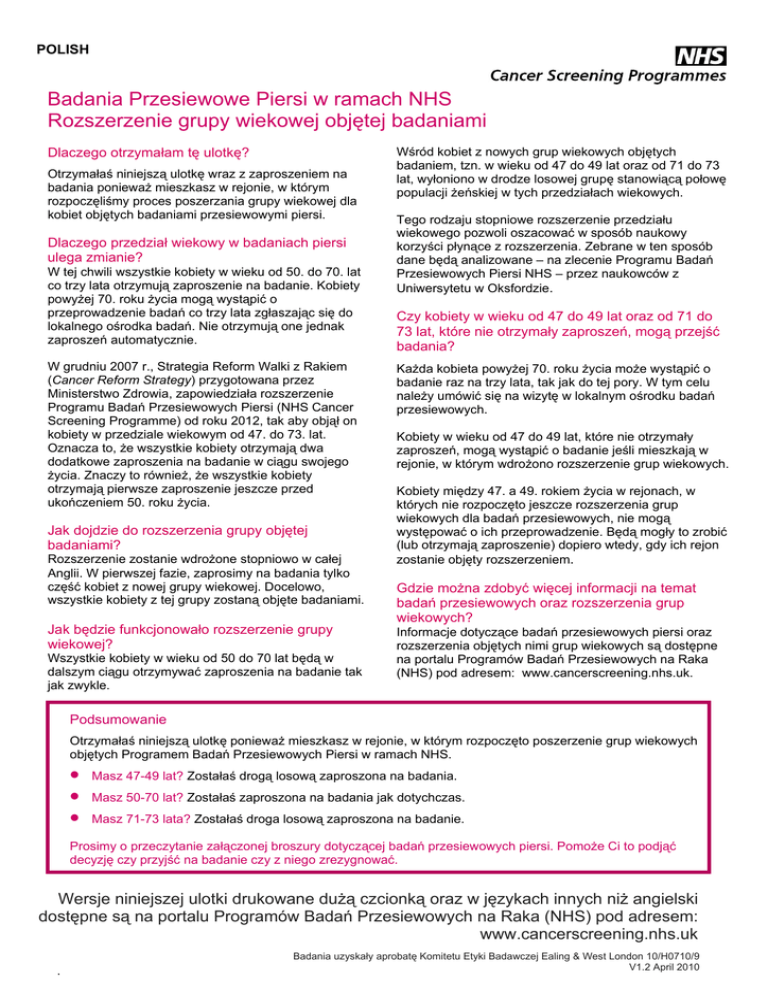 POLISH Badania Przesiewowe Piersi w ramach NHS Rozszerzenie grupy wiekowej objętej badaniami Dlaczego otrzymałam tę ulotkę? Otrzymałaś niniejszą ulotkę wraz z zaproszeniem na badania ponieważ mieszkasz w rejonie, w którym rozpoczęliśmy proces poszerzania grupy wiekowej dla kobiet objętych badaniami przesiewowymi piersi. Dlaczego przedział wiekowy w badaniach piersi ulega zmianie? W tej chwili wszystkie kobiety w wieku od 50. do 70. lat co trzy lata otrzymują zaproszenie na badanie. Kobiety powyżej 70. roku życia mogą wystąpić o przeprowadzenie badań co trzy lata zgłaszając się do lokalnego ośrodka badań. Nie otrzymują one jednak zaproszeń automatycznie. W grudniu 2007 r., Strategia Reform Walki z Rakiem (Cancer Reform Strategy) przygotowana przez Ministerstwo Zdrowia, zapowiedziała rozszerzenie Programu Badań Przesiewowych Piersi (NHS Cancer Screening Programme) od roku 2012, tak aby objął on kobiety w przedziale wiekowym od 47. do 73. lat. Oznacza to, że wszystkie kobiety otrzymają dwa dodatkowe zaproszenia na badanie w ciągu swojego życia. Znaczy to również, że wszystkie kobiety otrzymają pierwsze zaproszenie jeszcze przed ukończeniem 50. roku życia. Jak dojdzie do rozszerzenia grupy objętej badaniami? Rozszerzenie zostanie wdrożone stopniowo w całej Anglii. W pierwszej fazie, zaprosimy na badania tylko część kobiet z nowej grupy wiekowej. Docelowo, wszystkie kobiety z tej grupy zostaną objęte badaniami. Jak będzie funkcjonowało rozszerzenie grupy wiekowej? Wszystkie kobiety w wieku od 50 do 70 lat będą w dalszym ciągu otrzymywać zaproszenia na badanie tak jak zwykle. Wśród kobiet z nowych grup wiekowych objętych badaniem, tzn. w wieku od 47 do 49 lat oraz od 71 do 73 lat, wyłoniono w drodze losowej grupę stanowiącą połowę populacji żeńskiej w tych przedziałach wiekowych. Tego rodzaju stopniowe rozszerzenie przedziału wiekowego pozwoli oszacować w sposób naukowy korzyści płynące z rozszerzenia. Zebrane w ten sposób dane będą analizowane – na zlecenie Programu Badań Przesiewowych Piersi NHS – przez naukowców z Uniwersytetu w Oksfordzie. Czy kobiety w wieku od 47 do 49 lat oraz od 71 do 73 lat, które nie otrzymały zaproszeń, mogą przejść badania? Każda kobieta powyżej 70. roku życia może wystąpić o badanie raz na trzy lata, tak jak do tej pory. W tym celu należy umówić się na wizytę w lokalnym ośrodku badań przesiewowych. Kobiety w wieku od 47 do 49 lat, które nie otrzymały zaproszeń, mogą wystąpić o badanie jeśli mieszkają w rejonie, w którym wdrożono rozszerzenie grup wiekowych. Kobiety między 47. a 49. rokiem życia w rejonach, w których nie rozpoczęto jeszcze rozszerzenia grup wiekowych dla badań przesiewowych, nie mogą występować o ich przeprowadzenie. Będą mogły to zrobić (lub otrzymają zaproszenie) dopiero wtedy, gdy ich rejon zostanie objęty rozszerzeniem. Gdzie można zdobyć więcej informacji na temat badań przesiewowych oraz rozszerzenia grup wiekowych? Informacje dotyczące badań przesiewowych piersi oraz rozszerzenia objętych nimi grup wiekowych są dostępne na portalu Programów Badań Przesiewowych na Raka (NHS) pod adresem: www.cancerscreening.nhs.uk. Podsumowanie Otrzymałaś niniejszą ulotkę ponieważ mieszkasz w rejonie, w którym rozpoczęto poszerzenie grup wiekowych objętych Programem Badań Przesiewowych Piersi w ramach NHS. • • • Masz 47-49 lat? Zostałaś drogą losową zaproszona na badania. Masz 50-70 lat? Zostałaś zaproszona na badania jak dotychczas. Masz 71-73 lata? Zostałaś droga losową zaproszona na badanie. Prosimy o przeczytanie załączonej broszury dotyczącej badań przesiewowych piersi. Pomoże Ci to podjąć decyzję czy przyjść na badanie czy z niego zrezygnować. Wersje niniejszej ulotki drukowane dużą czcionką oraz w językach innych niż angielski dostępne są na portalu Programów Badań Przesiewowych na Raka (NHS) pod adresem: www.cancerscreening.nhs.uk Badania uzyskały aprobatę Komitetu Etyki Badawczej Ealing & West London 10/H0710/9 V1.2 April 2010