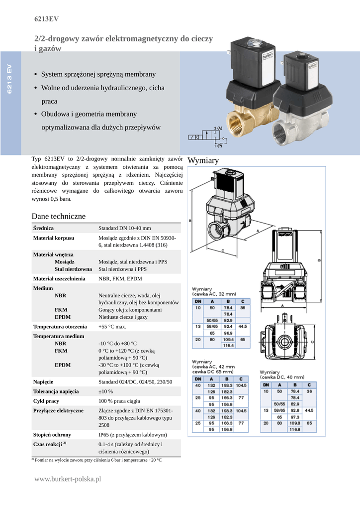 6213EV 2/2-drogowy zawór elektromagnetyczny do cieczy i gazów • System sprzężonej sprężyną membrany • Wolne od uderzenia hydraulicznego, cicha praca • Obudowa i geometria membrany optymalizowana dla dużych przepływów Typ 6213EV to 2/2-drogowy normalnie zamknięty zawór elektromagnetyczny z systemem otwierania za pomocą membrany sprzężonej sprężyną z rdzeniem. Najczęściej stosowany do sterowania przepływem cieczy. Ciśnienie różnicowe wymagane do całkowitego otwarcia zaworu wynosi 0,5 bara. Dane techniczne Średnica Standard DN 10-40 mm Materiał korpusu Mosiądz zgodnie z DIN EN 509306, stal nierdzewna 1.4408 (316) Materiał wnętrza Mosiądz Stal nierdzewna Mosiądz, stal nierdzewna i PPS Stal nierdzewna i PPS Materiał uszczelnienia NBR, FKM, EPDM Medium NBR FKM EPDM Temperatura otoczenia Temperatura medium NBR FKM EPDM Neutralne ciecze, woda, olej hydrauliczny, olej bez komponentów Gorący olej z komponentami Nietłuste ciecze i gazy +55 °C max. -10 °C do +80 °C 0 °C to +120 °C (z cewką poliamidową + 90 °C) -30 °C to +100 °C (z cewką poliamidową + 90 °C) Napięcie Standard 024/DC, 024/50, 230/50 Tolerancja napięcia ±10 % Cykl pracy 100 % praca ciągła Przyłącze elektryczne Złącze zgodne z DIN EN 175301803 do przyłącza kablowego typu 2508 Stopień ochrony IP65 (z przyłączem kablowym) Czas reakcji 2) 2) 0.1-4 s (zależny od średnicy i ciśnienia różnicowego) Pomiar na wylocie zaworu przy ciśnieniu 6 bar i temperaturze +20 °C www.burkert-polska.pl Wymiary 6213EV Ś re dn ica DN 10 10 13 13 20 20 25 25 40 40 Pobór m ocy Klasa uz woje n ia ce wki 1) O twie ranie AC [VA] AC [VA/W ] Podtrz ym anie 34 34 36 36 38 38 150 150 190 190 14/8 14/8 14/8 14/8 14/8 14/8 37/16 37/16 37/16 37/16 1) Wartości w nawiasach dotyczą temperatury cewki 20 °C 2) H – cewka epoksydowa, B – cewka poliamidowa Mate ri ał usz cz e ln ie ni a FKM DC [W ] 10 10 10 10 10 10 28 28 28 28 (11) (11) (11) (11) (11) (11) (29) (29) (29) (29) H H H H H H H H H H 2) Mate riał usz cz e ln ie nia NBR I EPDM B B B B B B H H H H Tabela zamówieniowa S posób dz iałan ia Prz yłącz e [cal] Ś re dn ica [m m ] W artość Kv dla wody [m 3/h ] Zakre s ciśnie ń [bar] Korpus m osię ż ny, u sz cz e lnie n ie FKM, ce wka e poksydowa, te m pe ratu ra m e dium 0 do +120 °C A 2/2-drogowy normalnie G 1/4 10 1.9 0 - 10 zamknięty G 3/8 10 1.9 0 - 10 Num e r z am ówie n iowy 024/DC 024/50 230/50 221 678 221 679 221 681 221 610 221 611 221 613 G 1/2 10 1.9 0 - 10 221 614 221 615 221 616 G 1/2 13 3.6 0 - 10 221 622 221 623 221 625 G 3/4 13 3.6 0 - 10 221 626 221 627 221 629 G 3/4 20 8.3 0 - 10 221 638 221 639 221 641 G 1 20 8.3 0 - 10 221 642 221 643 221 645 G 1 25 11.0 0 - 10 227 537 221 733 221 736 G 1 1/4 25 11.0 0 - 10 227 538 221 737 221 740 G 1 1/2 40 30 0 - 10 227 544 227 724 227 726 G 2 40 30 0 - 10 227 545 227 728 227 730 221 670 221 671 221 673 221 646 221 647 221 649 Korpus m osię ż ny, u sz cz e lnie n ie EPDM, ce wk a poliam idowa, te m pe ratura m e diu m -30 do +90 °C A 2/2-drogowy normalnie G 1/4 10 1.9 0 - 10 zamknięty G 3/8 10 1.9 0 - 10 G 1/2 10 1.9 0 - 10 221 650 221 651 221 653 G 1/2 13 3.6 0 - 10 221 654 221 655 221 657 G 3/4 13 3.6 0 - 10 221 658 221 659 221 661 G 3/4 20 8.3 0 - 10 221 662 221 663 221 665 G 1 20 8.3 0 - 10 221 666 221 667 221 669 227 535 221 717 221 720 227 536 221 721 221 724 Korpus m osię ż ny, u sz cz e lnie n ie EPDM, ce wk a e pok sydowa, te m pe ratura m e diu m -30 do +100 °C A 2/2-drogowy normalnie G 1 25 11 0 - 10 zamknięty G 1 1/4 25 11 0 - 10 G 1 1/2 40 30 0 - 10 227 542 221 741 221 745 G 2 40 30 0 - 10 227 543 221 746 221 749 www.burkert-polska.pl 6213EV Tabela zamówieniowa S posób dz iałania Prz yłącz e [cal] Śre dnica [m m ] W artość Kv dla wody [m 3/h] Zak re s ci śn ie ń [bar] Korpus m osię ż ny, u sz cz e lnie n ie NBR, ce wk a poliam idowa, te m pe ratura m e diu m -10 do +80 °C A 2/2-drogowy normalnie G 1/4 10 1.9 0 - 10 zamknięty G 3/8 10 1.9 0 - 10 Nu m e r z am ówi e niowy 024/DC 024/50 230/50 221 674 221 675 221 677 221 598 221 599 221 601 G 1/2 10 1.9 0 - 10 221 606 221 607 221 609 G 1/2 13 3.6 0 - 10 221 602 221 603 221 605 G 3/4 13 3.6 0 - 10 221 618 221 619 221 621 G 3/4 20 8.3 0 - 10 221 630 221 631 221 633 G 1 20 8.3 0 - 10 221 634 221 635 221 637 227 533 221 725 221 728 227 534 221 729 221 732 Korpus m osię ż ny, u sz cz e lnie n ie NBR, ce wk a e pok sydowa, te m pe ratura m e diu m -10 do +80 °C A 2/2-drogowy normalnie G 1 25 11 0 - 10 zamknięty G 1 1/4 25 11 0 - 10 G 1 1/2 40 30 0 - 10 227 539 221 750 221 753 G 2 40 30 0 - 10 227 541 221 754 221 757 www.burkert-polska.pl 6213EV Tabela zamówieniowa Sposób działania Przyłącze [cal] Średnica [mm] Wartość Kv dla wody [m3/h] Zakres ciśnień [bar] Korpus ze stali nierdzewnej, uszczelnienie FKM, cewka epoksydowa, temperatura medium 0 do +120 °C A 2/2-drogowy normalnie G 3/8 10 1.9 0 - 10 zamknięty G 1/2 13 3.6 0 - 10 Numer zamówieniowy 024/DC 024/50 230/50 221 758 221 759 221 761 221 762 221 763 221 765 G 3/4 20 8.3 0 - 10 222 122 222 123 222 125 G 1 25 11 0 - 10 227 550 228 430 222 143 G 1 1/4 25 11 0 - 10 227 551 228 433 222 145 G 1 1/2 40 30 0 - 10 227 557 228 436 222 147 G 2 40 30 0 - 10 227 558 228 439 222 149 222 150 222 151 222 152 222 156 222 157 222 158 Korpus ze stali nierdzewnej, uszczelnienie NBR, cewka poliamidowa, temperatura medium -10 do +80 °C A 2/2-drogowy normalnie G 3/8 10 1.9 0 - 10 zamknięty G 1/2 13 3.6 0 - 10 G 3/4 20 8.3 0 - 10 222 168 222 169 222 170 G 1 20 8.3 0 - 10 222 171 222 172 222 173 222 193 228 429 227 546 227 547 228 432 222 197 Korpus ze stali nierdzewnej, uszczelnienie NBR, cewka epoksydowa, temperatura medium -10 do +80 °C A 2/2-drogowy normalnie G 1 25 11 0 - 10 zamknięty G 1 1/4 25 11 0 - 10 G 1 1/2 40 30 0 - 10 222 201 228 435 227 552 G 2 40 30 0 - 10 222 205 228 438 227 554 222 153 222 154 222 155 222 159 222 160 222 161 Korpus ze stali nierdzewnej, uszczelnienie EPDM, cewka
