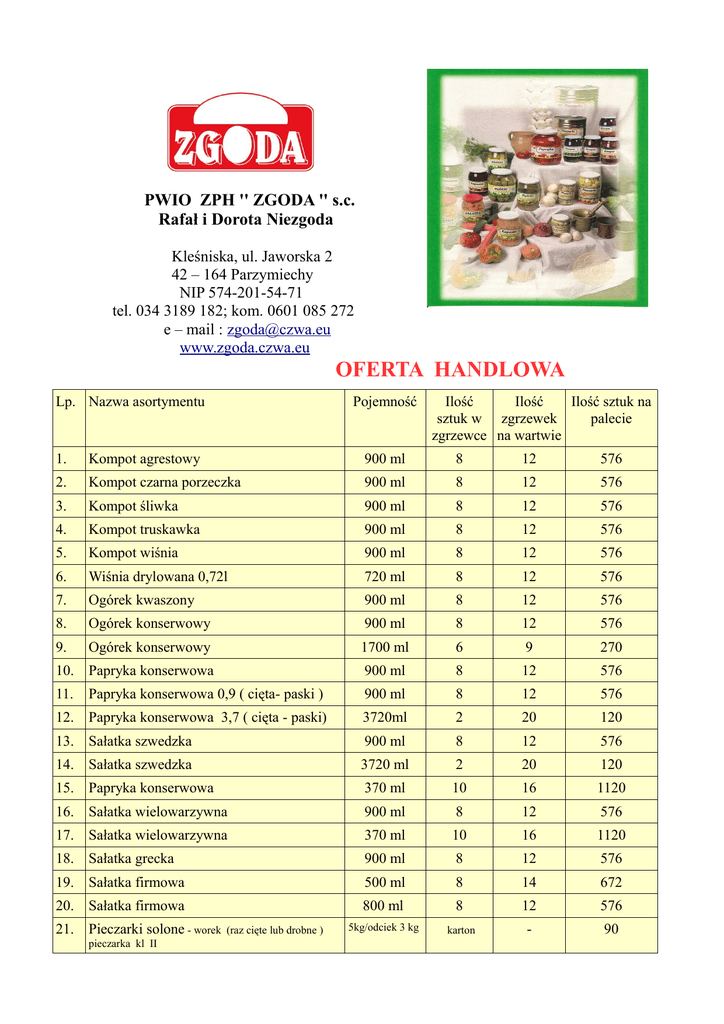 PWIO ZPH '' ZGODA '' s.c. Rafał i Dorota Niezgoda Kleśniska, ul. Jaworska 2 42 – 164 Parzymiechy NIP 574-201-54-71 tel. 034 3189 182; kom. 0601 085 272 e – mail : [email protected] www.zgoda.czwa.eu OFERTA HANDLOWA Lp. Nazwa asortymentu Pojemność Ilość Ilość Ilość sztuk na sztuk w zgrzewek palecie zgrzewce na wartwie 1. Kompot agrestowy 900 ml 8 12 576 2. Kompot czarna porzeczka 900 ml 8 12 576 3. Kompot śliwka 900 ml 8 12 576 4. Kompot truskawka 900 ml 8 12 576 5. Kompot wiśnia 900 ml 8 12 576 6. Wiśnia drylowana 0,72l 720 ml 8 12 576 7. Ogórek kwaszony 900 ml 8 12 576 8. Ogórek konserwowy 900 ml 8 12 576 9. Ogórek konserwowy 1700 ml 6 9 270 10. Papryka konserwowa 900 ml 8 12 576 11. Papryka konserwowa 0,9 ( cięta- paski ) 900 ml 8 12 576 12. Papryka konserwowa 3,7 ( cięta - paski) 3720ml 2 20 120 13. Sałatka szwedzka 900 ml 8 12 576 14. Sałatka szwedzka 3720 ml 2 20 120 15. Papryka konserwowa 370 ml 10 16 1120 16. Sałatka wielowarzywna 900 ml 8 12 576 17. Sałatka wielowarzywna 370 ml 10 16 1120 18. Sałatka grecka 900 ml 8 12 576 19. Sałatka firmowa 500 ml 8 14 672 20. Sałatka firmowa 800 ml 8 12 576 21. Pieczarki solone - worek 5kg/odciek 3 kg karton - 90 pieczarka kl II (raz cięte lub drobne ) 22. Pieczarki solone kl II 900 ml 8 12 576 23. Pieczarki solone kl II 370 ml 10 16 1120 24. Pieczarki marynowane 900 ml 8 12 576 25. Pieczarki marynowane 800 ml 8 12 576 26. Pieczarki marynowane 300 ml 10 16 1120 27. Pieczarki marynowane 320 ml 10 16 1120 28. Pieczarki marynowane całe - worek 5kg/odciek 3 karton - 90 29. Marchew konserwowa kostka 900 ml 8 12 576 30. Marchew konserwowa kostka -puszka 4200 ml 2 - 140 31. Marchew konserwowa kostka/plastry -worek 5 kg/ odciek 3 karton - 90 32. Ziemniak kostka - worek 5 kg/ odciek 3 karton - 90