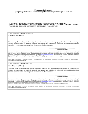 Formularz Zgłoszeniowy propozycji zadania do Szczecińskiego Budżetu Obywatelskiego na 2016 rok 1. KONTAKT DO AUTORA/AUTORÓW PROPOZYCJI ZADANIA (OBOWIĄZKOWE) UWAGA: W PRZYPADKU NIEWYRAŻENIA ZGODY PRZEZ AUTORA/AUTORÓW ZADANIA FORMULARZ ZOSTANIE ODRZUCONY Z PRZYCZYN FORMALNYCH 1.Imię i nazwisko autora Jacek Kowolik Kontakt (e-mail, telefon) Wyrażam zgodę na udostępnienie mojego imienia i nazwiska jako autora propozycji zadania do Szczecińskiego Budżetu Obywatelskiego na 2016 rok na stronie internetowej oraz w Biuletynie Informacji Publicznej Urzędu Miasta Szczecin (www.konsultuj.szczecin.pl oraz bip.um.szczecin.pl/konsultacje). …………………………………………… /własnoręczny podpis/ Dane osobowe zbierane i przetwarzane są na podstawie art. 23 ust. 1 pkt 1 ustawy z dnia 29 sierpnia 1997 r. o ochronie danych osobowych (Dz. U. 2014 r. poz. 1182, z późn. zm.) w celu: przeprowadzenia konsultacji społecznych w ramach Szczecińskiego Budżetu Obywatelskiego na 2016 r., w tym zamieszczanie przesłanego formularza na stronie www.konsultuj.szczecin.pl oraz w Biuletynie Informacji Publicznej, jak również badań opinii i oczekiwań społecznych realizowanych przez Urząd Miasta Szczecin. Właściciel danych osobowych ma prawo wglądu do swoich danych w siedzibie Urzędu Miasta Szczecin oraz ich poprawiania. Dane będą przetwarzane w zbiorze roboczym i zostaną usunięte po zakończeniu konsultacji społecznych dotyczących Szczecińskiego Budżetu Obywatelskiego na 2016 rok. 2.Imię i nazwisko autora Marek Kiesz Kontakt (e-mail, telefon) Wyrażam zgodę na udostępnienie mojego imienia i nazwiska jako autora propozycji zadania do Szczecińskiego Budżetu Obywatelskiego na 2016 rok na stronie internetowej oraz w Biuletynie Informacji Publicznej Urzędu Miasta Szczecin (www.konsultuj.szczecin.pl oraz bip.um.szczecin.pl/konsultacje). …………………………………………… /własnoręczny podpis/ Dane osobowe zbierane i przetwarzane są na podstawie art. 23 ust. 1 pkt 1 ustawy z dnia 29 sierpnia 1997 r. o ochronie danych osobowych (Dz. U. 2014 r. poz. 1182, z późn. zm.) w celu: przeprowadzenia konsultacji społecznych w ramach Szczecińskiego Budżetu Obywatelskiego na 2016 rok, w tym zamieszczanie przesłanego formularza na stronie www.konsultuj.szczecin.pl oraz w Biuletynie Informacji Publicznej, jak również badań opinii i oczekiwań społecznych realizowanych przez Urząd Miasta Szczecin. Właściciel danych osobowych ma prawo wglądu do swoich danych w siedzibie Urzędu Miasta Szczecin oraz ich poprawiania. Dane będą przetwarzane w zbiorze roboczym i zostaną usunięte po zakończeniu konsultacji społecznych dotyczących Szczecińskiego Budżetu Obywatelskiego na 2016 rok. 2. TYTUŁ ZADANIA (OBOWIĄZKOWE) (Należy wpisać pełny tytuł zadania. Tytuł zadania powinien być sformułowany tak, aby jednoznacznie obrazował faktyczne zadanie, które ma być realizowane w ramach Szczecińskiego Budżetu Obywatelskiego na 2016 rok) UWAGA: RUBRYKĘ NALEŻY WYPEŁNIĆ CZYTELNIE WIELKIMI LITERAMI PODANY TYTUŁ ZADANIA BĘDZIE OBOWIĄZYWAŁ NA LIŚCIE DO GŁOSOWANIA P R Z E I C Z E T A K S O S A S P R 3. D M E D Y C Z N E S Z K O L E N I E Ó W K A R Z Y O R A Z Ż E N I E T A K S Ó W E K Z Ę T M E D ( R - 0 P ./ R A T O W N ( K P P ) W Y P W ) CHARAKTER ZADANIA (OBOWIĄZKOWE) (Do Szczecińskiego Budżetu Obywatelskiego można składać propozycje zadań do zrealizowania o charakterze inwestycyjnym, zgodne z kompetencjami Gminy Miasto Szczecin. Zadania mają również charakter dzielnicowy, przez co rozumie się realizację zadania dotyczącego głównie potrzeb mieszkańców jednej dzielnicy Szczecina. W sytuacji jeśli zadanie swoim zasięgiem obejmuje więcej niż obszar jednej dzielnicy o wyborze dzielnicy decyduje autor propozycji zadania) Proszę wybrać wyłącznie jedną z podanych poniżej propozycji Dzielnica Północ Dzielnica Prawobrzeże Dzielnica Śródmieście Dzielnica Zachód 4. Proszę dokonać wyboru stawiając znak „X” w wybranej rubryce X LOKALIZACJA, MIEJSCE REALIZACJI ZADANIA (OBOWIĄZKOWE) (W ramach Szczecińskiego Budżetu Obywatelskiego można składać propozycje zadań zlokalizowane na majątku i w przestrzeni Gminy Miasto Szczecin. Należy określić obszar, na którym realizowane będzie zadanie podając dane umożliwiające przestrzenną lokalizację zadania) ADMINISTRACYJNE GRANICE MIASTA SZCZECINA 5. OPIS ZADANIA (OBOWIĄZKOWE) (Proszę opisać, co dokładnie ma zostać wykonane oraz wskazać główne działania związane z realizacją zadania) SZKOLENIE PRZEDMEDYCZNE TAKSÓWKARZY (PRZEWIDYWANA LICZBA TAKSÓWEK TO 100 SZT.) ZAKUP WYPOSAŻENIA P/MED. TAKSÓWEK ZLECENIE WYKONANIA APLIKACJI DO TELEFONÓW KOMÓRKOWYCH W CELU SZYBKIEGO POŁĄCZENIA Z NUMEREM RATUNKOWYM (112, 999 ) 6. UZASADNIENIE ZADANIA (OBOWIĄZKOWE) (Proszę napisać, jaki jest cel realizacji zadania, jakiego problemu dotyczy i jakie rozwiązania proponuje, a także uzasadnić, dlaczego zadanie powinno być zrealizowane i w jaki sposób jego realizacja wpłynie na życie mieszkańców) W ZWIĄZKU Z ROSNĄCĄ ŚWIADOMOŚCIĄ SPOŁECZNĄ DOTYCZĄCĄ RATOWANIA ZDROWIA I ŻYCIA LUDZKIEGO ORAZ Z WYDŁUŻAJĄCYM SIĘ CZASEM DOTARCIA KARETKI POGOTOWIA RATUNKOWEGO DO POSZKODOWANEGO (ZWŁASZCZA W SZYCZYCIE), PROPONUJEMY JAKO TAKSÓWKARZE PODJĘCIE SIĘ JAKO WOLONTARIUSZE POMOCY W AKCJACH RATUNKOWYCH PRZEDMEDYCZNYCH NA TERENIE MIASTA SZCZECINA. POPRZEZ TO ŻE SZCZECIN JEST ROZLEGŁĄ AGLOMERACJĄ, „ZATŁOCZONYM” MIASTEM KARETKI MAJĄ UTRUDNIONY DOJAZD DO POSZKODOWANYCH. TAKSÓWEK W SZCZECINIE (WSZYSTKICH KORPORACJI PLUS NIE ZRZESZONYCH) JEST OKOŁO 2,5 TYS. PRACA ICH PODZIELONA JEST NA WIELE REJONÓW SZKOLĄC TAKSÓWKARZY NALEŻY ZAŁOŻYĆ, ŻE W KAŻDEJ CHWILI, W KAŻDYM REJONIE ZNAJDUJE SIĘ PO KILKANAŚCIE AUT, NALEŻY RÓWNIEŻ ZAŁOŻYĆ, ŻE PRZYNAJMNIEJ 1-2 SZTUKI Z NICH TO BĘDĄ RATOWNICY PRZEDMEDYCZNI (BEZ WZGLĘDU NA PRZYNALEŻNOŚĆ KORPORAC