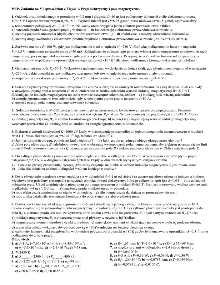 WIP. Zadania na VI sprawdzian z Fizyki 1. Prąd elektryczny i pole