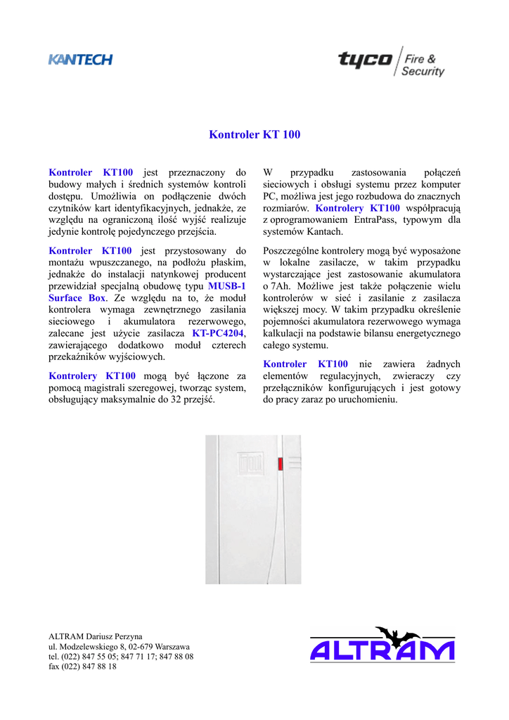 Kontroler KT 100 Kontroler KT100 jest przeznaczony do budowy małych i średnich systemów kontroli dostępu. Umożliwia on podłączenie dwóch czytników kart identyfikacyjnych, jednakże, ze względu na ograniczoną ilość wyjść realizuje jedynie kontrolę pojedynczego przejścia. W przypadku zastosowania połączeń sieciowych i obsługi systemu przez komputer PC, możliwa jest jego rozbudowa do znacznych rozmiarów. Kontrolery KT100 współpracują z oprogramowaniem EntraPass, typowym dla systemów Kantach. Kontroler KT100 jest przystosowany do montażu wpuszczanego, na podłożu płaskim, jednakże do instalacji natynkowej producent przewidział specjalną obudowę typu MUSB-1 Surface Box. Ze względu na to, że moduł kontrolera wymaga zewnętrznego zasilania sieciowego i akumulatora rezerwowego, zalecane jest użycie zasilacza KT-PC4204, zawierającego dodatkowo moduł czterech przekaźników wyjściowych. Poszczególne kontrolery mogą być wyposażone w lokalne zasilacze, w takim przypadku wystarczające jest zastosowanie akumulatora o 7Ah. Możliwe jest także połączenie wielu kontrolerów w sieć i zasilanie z zasilacza większej mocy. W takim przypadku określenie pojemności akumulatora rezerwowego wymaga kalkulacji na podstawie bilansu energetycznego całego systemu. Kontrolery KT100 mogą być łączone za pomocą magistrali szeregowej, tworząc system, obsługujący maksymalnie do 32 przejść. ALTRAM Dariusz Perzyna ul. Modzelewskiego 8, 02-679 Warszawa tel. (022) 847 55 05; 847 71 17; 847 88 08 fax (022) 847 88 18 Kontroler KT100 nie zawiera żadnych elementów regulacyjnych, zwieraczy czy przełączników konfigurujących i jest gotowy do pracy zaraz po uruchomieniu. Kontroler KT 300EU Kontroler KT 300 umożliwia podłączenie dwóch czytników kart identyfikacyjnych i realizuje dwustronną kontrolę jednego przejścia lub jednostronną kontrolę dwóch przejść. Kupując kontroler wersji EU otrzymasz kompletne urządzenie, na które składa się metalowa obudowa, zawierającą płytkę KT300PCB, transformator sieciowy o mocy 100W ● ● Wewnątrz obudowy przewidziano miejsce do zainstalowania jednego modułu rozszerzenia oraz akumulatora o pojemności 17Ah. Kontroler KT-300 nie zawiera żadnych elementów regulacyjnych, zwór czy przełączników konfigurujących i jest gotowy do pracy zaraz po uruchomieniu. Podstawowe właściwości kontrolera KT 300 Kontroler w wersji KT-300EU-8k zlikwidowane zostały ograniczenia we pozwala na obsługę 8000 użytkowników wzajemnych odległościach pomiędzy obsługiwanymi obiektami Kontroler w wersji KT-300EU-56k pozwala na obsługę 56000 użytkowników ● Poszczególne kontrolery wchodzące w skład systemu łączy się za pośrednictwem magistrali RS-485 ● Działanie systemu może być nadzorowane za pośrednictwem oprogramowania EntraPass ● W zależności od rodzaju użytego oprogramowania system może kontrolować do miliona przejść ● Kontrolery KT-300 pozwalają na instalację dodatkowych modułów rozszerzenia, realizując tym samym funkcje, wykraczające poza standardową kontrolę dostępu ● oraz dodatkowy moduł zasilacza, z dwoma wyjściami o obciążalności 500mA każde. Dzięki możliwości sterowania kontrolerów poprzez sieci rozległe, ALTRAM Dariusz Perzyna ul. Modzelewskiego 8, 02-679 Warszawa tel. (022) 847 55 05; 847 71 17; 847 88 08 fax (022) 847 88 18 ● W systemach opartych na kontrolerach KT-300 możliwe jest użycie czytników i kart identyfikacyjnych pracujących w różnych standardach (w tym czytników biometrycznych) ● Oprogramowanie systemowe kontrolerów może być w łatwy aktualizowane ● Stan akumulatora rezerwowego jest monitorowany w sposób ciągły i w przypadku jego rozładowania lub odłączenia generowane są komunikaty systemowe „rozładowany akumulator” lub „brak akumulatora” Zastosowanie transformatora sieciowego o mocy 100W oraz wewnętrznego zasilacza obciążalności 2x0,5A uwalnia instalatora od konieczności stosowania zewnętrznych zasilaczy dla zwór lub rygli drzwiowych. ● Dane techniczne KT-100 KT-300 Liczba portów czytników 2 2 Liczba obsługiwanych drzwi 1 2 9,5Vdc ... 14Vdc (max 750mA) 16Vac (z transformatora) Zasilanie rezerwowe realizowane przez zasilacz Akumulator 12V 7Ah Wymiary zewnętrzne 114 x 70 x 30 (mm) 390 x 340 x 90 (mm) 110g 5,2kg (wraz z obudową) Zasilanie główne Ciężar 0 2 C ... 40 C 20C ... 400C Dopuszczalna wilgotność wzgl. 0 ... 95% (bez kondensacji) 0 ... 95% (bez kondensacji) Wejścia 4 zwierno – rozwierne lub parametryczne 9 zwierno – rozwiernych lub parametrycznych max. długość 600m dla przewodu 0,35mm2 max. długość 600m dla przewodu 0,35mm2 Wyjścia typu „open collector” połączone z masą układu 2 wyjścia o obciążalności 12V/25mA każde 2 wyjścia o obciążalności 12V/25mA każde Wyjścia przekaźnikowe, izolowane optycznie 2 wyjścia o obciążalności 30Vac/dc/50mA każde brak Wyjścia do sterowania rygli i zwór elektromagnetycznych 2 wyjścia o obciążalności 12Vdc/250mA, izolowane (zasilanie rygli ze źródła zewnętrznego) 2 wyjścia o obciążalności 12Vdc/500mA, nadzorowane (zasilanie rygli z wewnętrznego transformatora i zasilacza) Zakres temperatur pracy Okablowanie wejść Wyjścia dodatkowe (do sterowania diod LED i sygnalizatorów akustycznych 0 2 wyjścia typu „open collector” 4 wyjścia typu „open collector” do sygnalizacji stanu przejścia, obciążalność 12Vdc/25mA obciąż. 12Vdc/25mA każde każde Zasilanie czytników ALTRAM Dariusz Perzyna ul. Modzelewskiego 8, 02-679 Warszawa tel. (022) 847 55 05; 847 71 17; 847 88 08 fax (022) 847 88 18 5Vdc/150mA z zabezpieczeniem 12Vdc lub 5Vdc/175mA (razem) z zabezpieczeniem, nadzorowane Dane techniczne (c.d.) KT-100 KT-300 RS-485 RS-232, RS-485 i ComBus Prędkość transmisji Baud Rate od 1200 do 115000 z detekcją automatyczną Baud Rate od 1200 do 115000 z detekcją automatyczną Oprogramowanie systemowe pamię