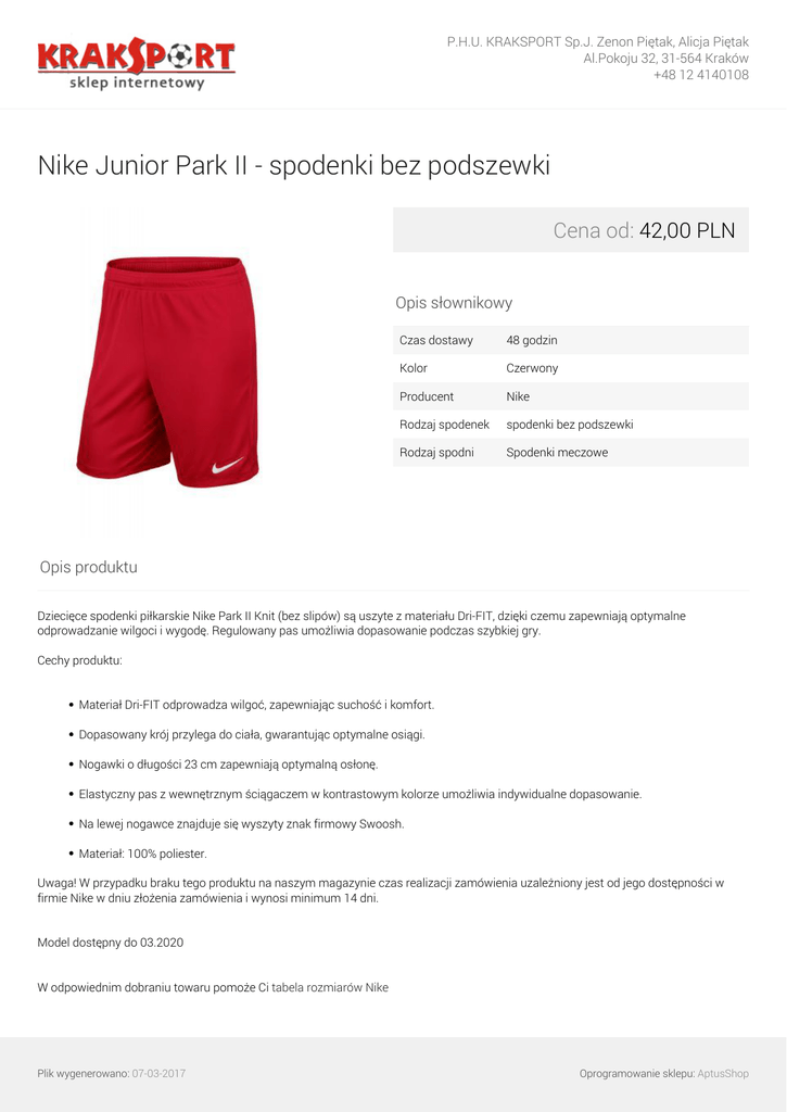 P.H.U. KRAKSPORT Sp.J. Zenon Piętak, Alicja Piętak Al.Pokoju 32, 31-564 Kraków +48 12 4140108 Nike Junior Park II - spodenki bez podszewki Cena od: 42,00 PLN Opis słownikowy Czas dostawy 48 godzin Kolor Czerwony Producent Nike Rodzaj spodenek spodenki bez podszewki Rodzaj spodni Spodenki meczowe Opis produktu Dziecięce spodenki piłkarskie Nike Park II Knit (bez slipów) są uszyte z materiału Dri-FIT, dzięki czemu zapewniają optymalne odprowadzanie wilgoci i wygodę. Regulowany pas umożliwia dopasowanie podczas szybkiej gry. Cechy produktu: Materiał Dri-FIT odprowadza wilgoć, zapewniając suchość i komfort. Dopasowany krój przylega do ciała, gwarantując optymalne osiągi. Nogawki o długości 23 cm zapewniają optymalną osłonę. Elastyczny pas z wewnętrznym ściągaczem w kontrastowym kolorze umożliwia indywidualne dopasowanie. Na lewej nogawce znajduje się wyszyty znak firmowy Swoosh. Materiał: 100% poliester. Uwaga! W przypadku braku tego produktu na naszym magazynie czas realizacji zamówienia uzależniony jest od jego dostępności w firmie Nike w dniu złożenia zamówienia i wynosi minimum 14 dni. Model dostępny do 03.2020 W odpowiednim dobraniu towaru pomoże Ci tabela rozmiarów Nike Plik wygenerowano: 07-03-2017 Oprogramowanie sklepu: AptusShop P.H.U. KRAKSPORT Sp.J. Zenon Piętak, Alicja Piętak Al.Pokoju 32, 31-564 Kraków +48 12 4140108 Warianty produktu Plik wygenerowano: 07-03-2017 XS 42,00 PLN S 42,00 PLN M 42,00 PLN L 42,00 PLN XL 42,00 PLN Oprogramowanie sklepu: AptusShop P.H.U. KRAKSPORT Sp.J. Zenon Piętak, Alicja Piętak Al.Pokoju 32, 31-564 Kraków +48 12 4140108 Galeria Plik wygenerowano: 07-03-2017 Powered by TCPDF (www.tcpdf.org) Oprogramowanie sklepu: AptusShop