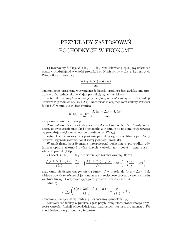 PRZYK×ADY ZASTOSOWAŃ POCHODNYCH W EKONOMII 1) Rozwaz·my funkcje¾ K : R+ ! R+ róz·niczkowalna¾ opisujac ¾ a¾ zalez·ność kosztów produkcji od wielkości produkcji x. Niech x0 , x0 + x 2 R+ , x > 0. Wtedy iloraz róz·nicowy K (x0 + x) x K (x0 ) oznacza koszt przecietny ¾ wytworzenia jednostki produktu jeśli zwiekszymy ¾ produkcje¾ o x jednostek, uwaz·ajac ¾ produkcje¾ x0 za wyjściowa. ¾ Zatem iloraz powyz·szy obrazuje przecietn ¾ a¾predkość ¾ zmiany wartości funkcji kosztów w przedziale hx0 ; x0 + xi. Natomiast miara¾predkości ¾ zmiany wartości funkcji K w punkcie x0 jest granica K 0 (x0 ) = lim K (x0 + x !0 x) x K (x0 ) nazywana kosztem kra´ncowym. Poniewaz· K K 0 (x0 ) x, wiec ¾ dla x = 1 mamy K K 0 (x0 ), co oznacza, z·e zwiekszenie ¾ produkcji o jednostk¾ e w stosunku do poziomu wyjściowego x0 powoduje zwiekszenie ¾ kosztów produkcji o K 0 (x0 ). Zatem koszt krańcowy przy poziomie produkcji x0 , w przybliz·eniu jest równy kosztowi wyprodukowania dodatkowej jednostki produktu. W analogiczny sposób moz·na interpretować pochodna¾ w przypadku, gdy funkcja opisuje zalez·ność dwóch innych wielkości np. popyt - cena, zysk wielkość produkcji itp. 2) Niech f : R+ ! R+ bedzie ¾ funkcja¾ róz·niczkowalna. ¾ Iloraz f (x + x x) f (x) : = f (x) x f (x + x) f (x) 100% f (x) : x 100% x nazywamy elastyczno´scia¾ przecietn ¾ a¾ funkcji f w przedziale hx; x + xi. Jak widać z powyz·szej równości jest ona miara¾przecietnego ¾ procentowego przyrostu wartości funkcji f odpowiadajacego ¾ przyrostowi wartości x o 1%. Granice¾ lim x !0 f (x + x) f (x) x : f (x) x = x f 0 (x) f (x) nazywamy elastyczno´scia¾ funkcji f i oznaczamy symbolem Ex f . Elastyczność funkcji w punkcie x jest przybliz·ona¾ miara¾ procentowego przyrostu wartości funkcji odpowiadajacego ¾ przyrostowi wartości argumentu o 1% w odniesieniu do poziomu wyjściowego x. 1 Niech K oznacza funkcje¾ kosztu ca÷kowitego produkcji jednorodnej. Wtedy elastyczność kosztu, czyli Ex K = x K 0 (x) , K (x) określa w przybliz·eniu przyrost kosztu odpowiadajacy ¾ zwiekszeniu ¾ produkcji o 1% od poziomu wyjściowego x. Analogicznie moz·na interpretować elastyczność popytu ze wzgledu ¾ na cene, ¾ elastyczność popytu ze wzgledu ¾ na dochód itp. Przyk÷ ad Wyznaczyć elastyczność popytu f (x) = 2 4 x , gdzie x jest cena¾ produktu. Przy jakiej cenie elastyczność popytu wzgledem ¾ ceny równa sie¾ 21 ? Aby wyznaczyć elastyczność, musimy obliczyć pochodna¾ funkcji f . Mamy f 0 (x) = 2 4 x ( 1) ln 4 = 2 4 x ln 4. Stad ¾ elastyczność funkcji f wynosi Ex f = x x f 0 (x) = f (x) 2 4 x 2 4 x ln 4 = x ln 4. Aby rozwiazać ¾ druga¾ cześć ¾ zadania, musimy rozwiazać ¾ równanie Ex f = 1 , 2 czyli x ln 4 = 1 . 2 Stad ¾ otrzymujemy x= 1 . 2 ln 4 1 1 Zatem przy cenie wynoszacej ¾ 2 ln 4 elastyczność popytu wynosi 2 , czyli inaczej 1 1 przy cenie 2 ln 4 wzrost ceny o 1% spowoduje spadek popytu o 2 %. 3) Dzia÷ekonomii wykorzystujacy ¾ jako swoja¾metode¾ badanie zjawisk ekonomicznych za pomoca¾ badania przebiegu zmienności funkcji nosi nazw¾ e programowania marginalnego. Przyk÷ ad. Przypuśćmy, z·e przedsiebiorstwo ¾ wytwarza tylko jeden produkt i ca÷ a ilość wytworzonego produktu jest sprzedawana. Niech x oznacza wielkość produkcji, a R (x), K (x) odpowiednio dochód ze sprzedaz·y i koszt wytworzenia x jednostek produktu. Zak÷ adamy, z·e funkcje R i K sa¾ dwukrotnie róz·niczkowalne. Zysk otrzymany ze sprzedaz·y x jednostek produktu wynosi Z (x) = R (x) K (x) , x 2 h0; 1) . Chcac ¾ racjonalnie gospodarować przedsiebiorstwo ¾ podejmuje decyzje¾ wyprodukowania takiej ilości x0 produktu, przy której zysk bedzie ¾ maksymalny, tzn. dla której Z 0 (x0 ) = R0 (x0 ) K 0 (x0 ) = 0 2 i Z 00 (x0 ) = R00 (x0 ) K 00 (x0 ) < 0, albo zamiast tego drugiego warunku zaz·adamy, ¾ by Z 0 zmienia÷a znak w punkcie x0 z dodatniego na ujemny. Analogicznie moz·na rozwiazywać ¾ inne zagadnienia ekonomiczne pod warunkiem, z·e funkcje opisujace ¾ te problemy sa¾róz·niczkowalne. Zadanie. Funkcja kosztu ca÷kowitego jednorodnej produkcji ma postać Kc (x) = 4x4 9x3 30x2 + 75x, gdzie x > 0 oznacza wielkość produkcji. Zbadać przy jakiej wielkości produkcji koszt wyprodukowania jednostki produktu (koszt jednostkowy) bedzie ¾ najmniejszy i ile bedzie ¾ wtedy wynosi÷ . Rozwiazanie. ¾ Zauwaz·my, z·e koszt jednostkowy wyraz·a sie¾ wzorem: Kj (x) = 4x4 Kc (x) = x 9x3 30x2 + 75x x = 4x3 9x2 30x + 75. Jest to funkcja róz·niczkowalna, bo wielomianowa. Obliczamy jej pochodna¾ Kj0 (x) = 12x2 18x 30. Wyznaczamy miejsca zerowe pochodnej 12x2 18x 30 = 0j : 6 2x2 3x 5 = 0. ×atwo obliczyć pierwiastki: x = ajac ¾ dziedzine¾ mamy 1 lub x = 52 . Zauwaz·my dalej, z·e uwzgledni¾ 5 2 Kj0 (x) > 0 () x> Kj0 (x) < 0 () 0<x< 5 2 . Zatem pochodna funkcji Kj zmienia znak w swoim miejscu zerowym x = 52 z ujemnego na dodatni, wiec ¾ ma w tym punkcie minimum lokalne. Przy tym ¾ funkcja ta w przedziale 0; 52 maleje, zaś w przedziale 52 ; 1 — rośnie. Stad ¾ Podsumowujac, ¾ koszt jednosw punkcie x = 25 przyjmuje wartość najmniejsza. tkowy jest najmniejszy przy wielkości produkcji x = 52 i ten najmniejszy koszt jednostkowy wynosi Kj 5 2 5 2 125 2 = 4 = 3 2 9 225 4 3 5 30 2 75 + 75 = 2 5 + 75 2 175 = 43; 75. 4