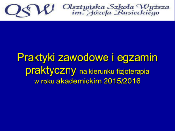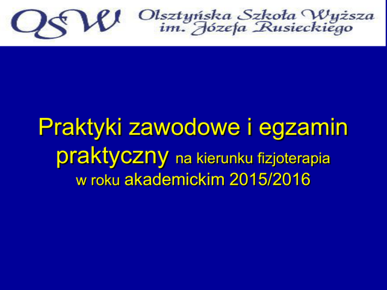 Praktyki zawodowe i egzamin praktyczny na kierunku fizjoterapia w roku akademickim 2015/2016 Praktyki zawodowe na kierunku FIZJOTERAPIA Studia licencjackie 920 godzin + Studia magisterskie 600 godzin Liczba godzin praktyk zgodna z zaleceniami Światowej Konfederacji Fizjoterapii (World Confederation of Physical Therapy – WCPT) Grupa oceniająca praktyki Liczba ocenianych placówek Liczba opinii studentów Studia licencjackie stacjonarne - III rok 11 103 Studia licencjackie niestacjonarne - III rok 17 51 Studia magisterskie niestacjonarne - II rok 20 55 Łącznie 48 209 W jakim stopniu zajęcia kładły nacisk na powiązanie wiedzy teoretycznej z zakresu kinezyterapii z praktyką? W jakim stopniu zajęcia kładły nacisk na powiązanie wiedzy teoretycznej z zakresu fizykoterapii z praktyką? Czy uważasz, że zajęcia były prowadzone profesjonalnie? Jak oceniasz przydatność w praktyce uzyskanej wiedzy w czasie praktyki? Wojewódzki Szpital Specjalistyczny w Olsztynie (Ortopedia + Rehabilitacja) 5,0 3,2 5,5 4,7 SP Zakład Opieki Zdrowotnej MSW z Warm.-Maz. Centrum Onkologii w Olsztynie (ZUL + Ortopedia) 5,2 4,5 5,5 4,4 Miejski Szpital Zespolony w Olsztynie 4,0 4,2 3,4 3,2 Specjalistyczny Szpital Dziecięcy im. Prof. S. Popowskiego w Olsztynie 3,7 4,4 3,6 3,8 4,95 4,3 5,2 4,2 4,0 6,0 0 3,5 3,0 6,0 4,5 6,0 Placówka Porównanie z rokiem 2015/2016 Szpital Uniwersytecki w Olsztynie (Odd. Rehab. Neurolog + Oddz. Dz. Rehab. Kardiolog.) Biernat Rehabilitacja i Sport Centrum Postawy Ciała (Skala od 0 do 6) Ocena ogólna placówek w latach 2013-2016 Placówka 2013 2014 2015 2016 Wojewódzki Szpital Specjalistyczny w Olsztynie 4,1 4,4 4,6 4,6 SP Zakład Opieki Zdrowotnej MSW z Warm.-Maz. Centrum Onkologii w Olsztynie 3,9 4,4 4,5 4,9 Miejski Szpital Zespolony w Olsztynie 5,1 5,2 4,8 3,9 Specjalistyczny Szpital Dziecięcy im. Prof. S. Popowskiego w Olsztynie 4,3 4,4 4,5 3,9 Szpital Uniwersytecki w Olsztynie 4,8 4,8 4,7 4,7 Biernat Rehabilitacja i Sport 3,7 4,6 3,8 5,8 4,8 5,5 2,9 5,4 Centrum Postawy Ciała Kwestionariusz ankiety – studia magisterskie II rok Czy w każdym dniu praktyki miałeś/aś możliwość zadawania pytań osobie prowadzącej praktykę? 100% Czy personel placówki chętnie dzielił się z Tobą wiedzą i doświadczeniem zawodowym? 100% Czy atmosfera panująca w miejscu odbywania praktyki jest przyjazna studentom? 98% Czy miałeś/aś możliwości skracania czasu pracy bez odrabiania go? (jeżeli tak, to o ile?) Sporadycznie – tak 5% Czy napotkałeś/aś jakieś trudności w czasie praktyki? (jeżeli tak, to jakie?) Nie – 96% Jak oceniasz wiedzę zdobytą na praktyce w zakresie organizacji placówki prowadzącej działalność fizjoterapeutyczną (Skala od 0 do 6)? Czy znasz organizacje, instytucje, z którymi można podjąć współpracę w zakresie działań na rzecz osób niepełnosprawnych? (jeśli tak, to jakie?) 5,2 FAR, PFRON, W jakiej formie sprawdzana była wiedza i umiejętności zdobyte na praktyce? ustnie, praktycznie, pisemnie, test, obserwacja Brak – 9 osób Jak oceniasz przydatność wiedzy i umiejętności praktycznych zdobytych w czasie praktyki? (Skala od 0 do 6) 4,45 Czy potrafiłbyś/potrafiłabyś zorganizować miejsce pracy dla fizjoterapeutów? Tak - 96% Czy praktyka może pozytywnie wpłynąć na decyzję o podjęciu własnej działalności gospodarczej (np. otwarcie własnego gabinetu)? Tak – 78% Czy poleciłbyś/poleciłabyś placówkę innym studentom? Tak – 96% Egzamin praktyczny Studia stacjonarne 33 osoby Studia niestacjonarne 61 osób Egzamin kliniczny Przystąpiło Przystąpiły 30 osób 52 osoby Zdało Zdało 29 osób 50 osób Średnia 4,05 Średnia 3,81 (2014/2015 – 3,90) Średnia ogólna 3,93 (2014/2015 - 4,01) Egzamin praktyczny Oceny bardzo dobry dobry plus dobry dostateczny plus dostateczny niedostateczny liczba 15 17 19 12 12 7 Egzamin praktyczny Placówka Uniwersytecki Szpital Kliniczny Wojewódzki Szpital Specjalistyczny Dziecięcy Miejski Szpital Zespolony SP ZOZ MSW z WMCO Centrum Postawy Ciała OSW Liczba zdających Oceny ndst Średnia ocen 29 3 3,84 16 3 3,59 5 1 3,5 23 - 4,26 9 - 3,89