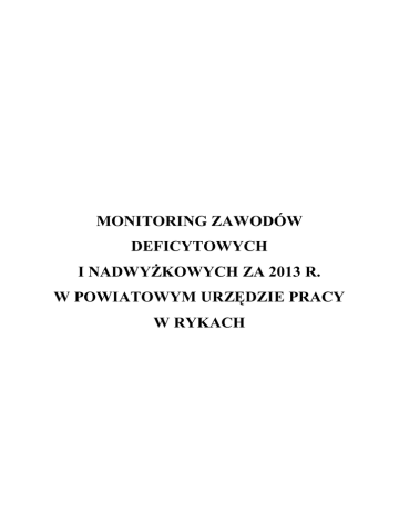 MONITORING ZAWODÓW DEFICYTOWYCH I NADWYŻKOWYCH ZA 2013 R. W POWIATOWYM URZĘDZIE PRACY W RYKACH 1. Wstęp Powszechność bezrobocia i jego skutki powodują konieczność ciągłego monitoringu rynku pracy i procesów na nim zachodzących oraz opracowywania analiz, umożliwiających skuteczniejszą realizację zasadniczych celów i zadań polityki społecznej w powiecie ryckim. Dla stworzenia dokładniejszego obrazu osób bezrobotnych oraz możliwości ich zatrudnienia, niezbędna jest analiza danych dotyczących charakterystyki i struktury bezrobotnych, w zestawieniu ze zgłaszanymi ofertami pracy i wymaganiami stawianymi przez pracodawców. Celem niniejszego opracowania jest przedstawienie sytuacji w powiecie ryckim pod kątem zawodów deficytowych i nadwyżkowych w oparciu o zestawienia przygotowane przez Ministerstwo Pracy i Polityki Społecznej oraz dane statystyczne Powiatowego Urzędu Pracy w Rykach. W praktycznej działalności instytucji rynku pracy, analiza zawodów deficytowych i nadwyżkowych może posłużyć jako dodatkowe źródło danych w celu: • dostosowania kształcenia zawodowego do potrzeb rynku pracy; • określania zgodnych z zapotrzebowaniem rynku pracy kierunków szkoleń dla osób bezrobotnych i innych uprawnionych; • ułatwiania realizacji programów specjalnych dla osób bezrobotnych; • prowadzenia racjonalnej i zgodnej z realiami rynku pracy gospodarki środkami Funduszu Pracy, pozostającymi w dyspozycji samorządu powiatu; • planowania i koordynacji działań przez instytucje i organizacje współpracujące na lokalnym rynku pracy w zakresie przeciwdziałania bezrobociu; • podnoszenia jakości poradnictwa zawodowego, poprzez bieżące wskazywanie doradcom zawodowym charakterystyki pracowników poszukiwanych na lokalnym rynku pracy; • usprawniania pośrednictwa pracy, poprzez uzyskanie bieżących informacji o planach zatrudnieniowych pracodawców; • podniesienia świadomości przedstawicieli instytucji zajmujących się rynkiem pracy i rynkiem edukacyjnym o konieczności prowadzenia zintegrowanych działań na rzecz dostosowania systemu kształcenia do potrzeb rynku pracy. Opracowywanie analiz rynku pracy, w tym prowadzenie monitoringu zawodów deficytowych i nadwyżkowych, jest jednym z zadań samorządu powiatowego, w zakresie polityki rynku pracy, wynikającym z zapisów ustawy z dnia 20 kwietnia 2004 r. o promocji zatrudnienia i instytucjach rynku pracy. 2 Monitoring sporządzony jest w oparciu o „Zalecenia metodyczne do prowadzenia monitoringu zawodów deficytowych i nadwyżkowych”. Zakres tematyczny monitoringu dotyczy grup zawodowych oraz zawodów i specjalności określonych w Rozporządzeniu Ministra Pracy i Polityki Społecznej z dnia 27 kwietnia 2010 r. w sprawie klasyfikacji zawodów i specjalności na potrzeby rynku pracy oraz zakresu jej stosowania. 2. Analiza bezrobotnych i ofert pracy wg zawodów Liczba osób bezrobotnych na przestrzeni ostatnich 3 lat (2011–2013) wykazuje trend wzrostowy. Według stanu na koniec 2013 r. w ewidencji bezrobotnych Powiatowego Urzędu Pracy w Rykach pozostawało 3476 osób, tj. odpowiednio o 26,4% więcej niż w 2011 oraz o 8,8% więcej niż w 2012 roku. Liczba zarejestrowanych kobiet wzrosła w latach 2011 – 2013 o 200 osób, tj. 14,5%, zaś liczba bezrobotnych mężczyzn o 525 osób (38,3%) [patrz tabela 1]. Tabela 1 Zmiana liczby osób bezrobotnych w latach 2011 – 2013 lata / płeć 2011 zmiana 2011-2012 w% 9,8 2012 zmiana 2012-2013 2013 kobiety 1381 w liczbach 135 1516 w liczbach 65 w% 4,3 1581 mężczyźni 1370 308 22,5 1678 217 12,9 1895 ogółem 2751 443 16,1 3194 282 8,8 3476 W roku 2013 z rejestru PUP ubyło 3692 osoby, dla porównania w roku 2012 ubyła podobna liczba osób - 3618. Natomiast napływ bezrobotnych w 2013 roku wyniósł 3974 osoby, zaś w roku 2012 zarejestrowało się 4061 osób. Według stanu na koniec 2013 r., w ewidencji osób bezrobotnych największą grupę liczącą 538 osób (15,5% ogółu) stanowiły osoby „bez zawodu”. Około 46% tej grupy stanowiły kobiety, zaś 6,3% osoby bezrobotne zarejestrowane powyżej 12 miesięcy [tabela2]. 3 Tabela 2 Liczba osób bezrobotnych ze względu na posiadany zawód L.p 1 2 3 4 5 6 7 8 9 10 11 12 13 14 15 16 17 18 19 20 21 22 23 24 25 26 27 28 29 30 31 32 33 34 35 36 37 38 39 40 41 42 43 Kod zawodu "000000" "235107" "242217" "261906" "263102" "311204" "311504" "311512" "311924" "314207" "322002" "331402" "331403" "334306" "351203" "411004" "422402" "432103" "512001" "512002" "513101" "514101" "515303" "522301" "522305" "523002" "541390" "611104" "711202" "711402" "712601" "712904" "713102" "722204" "722314" "723103" "723105" "751201" "751204" "752205" "753105" "753303" "816029" 44 "833203" 45 "834103" 46 "911202" 47 "911207" Nazwa zawodu Bez zawodu Pedagog Specjalista administracji publicznej Prawnik legislator Ekonomista Technik budownictwa* Technik mechanik* Technik mechanizacji rolnictwa* Technik technologii odzieży* Technik rolnik* Technik żywienia i gospodarstwa domowego* Technik agrobiznesu* Technik ekonomista* Technik administracji* Technik informatyk* Technik prac biurowych* Technik hotelarstwa* Magazynier Kucharz* Kucharz małej gastronomii* Kelner* Fryzjer* Robotnik gospodarczy Sprzedawca* Technik handlowiec* Kasjer handlowy Pozostali pracownicy ochrony osób i mienia Rolnik upraw polowych Murarz* Betoniarz - zbrojarz* Hydraulik Technolog robót wykończeniowych w budownictwie* Malarz budowlany Ślusarz* Tokarz w metalu Mechanik pojazdów samochodowych* Mechanik samochodów osobowych Cukiernik* Piekarz* Stolarz* Krawiec* Szwaczka Operator urządzeń przetwórstwa owocowowarzywnego Kierowca samochodu ciężarowego Mechanik - operator pojazdów i maszyn rolniczych* Palacz pieców zwykłych Sprzątaczka biurowa Bezrobotni Bezrobotne ogółem kobiety Bezrobotni powyżej 12 miesięcy ogółem w tym kobiety 34 14 8 7 5 3 1 0 3 3 30 8 23 0 9 0 14 14 16 9 7 6 7 4 23 20 4 4 1 0 18 14 4 4 14 4 24 19 13 11 5 5 6 