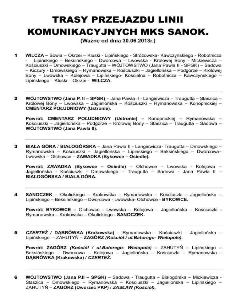 TRASY PRZEJAZDU LINII KOMUNIKACYJNYCH MKS SANOK. (Ważne od dnia 30.06.2013r.) 1 WILCZA – Sowia – Okrzei – Kluski - Lipińskiego - Stróżowska- Kawczyńskiego - Robotnicza - Lipińskiego – Beksińskiego - Dworcowa – Lwowska - Królowej Bony - Mickiewicza – Kościuszki – Dmowskiego – Traugutta – WÓJTOWSTWO (Jana Pawła II - SPGK) – Sadowa – Kiczury - Dmowskiego – Rymanowska – Kościuszki – Jagiellońska – Podgórze – Królowej Bony – Lwowska – Kolejowa – Lipińskiego- Kościelna – Robotnicza – Kawczyńskiego – Lipińskiego – Kluski – Okrzei - WILCZA. 2 WÓJTOWSTWO (Jana P. II – SPGK) – Jana Pawła II - Langiewicza – Traugutta – Staszica – Królowej Bony – Lwowska – Jagiellońska – Kościuszki – Rymanowska – Konopnickiej – CMENTARZ POŁUDNIOWY (Ustronie). Powrót: CMENTARZ POŁUDNIOWY (Ustronie) – Konopnickiej – Rymanowska – Kościuszki – Jagiellońska – Podgórze – Królowej Bony – Staszica – Traugutta – Sadowa – WÓJTOWSTWO (Jana Pawła II). 3 BIAŁA GÓRA / BIAŁOGÓRSKA – Jana Pawła II - Langiewicza- Traugutta – Dmowskiego – Rymanowska – Kościuszki – Jagiellońska – Lipińskiego – Beksińskiego – Dworcowa– Lwowska – Olchowce – ZAWADKA (Bykowce – Osiedle). Powrót: ZAWADKA (Bykowce – Osiedle) – Olchowce – Lwowska - Kolejowa – Jagiellońska - Kościuszki - Dmowskiego – Traugutta – Sadowa - Jana Pawła II – BIAŁOGÓRSKA / BIAŁA GÓRA. 4 SANOCZEK – Okulickiego – Krakowska – Rymanowska – Kościuszki – Jagiellońska – Lipińskiego – Beksińskiego – Dworcowa - Lwowska- Olchowce - BYKOWCE. Powrót: BYKOWCE – Olchowce - Lwowska – Kolejowa – Jagiellońska – Kościuszki Rymanowska – Krakowska – Okulickiego - SANOCZEK. 5 CZERTEŻ / DĄBRÓWKA (Krakowska) – Rymanowska – Kościuszki – Jagiellońska – Lipińskiego – ZAHUTYŃ – ZAGÓRZ (Kościół / ul.Batorego- Wielopole). Powrót: ZAGÓRZ (Kościół / ul.Batorego- Wielopole) – ZAHUTYŃ – Lipińskiego – Beksińskiego – Dworcowa – Kolejowa – Jagiellońska – Kościuszki – Rymanowska DĄBRÓWKA (Krakowska) / CZERTEŻ. 6 WÓJTOWSTWO (Jana P.II – SPGK) – Sadowa - Traugutta – Białogórska – Mickiewicza Staszica – Dmowskiego – Rymanowska – Kościuszki – Jagiellońska – Lipińskiego – ZAHUTYŃ – ZAGÓRZ (Dworzec PKP) / ZASŁAW (Kościół). Powrót: ZASŁAW (Kościół) / ZAGÓRZ (Dworzec PKP) – ZAHUTYŃ – Lipińskiego – Beksińskiego - Dworcowa- Kolejowa – Jagiellońska – Kościuszki – Rymanowska Dmowskiego – Staszica – Mickiewicza – Białogórska - Traugutta – Sadowa – WÓJTOWSTWO (Jana Pawła II). 7 WÓJTOWSTWO (Jana P.II – SPGK) – Gorazdowskiego - Sadowa - Jana Pawła II – Langiewicza – Traugutta – Staszica - Mickiewicza – Kościuszki – Sienkiewicza – Głowackiego - 800-Lecia – Stawiska – Warzywna – Stawiska - Jezierskiego – Konarskiego – Jagiellońska – Lipińskiego – Kościelna – Robotnicza – Kawczyńskiego - STRÓŻOWSKA. Powrót: STRÓŻOWSKA – Kawczyńskiego – Robotnicza - Lipińskiego – Beksińskiego – Dworcowa – Kolejowa – Jagiellońska – Konarskiego – Jezierskiego – Stawiska – Warzywna – Stawiska - 800-lecia – Głowackiego – Sienkiewicza – Kościuszki – Grzegorza – Piłsudskiego – Mickiewicza – Staszica – Traugutta – Sadowa – Gorazdowskiego – WÓJTOWSTWO (Jana Pawła II). 8 ZABŁOTCE / DĄBRÓWKA (Krakowska) – Rymanowska – Kościuszki – Jagiellońska – Podgórze – Królowej Bony – Lwowska – Kolejowa – Lipińskiego – ZAHUTYŃ (Szkoła). Powrót: ZAHUTYŃ (Szkoła) – Lipińskiego – Beksińskiego – Dworcowa – Kolejowa – Jagiellońska – Kościuszki – Rymanowska - DĄBRÓWKA (Krakowska) / ZABŁOTCE. 9 WÓJTOWSTWO (Jana P.II – SPGK) – Langiewicza - Traugutta – Dmowskiego – Rymanowska – DĄBRÓWKA (Krakowska). Powrót: DĄBRÓWKA (Krakowska) – Rymanowska - Dmowskiego –Traugutta – Sadowa – WÓJTOWSTWO (Jana Pawła II). 50 WÓJTOWSTWO (Jana P.II – SPGK) – Gorazdowskiego - Sadowa - Jana Pawła II – Langiewicza – Traugutta – Staszica – Królowej Bony - OLCHOWCE (Stomil). Powrót: OLCHOWCE (Stomil) - Królowej Bony - Staszica – Traugutta – Sadowa – Gorazdowskiego - WÓJTOWSTWO (Jana Pawła II).