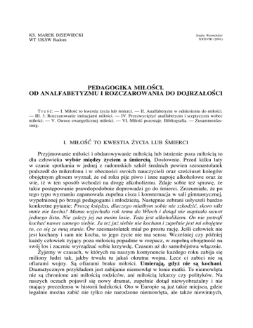 KS. MAREK DZIEWIECKI WT UKSW Radom Studia Warmińskie XXXVIII (2001) PEDAGOGIKA MIŁOŚCI. OD ANALFABETYZMU I ROZCZAROWANIA DO DOJRZAŁOŚCI T r e ś ć: — I. Miłość to kwestia z ycia lub śmierci. — II. Analfabetyzm w odniesieniu do miłości. — III. 3. Rozczarowanie imitacjami miłości. — IV. Przezwyciez yć analfabetyzm i sceptycyzm wobec miłości. — V. Owoce ewangelicznej miłości. — VI. Miłość pozostaje. Bibliografia. — Zusammenfassung. YCIA LUB ŚMIERCI I. MIŁOŚĆ TO KWESTIA Z Przyjmowanie miłości i obdarowywanie miłościa lub istnienie poza miłościa to dla człowieka wybór miedzy z yciem a śmiercia. Dosłownie. Przed kilku laty w czasie spotkania w jednej z radomskich szkół średnich pewien szesnastolatek podszedł do mikrofonu i w obecności swoich nauczycieli oraz sześciuset kolegów obojetnym głosem wyznał, z e od roku pije piwo i inne napoje alkoholowe oraz z e wie, iz w ten sposób wchodzi na droge alkoholizmu. Zdaje sobie tez sprawe, z e takie postepowanie prawdopodobnie doprowadzi go do śmierci. Zrozumiałe, z e po tego typu wyznaniu zapanowała zupełna cisza i konsternacja w sali gimnastycznej, wypełnionej po brzegi pedagogami i młodziez a. Nastepnie zebrani usłyszeli bardzo konkretne pytanie: Prosze ksiedza, dlaczego miałbym sobie nie szkodzić, skoro nikt mnie nie kocha? Mama wyjechała rok temu do Włoch i dotad nie napisała nawet jednego listu. Nie zalezy jej na moim losie. Tata jest alkoholikiem. On nie potrafi kochać nawet samego siebie. Ja tez juz siebie nie kocham i zupełnie jest mi obojetne to, co sie ze mna stanie. Ów szesnastolatek miał po prostu racje. Jeśli człowiek nie jest kochany i sam nie kocha, to jego z ycie nie ma sensu. Wcześniej czy później kaz dy człowiek z yjacy poza miłościa popadnie w rozpacz, w zupełna obojetność na swój los i zacznie wyrzadzać sobie krzywde. Czasem az do samobójstwa włacznie. yjemy w czasach, w których na naszym kontynencie kazdego roku zabija sie Z miliony ludzi tak, jakby trwała tu jakaś okrutna wojna. Lecz ci zabici nie sa ofiarami wojny. Sa ofiarami braku miłości. Umieraja, gdyz nie sa kochani. Dramatycznym przykładem jest zabijanie niemowlat w łonie matki. Te niemowleta nie sa chronione ani miłościa rodziców, ani miłościa lekarzy czy polityków. Na naszych oczach pojawił sie nowy dramat, zupełnie dotad niewyobraz alny i nie majacy precedensu w historii ludzkości. Oto w Europie sa juz takie miejsca, gdzie legalnie moz na zabić nie tylko nie narodzone niemowleta, ale takz e niewinnych, 340 KS. MAREK DZIEWIECKI dorosłych ludzi. W jezyku poprawności politycznej nazywa sie to eutanazja. Zabijanie ludzi chorych i starszych odsłania do końca fakt, z e poza miłościa człowiek nie ma szans na z ycie i na przez ycie. Oto ludzie, którzy nie kochaja — konkretni politycy, socjolodzy i ekonomiści — obliczyli, z e w obliczu niz u demograficznego za kilkanaście lat państwa naszego kontynentu beda musiały przeznaczać ogromna cześć swoich budz etów na emerytury i opieke medyczna dla ludzi starszych. W tej sytuacji wpadli na pomysł, by juz teraz doprowadzić spora grupe ludzi w starszym wieku do takiej desperacji, by sami poprosili o śmierć. Oczywiście prawdziwym rozwiazaniem problemu gwałtownego starzenia sie społeczeństw byłoby obdarowanie z yciem wiekszej ilości dzieci. Ale takie rozwiazanie wymaga znalezienia ludzi zdolnych do tego, by kochać. I to kochać miłościa małz eńska i rodzicielska, a z taka miłościa europejska cywilizacja walczy juz w zupełnie otwarty sposób. Ponadto eutanazja to nie tylko wynik braku miłości w wymiarze społecznym i politycznym. To takz e konsekwencja braku miłości w wymiarze indywidualnym i rodzinnym. To sytuacja, w której nie ma miejsca w naszych sercach i naszych domach dla starzejacych sie rodziców i dziadków. Jednak pieniadze „zaoszczedzone” w tak okrutny sposób nikogo nie uszcześliwia. Zostana zwykle wydane na alkohol, narkotyk, na zaspokojenie sztucznych potrzeb, czy na toksyczna pogoń za dobrobytem materialnym kosztem dobrobytu duchowego i moralnego. Wszedzie tam, gdzie brakuje miłości lub gdzie ona zamiera, przychodzi śmierć pod róz nymi postaciami: od wojen do samobójstw, od dzieciobójstwa do eutanazji. Takz e śmierć zamaskowana, śmierć na raty, np. w postaci alkoholizmu czy narkomanii. Kaz da cywilizacja, która nie opiera sie na miłości i która nie uczy miłości, buduje królestwo przemocy i rozpaczy. Jest skazana na to, by stać sie cywilizacja śmierci. II. ANALFABETYZM W ODNIESIENIU DO MIŁOŚCI Skoro miłość jest dla człowieka dosłownie kwestia z ycia lub śmierci, to dlaczego wielu ludzi nie wierzy w nia? Dlaczego wielu boi sie kochać i być kochanym? Dlaczego wielu jest przekonanych, z e miłość rani i z e nie jest potrzebna do szcześcia? Sadze, z e sa dwa główne powody takiej sytuacji. Powód pierwszy to analfabetyzm w odniesieniu do miłości, czyli sytuacja, w której znaczna cześć społeczeństwa po prostu nie wie, czym jest miłość. Powód drugi to rozczarowanie imitacjami i karykaturami miłości, promowanymi w dominujacej obecnie kulturze oraz w modnych mass-mediach. Przypatrzmy sie bliz ej obu tym zjawiskom. Pierwszym powodem nieufności i sceptycyzmu w odniesieniu do miłości jest zjawisko, które moz na nazwać analfabetyzmem w miłości. Niemal wszyscy ludzie w naszej cywilizacji umieja czytać i pisać, maja spora wiedze i potrafia zrozumieć wiele aspektów świata, który ich otacza. Czesto jednak nie potrafia zrozumieć samych siebie ani natury miłości, za która tesknia i której szukaja. Rozmiary owego analfabetyzmu w odniesieniu do miłości sa obecnie niemal niewyobraz alne. PEDAGOGIKA MIŁOŚCI 341 Trudno jest przeciez wyobrazić sobie, z e na progu trzeciego tysiaclecia ktoś moz e mylić miłość z ukrytym egoizmem, z zakochaniem czy z uleganiem popedowi seksualnemu. A dokładnie tak właśnie dzieje sie w naszy