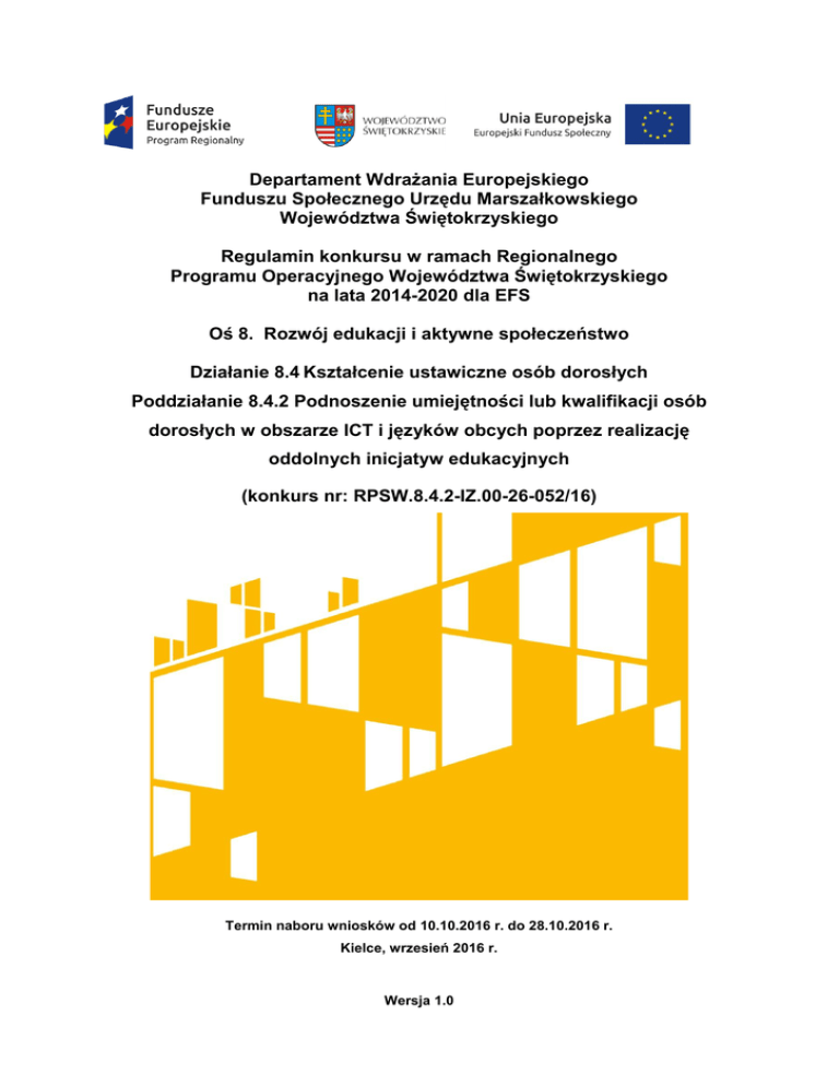 Departament Wdrażania Europejskiego Funduszu Społecznego Urzędu Marszałkowskiego Województwa Świętokrzyskiego Regulamin konkursu w ramach Regionalnego Programu Operacyjnego Województwa Świętokrzyskiego na lata 2014-2020 dla EFS Oś 8. Rozwój edukacji i aktywne społeczeństwo Działanie 8.4 Kształcenie ustawiczne osób dorosłych Poddziałanie 8.4.2 Podnoszenie umiejętności lub kwalifikacji osób dorosłych w obszarze ICT i języków obcych poprzez realizację oddolnych inicjatyw edukacyjnych (konkurs nr: RPSW.8.4.2-IZ.00-26-052/16) Termin naboru wniosków od 10.10.2016 r. do 28.10.2016 r. Kielce, wrzesień 2016 r. Wersja 1.0 Spis treści I. Informacje o konkursie .......................................................................................3 1.1 Podstawa prawna .......................................................................................... 3 1.2 Słownik pojęć................................................................................................. 7 1.3 Instytucja Organizująca Konkurs ................................................................. 13 1.4 Kwota środków przeznaczona na dofinansowanie projektów ...................... 14 1.5 Podmioty uprawnione do ubiegania się o dofinansowanie projektu ............ 15 1.6 Przygotowanie i składanie wniosków o dofinansowanie .............................. 17 1.7 Wycofanie wniosku ...................................................................................... 21 II. Przedmiot konkursu .......................................................................................... 22 2.1 Typy operacji w ramach naboru oraz szczegółowe wymogi ........................ 22 2.2 Grupy docelowe........................................................................................... 28 2.3 Wymagane wskaźniki .................................................................................. 32 2.4 Zasady finansowania wydatków .................................................................. 41 2.5 Wymagania dotyczące partnerstwa ............................................................. 61 2.6 Pomoc publiczna/de minimis ....................................................................... 66 2.7 Ryzyko nieosiągnięcia założeń projektów ................................................... 68 III. Kryteria wyboru projektów i rozstrzygnięcie konkursu ................................. 69 3.1 Ocena formalna ........................................................................................... 69 3.2 Ocena merytoryczna ................................................................................... 74 3.3 Negocjacje oraz wybór projektów do dofinansowania ................................. 87 3.4 Procedura odwoławcza ............................................................................... 90 3.5 Zabezpieczenie realizacji projektu ............................................................... 92 3.6 Umowa o dofinansowanie projektu oraz załączniki ..................................... 93 IV. Dodatkowe informacje ...................................................................................... 97 4.1 Zasady promowania projektów .................................................................... 97 4.2 Dane teleadresowe...................................................................................... 98 V. Załączniki ........................................................................................................... 99 2 I. Informacje o konkursie 1.1 Podstawa prawna 1. Traktat o funkcjonowaniu Unii Europejskiej (Dz. Urz. C 326 z dnia 26 października 2012 r.) 2. Rozporządzenie Parlamentu Europejskiego i Rady (UE) nr 1303/2013 z dnia 17 grudnia 2013 r. ustanawiające wspólne przepisy dotyczące Europejskiego Funduszu Rozwoju Regionalnego, Europejskiego Funduszu Społecznego, Funduszu Spójności, Europejskiego Funduszu Rolnego na rzecz Rozwoju Obszarów Wiejskich oraz Europejskiego Funduszu Morskiego i Rybackiego oraz ustanawiającego przepisy ogólne dotyczące Europejskiego Funduszu Rozwoju Regionalnego, Europejskiego Funduszu Społecznego, Funduszu Spójności i Europejskiego Funduszu Morskiego i Rybackiego oraz uchylające rozporządzenie Rady (WE) nr 1083/2006 (Dz. Urz. UE L 347 z dnia 20 grudnia 2013 r., str. 320, z późn. zm.) – zwane dalej „rozporządzeniem ogólnym” 3. Rozporządzenie Parlamentu Europejskiego i Rady (UE) nr 1304/2013 z dnia 17 grudnia 2013 r. w sprawie Europejskiego Funduszu Społecznego i uchylające rozporządzenie Rady (WE) nr 1081/2006 (Dz. Urz. UE L 347 z dnia 20 grudnia 2013 r., str. 470, z późn. zm.) 4. Rozporządzenie Komisji (UE) nr 1407/2013 z dnia 18 grudnia 2013 r. w sprawie stosowania art. 107 i 108 Traktatu o funkcjonowaniu Unii Europejskiej do pomocy de minimis (Dz. Urz. UE L 352 z dnia 24 grudnia 2013 r.) 5. Rozporządzenie Komisji (UE) nr 651/2014 z dnia 17 czerwca 2014 r. uznające niektóre rodzaje pomocy za zgodne z rynkiem wewnętrznym w zastosowaniu art. 107 i 108 Traktatu (Dz. Urz. UE L 187 z dnia 26 czerwca 2014 r.) 6. Europa 2020 Strategia na rzecz inteligentnego i zrównoważonego rozwoju sprzyjającego włączeniu społecznemu z dnia 3 marca 2010 r. Komunikat Komisji Europejskiej 3 7. Programowanie perspektywy finansowej 2014-2020 – Umowa partnerstwa z dnia 17 grudnia 2015 r., Ministerstwo Rozwoju 8. Regionalny Program Operacyjny Województwa Świętokrzyskiego na lata 20142020 (RPO WŚ) zatwierdzony decyzją wykonawczą Komisji Europejskiej z dnia 11 sierpnia 2016 r. (CCI 2014PL16M2OP013) 9. Szczegółowy Opis Osi Priorytetowych dla RPO WŚ na lata 2014-2020 (zwany dalej SZOOP RPOWŚ) 10. Wytyczne w zakresie warunków gromadzenia i przekazywania danych w postaci elektronicznej na lata 2014-2020 z dnia 3 marca 2015 r. 11. Wytyczne w zakresie warunków certyfikacji oraz przygotowania prognoz wniosków o płatność do Komisji Europejskiej w ramach programów operacyjnych na lata 2014-2020 z