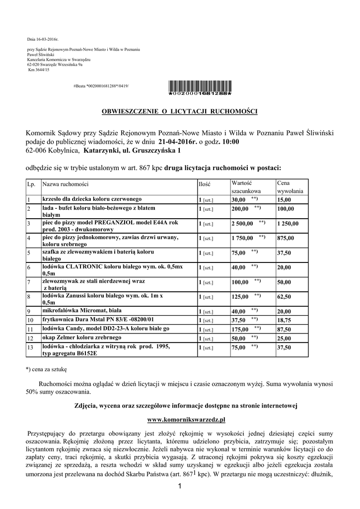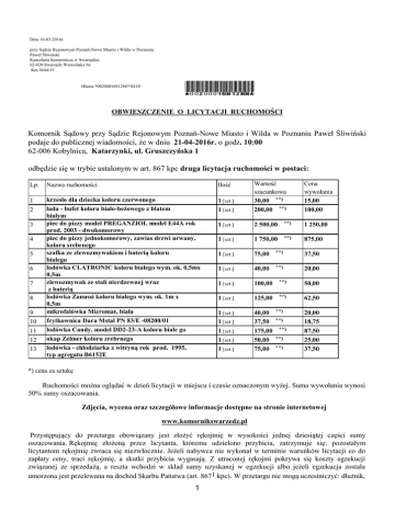 Dnia 16-03-2016r. przy Sądzie Rejonowym Poznań-Nowe Miasto i Wilda w Poznaniu Paweł Śliwiński Kancelaria Komornicza w Swarzędzu 62-020 Swarzędz Wrzesińska 9a Km 3644/15 #Beata *0020001681288*/0419/ *0020001681288* OBWIESZCZENIE O LICYTACJI RUCHOMOŚCI Komornik Sądowy przy Sądzie Rejonowym Poznań-Nowe Miasto i Wilda w Poznaniu Paweł Śliwiński podaje do publicznej wiadomości, że w dniu 21-04-2016r. o godz. 10:00 62-006 Kobylnica, Katarzynki, ul. Gruszczyńska 1 odbędzie się w trybie ustalonym w art. 867 kpc druga licytacja ruchomości w postaci: Lp. Nazwa ruchomości Ilość 1 2 krzesło dla dziecka koloru czerwonego lada - bufet koloru biało-beżowego z blatem białym piec do pizzy model PREGANZIOL model E44A rok prod. 2003 - dwukomorowy piec do pizzy jednokomorowy, zawias drzwi urwany, koloru srebrnego szafka ze zlewozmywakiem i baterią koloru białego lodówka CLATRONIC koloru białego wym. ok. 0,5mx 0,5m zlewozmywak ze stali nierdzewnej wraz z baterią lodówka Zanussi koloru białego wym. ok. 1m x 0,5m mikrofalówka Micromat, biała frytkownica Dara Mstal PN 83/E -08200/01 lodówka Candy, model DD2-23-A koloru białe go okap Zelmer koloru zrebrnego lodówka - chłodziarka z witryną rok prod. 1995, typ agregatu B6152E 1 [szt.] 1 [szt.] Wartość szacunkowa 30,00 **) 200,00 **) 1 [szt.] 2 500,00 **) 1 250,00 1 [szt.] 1 750,00 **) 875,00 1 [szt.] 75,00 **) 37,50 1 [szt.] 40,00 **) 20,00 1 [szt.] 100,00 **) 50,00 1 [szt.] 125,00 **) 62,50 1 [szt.] 1 [szt.] 1 [szt.] 1 [szt.] 1 [szt.] 40,00 37,50 175,00 50,00 75,00 3 4 5 6 7 8 9 10 11 12 13 **) **) **) **) **) Cena wywołania 15,00 100,00 20,00 18,75 87,50 25,00 37,50 *) cena za sztukę Ruchomości można oglądać w dzień licytacji w miejscu i czasie oznaczonym wyżej. Suma wywołania wynosi 50% sumy oszacowania. Zdjęcia, wycena oraz szczegółowe informacje dostępne na stronie internetowej www.komornikswarzedz.pl Przystępujący do przetargu obowiązany jest złożyć rękojmię w wysokości jednej dziesiątej części sumy oszacowania. Rękojmię złożoną przez licytanta, któremu udzielono przybicia, zatrzymuje się; pozostałym licytantom rękojmię zwraca się niezwłocznie. Jeżeli nabywca nie wykonał w terminie warunków licytacji co do zapłaty ceny, traci rękojmię, a skutki przybicia wygasają. Z utraconej rękojmi pokrywa się koszty egzekucji związanej ze sprzedażą, a reszta wchodzi w skład sumy uzyskanej w egzekucji albo jeżeli egzekucja została umorzona jest przelewana na dochód Skarbu Państwa (art. 8671 kpc). W przetargu nie mogą uczestniczyć: dłużnik, 1 komornik, ich małżonkowie, dzieci, rodzice i rodzeństwo, osoby obecne na licytacji w charakterze urzędowym oraz licytant, który nie wykonał warunków poprzedniej licytacji. Stawienie się jednego licytanta wystarcza do odbycia przetargu. Pełnomocnictwo do udziału w przetargu powinno być stwierdzone dokumentem z podpisem urzędowo poświadczonym, chyba że chodzi o pełnomocnictwo udzielone adwokatowi lub radcy prawnemu (art. 8672 kpc) UWAGA: Licytacja może się nie odbyć bez podania przyczyny. Jeżeli drzwi będą zamknięte, będą otwierane na koszt i odpowiedzialność dłużnika . 2