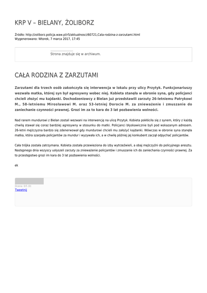 KRP V – BIELANY, ŻOLIBORZ Źródło: http://zoliborz.policja.waw.pl/r5/aktualnosci/60721,Cala-rodzina-z-zarzutami.html Wygenerowano: Wtorek, 7 marca 2017, 17:45 Strona znajduje się w archiwum. CAŁA RODZINA Z ZARZUTAMI Zarzutami dla trzech osób zakończyła się interwencja w lokalu przy ulicy Przytyk. Funkcjonariuszy wezwała matka, której syn był agresywny wobec niej. Kobieta stanęła w obronie syna, gdy policjanci chcieli złożyć mu kajdanki. Dochodzeniowcy z Bielan już przedstawili zarzuty 26-letniemu Patrykowi M., 58-letniemu Mirosławowi M. oraz 53-letniej Dorocie M. za znieważenie i zmuszanie do zaniechanie czynności prawnej. Grozi im za to kara do 3 lat pozbawienia wolności. Nad ranem mundurowi z Bielan zostali wezwani na interwencję na ulicę Przytyk. Kobieta pokłóciła się z synem, który z każdą chwilą stawał się coraz bardziej agresywny w stosunku do matki. Policjanci błyskawicznie byli pod wskazanym adresem. 26-letni mężczyzna bardzo się zdenerwował gdy mundurowi chcieli mu założyć kajdanki. Wówczas w obronie syna stanęła matka, która szarpała policjantów za mundur i wyzywała ich, a w chwilę później jej konkubent zaczął odpychać policjantów. Cała trójka została zatrzymana. Kobieta została przewieziona do izby wytrzeźwień, a obaj mężczyźni do policyjnego aresztu. Następnego dnia wszyscy usłyszeli zarzuty za znieważenie policjantów i zmuszanie ich do zaniechania czynności prawnej. Za to przestępstwo grozi im kara do 3 lat pozbawienia wolności. ek Ocena: 0/5 (0) Tweetnij