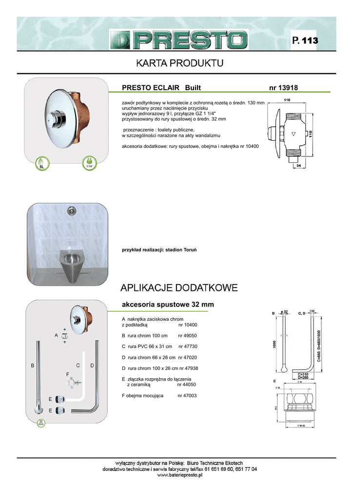 113 PRESTO ECLAIR Built zawór podtynkowy w komplecie z ochronną rozetą o średn. 130 mm uruchamiany przez naciśnięcie przycisku wypływ jednorazowy 9 l, przyłącze GZ 1 1/4" przystosowany do rury spustowej o średn. 32 mm przeznaczenie : toalety publiczne, w szczególności narażone na akty wandalizmu akcesoria dodatkowe: rury spustowe, obejma i nakrętka nr 10400 przykład realizacji: stadion Toruń akcesoria spustowe 32 mm A nakrętka zaciskowa chrom z podkładką nr 10400 B rura chrom 100 cm nr 49050 C rura PVC 66 x 31 cm nr 47730 D rura chrom 66 x 26 cm nr 47020 D rura chrom 100 x 26 cm nr 47938 E złączka rozprężna do łączenia z ceramiką nr 44050 F obejma mocująca nr 47003 nr 13918