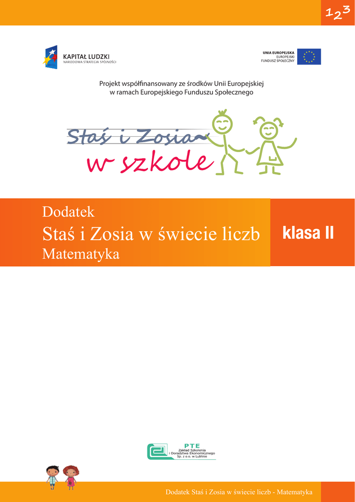 Projekt współfinansowany ze środków Unii Europejskiej w ramach Europejskiego Funduszu Społecznego Dodatek klasa I Staś i Zosia w świecie liczb Matematyka klasa II Dodatek Staś i Zosia w świecie liczb - Matematyka KWADRAT KWADRAT ma CZTERY równe boki. Znak przejście dla pieszych ma kształt przypominający KWADRAT. Dodatek Staś i Zosia w świecie liczb - Matematyka 2 PROSTOKĄT PROSTOKĄT ma DWIE PARY boków różnej długości. Znak strefy zamieszkania ma kształt przypominający PROSTOKĄT. Dodatek Staś i Zosia w świecie liczb - Matematyka 3 TRÓJKĄT TRÓJKĄT ma TRZY boki. Znak ustąp pierwszeństwa ma kształt przypominający TRÓJKĄT. Dodatek Staś i Zosia w świecie liczb - Matematyka 4 OKRĄG Znak skrzyżowania z ruchem okrężnym ma kształt OKRĘGU. Dodatek Staś i Zosia w świecie liczb - Matematyka 5 WIELOKĄT (ośmiokąt) Znak STOP ma kształt OŚMIOKĄTA Dodatek Staś i Zosia w świecie liczb - Matematyka 6 OBWODY FIGUR 3 cm 3 cm 3 cm 3 cm + 3 cm + 3 cm = 9 cm OBWÓD tego TRÓJKĄTA ma długość 9 cm. 7 cm 4 cm 4 cm 7 cm 2 * 7 cm + 2 * 4 cm = = 14 cm + 8 cm = = 22 cm OBWÓD tego PROSTOKĄTA ma długość 22 cm. Dodatek Staś i Zosia w świecie liczb - Matematyka 7 OBWODY FIGUR 4 cm 3 cm 11 cm 4 cm + 3 cm + 11 cm = 18 cm OBWÓD tej figury ma długość 18 cm. 5 cm 7cm 2 cm 11 cm 7 cm + 5 cm + 11 cm + 2 cm = 25 cm OBWÓD tej figury ma długość 25 cm Dodatek Staś i Zosia w świecie liczb - Matematyka 8 SYMETRIA FIGUR Figury symetryczne względem osi pionowej Figury symetryczne względem środka układu współrzędnych Dodatek Staś i Zosia w świecie liczb - Matematyka 9 ZLICZANIE FIGUR Ile rozpoznajesz figur na rysunku? Dodatek Staś i Zosia w świecie liczb - Matematyka 10 FIGURY W PRAKTYCE Staś i Zosia muszą ogrodzić działkę babci. Działka ma kształt kwadratu o długości boku 11 m. Brama wjazdowa ma szerokość 4 m, a bramka z tyłu domu ma szerokość 1 m. Metr ogrodzenia kosztuje 2 zł. Ile Staś i Zosia potrzebują pieniędzy, żeby ogrodzić działkę babci? Obwód działki: 4 * 11 m = 44 m Obwód działki bez bramy wjazdowej i bramki: 44 m – 1 m – 4m = 39 m Ostateczna cena ogrodzenia działki: 39 m * 2 zł = 78 zł Dodatek Staś i Zosia w świecie liczb - Matematyka 11 Dodatek Staś i Zosia w świecie liczb - Matematyka 12 Dodatek Staś i Zosia w świecie liczb - Matematyka 13 AUTORZY – EKSPERCI Marta Wróblewska - Specjalistka ds. Przyrody/Ekologii Milena Potręć - Specjalistka ds. Przedsiębiorczości Katarzyna Machałowska - Specjalistka ds. Przedsiębiorczości Ewa Gałczyńska - Specjalistka ds. Technologii Informacyjno-Komunikacyjnych Anna Gołąb - Nauczycielka Edukacji Wczesnoszkolnej Danuta Chrzanowska - Doradczyni Metodyczna Kamila Małyszko - Nauczycielka Edukacji Wczesnoszkolnej Anna Natora - Doradczyni Metodyczna Tomasz Małyszko - Specjalista ds. Technologii Informacyjno-Komunikacyjnych Małgorzata Kępa - Nauczycielka Edukacji Wczesnoszkolnej Aldona Ryszkowska-Tatara - Specjalistka ds. Przedsiębiorczości Kinga Sarad-Deć - Pedagog Agnieszka Tokarska - Nauczycielka Edukacji Wczesnoszkolnej Michał Adam Roman - Specjalista ds. Technologii Informacyjno-Komunikacyjnych Anna Jarczak - Psycholog Iwona Blicharz - Pedagog Monika Grzesiak-Chmura - Specjalistka ds. Przedsiębiorczości Dorota Pyrgies - Psycholog Aleksandra Kata - Psycholog Dariusz Głuchowski - Specjalista ds. Technologii Informacyjno-Komunikacyjnych Maria Kęska - Specjalistka ds. Matematyki Małgorzata Wieleba - Specjalistka ds. Matematyki Anna Ryszkowska - Specjalistka ds. Matematyki Marta Pietrow - Specjalistka ds. Matematyki Bożena Jankowska - Doradczyni Metodyczna Marzena Szulecka - Specjalistka ds. Przyrody/Ekologii Agnieszka Hankiewicz - Specjalistka ds. Przyrody/Ekologii Bożena Danuta Gaj-Demczuk - Doradczyni Metodyczna Danuta Sałęga - Psycholog Katarzyna Kozłowska - Pedagog Anna Grabka - Specjalistka ds. Przyrody/Ekologii Redakcja: Małgorzata Orzeł, Anna Natora, Danuta Chrzanowska Korekta językowa: Tadeusz Moraczewski ISBN: 978-83-936017-2-1 Wydawnictwo: Polskie Towarzystwo Ekonomiczne Zakład Szkolenia i Doradztwa Ekonomicznego Sp. z o.o. w Lublinie Druk: MV Monika Łyżwa, Lublin, ul. Strzembosza 3/3 Projekt okładki i skład: Artur Żuchowski Opracowanie graficzne: Karolina Kowalewska, Maciej Pałka, Tomasz Butkiewicz