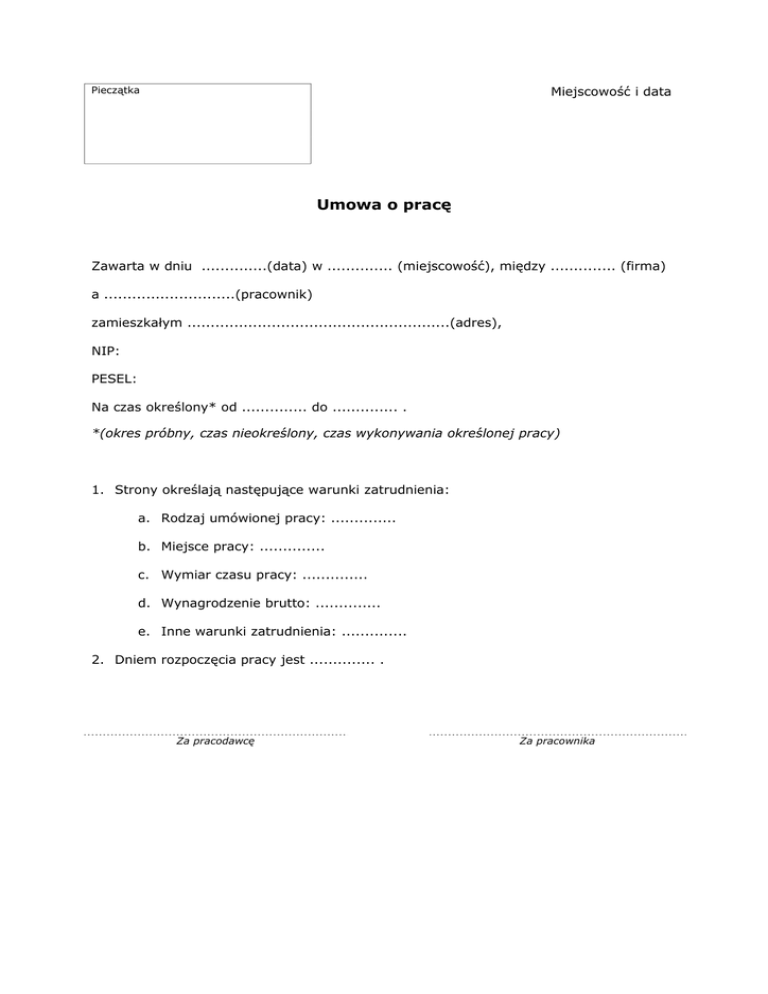 Miejscowość i data Pieczątka Umowa o pracę Zawarta w dniu ..............(data) w .............. (miejscowość), między .............. (firma) a ............................(pracownik) zamieszkałym ........................................................(adres), NIP: PESEL: Na czas określony* od .............. do .............. . *(okres próbny, czas nieokreślony, czas wykonywania określonej pracy) 1. Strony określają następujące warunki zatrudnienia: a. Rodzaj umówionej pracy: .............. b. Miejsce pracy: .............. c. Wymiar czasu pracy: .............. d. Wynagrodzenie brutto: .............. e. Inne warunki zatrudnienia: .............. 2. Dniem rozpoczęcia pracy jest .............. . Za pracodawcę Za pracownika