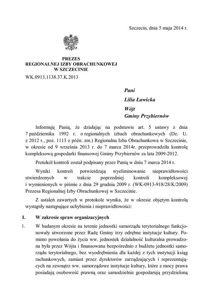 Szczecin, dnia 5 maja 2014 r. PREZES REGIONALNEJ IZBY OBRACHUNKOWEJ W SZCZECINIE WK.0913.1138.37.K.2013 Pani Lilia Ławicka Wójt Gminy Przybiernów Informuję Panią, że działając na podstawie art. 5 ustawy z dnia 7 października 1992 r. o regionalnych izbach obrachunkowych (Dz. U. z 2012 r., poz. 1113 z późn. zm.) Regionalna Izba Obrachunkowa w Szczecinie, w okresie od 9 września 2013 r. do 7 marca 2014r. przeprowadziła kontrolę kompleksową gospodarki finansowej Gminy Przybiernów za lata 2009-2012. Protokół kontroli został podpisany przez Panią w dniu 7 marca 2014 r. Wyniki kontroli potwierdzają wyeliminowanie nieprawidłowości stwierdzonych w trakcie poprzedniej kontroli kompleksowej i wymienionych w piśmie z dnia 29 grudnia 2009 r. (WK-0913-918/28/K/2009) Prezesa Regionalnej Izby Obrachunkowej w Szczecinie. Z ustaleń zawartych w protokole wynika, że w okresie objętym kontrolą wystąpiły następujące uchybienia i nieprawidłowości: I. W zakresie spraw organizacyjnych 1. W badanym okresie na terenie jednostki samorządu terytorialnego funkcjonowały utworzone przez Radę Gminy trzy odrębne instytucje kultury. Pomimo powołania do życia ww. jednostek działalność kulturalna prowadzona była przez Wójta i finansowana bezpośrednio z budżetu jednostki samorządu terytorialnego, bez wyodrębnienia dla każdej z tych instytucji ksiąg rachunkowych, zamiast przez dyrektorów zarządzających i reprezentujących na zewnątrz ww. samorządowe instytucje kultury, które z mocy prawa posiadają osobowość prawną oraz samodzielnie gospodarują przydzieloną 2 im i nabytą częścią mienia, finansując swoją działalność m.in. z dotacji otrzymanej od organizatora, co było niezgodne z art. 17, art. 27 i art. 28 ust. 1, ust. 2 i ust. 3 ustawy z dnia 25 października 1991 r. o organizowaniu i prowadzeniu działalności kulturalnej (Dz. U. z 2001 r. Nr 13, poz. 123 z późn. zm., Dz. U. z 2012 r., poz. 406). Za wskazaną nieprawidłowość odpowiedzialność ponosi Wójt – str. 8 i 9 protokołu kontroli. W wyniku ustaleń kontroli – w dniu 30 grudnia 2013 r. – Rada Gminy podjęła uchwałę Nr XXXI/224/13 w sprawie zamiaru połączenia w jedną instytucję funkcjonujących na terenie jednostki samorządu terytorialnego trzech odrębnych samorządowych instytucji kultury. 2. Obsługę bankową budżetu Gminy prowadził w badanym okresie bank, wybrany przez jednostkę samorządu terytorialnego w wyniku przetargu nieograniczonego, rozstrzygniętego w 2003 r. Umowy o prowadzenie rachunków bankowych, spisane z ww. instytucją finansową w latach 2009 i 2010 zostały zawarte na czas nieoznaczony, czym naruszono art. 142 ust. 1 ustawy z dnia 29 stycznia 2004 r. o zamówieniach publicznych (Dz. U. z 2007 r. Nr 223, poz. 1655 z późn. zm.) w związku z art. 35 ust. 4 ustawy z dnia 30 czerwca 2005 r. o finansach publicznych (Dz. U. Nr 249, poz. 2104 z późn. zm.) – obow. do 31 grudnia 2009 r., a następnie – art. 44 ust. 4 ustawy z dnia 27 sierpnia 2009 r. o finansach publicznych (Dz. U. Nr 157, poz. 1240 z późn. zm.). Za wskazane nieprawidłowości odpowiedzialność ponosi Wójt – str. 14 i 15 protokołu kontroli. 3. Miejsce wykonania zadania radnej Gminy, która odbyła podróż służbową na podstawie polecenia 1/09 z dnia 6 stycznia 2009 r., zamiast Przewodniczącego organu stanowiącego jednostki samorządu terytorialnego określiła Sekretarz, co było sprzeczne z § 2 ust. 1 rozporządzenia Ministra Spraw Wewnętrznych i Administracji z dnia 31 lipca 2000 r. w sprawie sposobu ustalania należności z tytułu zwrotu kosztów podróży służbowych radnych gminy (Dz. U. Nr 66, poz. 800 z późn. zm.), za co odpowiedzialność ponosi Sekretarz, a z nadzoru Wójt – str. 123 protokołu kontroli. 4. W 2010 r. Gmina ogłosiła otwarty konkurs ofert na realizację w 2011 r. zadania publicznego z zakresu dowożenia uczniów niepełnosprawnych z terenu Gminy do Ośrodka Rehabilitacyjno-Edukacyjno-Wychowawczego w Przybiernowie. Ogłoszeń: a) z dnia 21 grudnia 2010 r. o otwartym konkursie ofert nie zamieszczono na stronie internetowej jednostki samorządu terytorialnego, 3 b) z dnia 11 stycznia 2011 r. o wynikach ww. konkursu nie zamieszczono w Biuletynie Informacji Publicznej Urzędu Gminy, na stronie internetowej jednostki samorządu terytorialnego oraz na tablicy ogłoszeń w Urzędzie Gminy, czym naruszono art. 13 ust. 3 pkt 3 (pkt a) oraz art. 15 ust. 2 lit. j w związku z art. 13 ust. 3 (pkt b) ustawy z dnia 24 kwietnia 2003 r. o działalności pożytku publicznego i o wolontariacie (Dz. U. z 2010 r. Nr 234, poz. 1536 z późn. zm.), za co odpowiedzialność ponosi Dyrektor Gminnego Zespołu Ekonomiczno-Administracyjnego Szkół, a z nadzoru Wójt – str. 154 i 156 protokołu kontroli. II. W zakresie rachunkowości 1. Z powodu niewystąpienia w 2012 r. zdarzeń podlegających zapisom na kontach: § 141-Środki pieniężne w drodze, § 223-Rozliczenie wydatków budżetowych, § 490-Rozliczenie kosztów, § 770-Zyski nadzwyczajne, § 771-Straty nadzwyczajne § 820-Rozliczenie wyniku finansowego, w księgach rachunkowych Urzędu Gminy nie założono ww. urządzeń księgowych, ustalonych Zakładowym planem kont, wprowadzonym do stosowania przez Wójta zarządzeniem Nr 46/10 z dnia 1 września 2010 r. Powyższe świadczy o niewykonaniu obowiązku aktualizacji dokumentacji, opisującej przyjęte przez jednostkę zasady (politykę) rachunkowości, co było niezgodne z art. 10 ust. 2 ustawy z dnia 29 września 1994 r. o rachunkowości (Dz. U. z 2009 r. Nr 152, poz. 1223 z późn. zm.), za co odpowiedzialność ponosi Wójt – str. 21 i 22 protokołu kontroli. 2. W 2012 ewidencję rozliczeń z jednostkami budżetowymi z tytułu zrealizowanych przez nie dochodów budżetowych ujmowano w Urzędzie Gminy na koncie 222, bez prowadzenia do tego konta ewidencji szczegółowej, umożliwiającej ustalenie stanu rozliczeń z poszczególnymi jednostkami budżetowymi, 