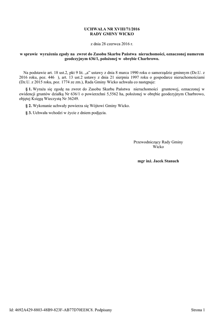 UCHWAŁA NR XVIII/71/2016 RADY GMINY WICKO z dnia 28 czerwca 2016 r. w sprawie wyrażenia zgody na zwrot do Zasobu Skarbu Państwa nieruchomości, oznaczonej numerem geodezyjnym 636/1, położonej w obrębie Charbrowo. Na podstawie art. 18 ust.2, pkt 9 lit. „a” ustawy z dnia 8 marca 1990 roku o samorządzie gminnym (Dz.U. z 2016 roku, poz. 446 ), art. 13 ust.2 ustawy z dnia 21 sierpnia 1997 roku o gospodarce nieruchomościami (Dz.U. z 2015 roku, poz. 1774 ze zm.), Rada Gminy Wicko uchwala co następuje: § 1. Wyraża się zgodę na zwrot do Zasobu Skarbu Państwa nieruchomości gruntowej, oznaczonej w ewidencji gruntów działką Nr 636/1 o powierzchni 5,5562 ha, położonej w obrębie geodezyjnym Charbrowo, objętej Księgą Wieczystą Nr 36249. § 2. Wykonanie uchwały powierza się Wójtowi Gminy Wicko. § 3. Uchwała wchodzi w życie z dniem podjęcia. Przewodniczący Rady Gminy Wicko mgr inż. Jacek Stanuch Id: 4692A429-8803-48B9-823F-AB77D70EE8C8. Podpisany Strona 1 UZASADNIENIE do uchwały w sprawie wyrażenia woli zwrotu nieruchomości gruntowej, oznaczonej numerem działki 43/22 – obr. Kopaniewo do Zasobu Skarbu Państwa Agencja Nieruchomości Rolnych Oddział Terenowy w Gdańsku Sekcja Zamiejscowa Gospodarowania Zasobem w Słupsku dokonała kontroli w ramach nadzoru nad realizacją umowy nieodpłatnego przekazania działki nr 43/22, położonej w obrębie geodezyjnym Kopaniewo z przeznaczeniem na plac zabaw i tereny rekreacyjne. W toku kontroli stwierdzono, że nieruchomość w części tj. około 0,10 ha od strony dogi powiatowej została zaadaptowana na mały plac rekreacyjny, natomiast około 90% powierzchni działki nie jest wykorzystywana zgodnie z przeznaczeniem na jaki została nieodpłatnie przekazana. W związku z przeprowadzoną kontrolą pismem z dnia 10.03.2016 roku Agencja Nieruchomości Rolnych Oddział Terenowy w Gdańsku poinformowała Gminę Wicko, że zgodnie z ustawą z dnia 19 października 1991 roku o gospodarowaniu nieruchomościami rolnymi Skarbu Państwa art. 24 ust. 5a Agencja wystąpi do Gminy z żądaniem zwrotu aktualnej wartości pieniężnej tej nieruchomości oraz poinformowała że odstąpienie od powyższego żądania jest możliwe w trybie art. 24 ust. 5aa cytowanej wyżej ustawy tj. w przypadku gdy nastąpi zwrot do Zasobu Skarbu Państwa nieruchomości będącej przedmiotem nieodpłatnego przekazania. Mimo wyjaśnień Gminy złożonych na piśmie, że nieruchomość jest wykorzystywana rekreacyjnie przez mieszkańców wsi Zdrzewno i będzie w kolejnych latach urządzana w tym kierunku Agencja Nieruchomości Rolnych Oddział Terenowy w Gdańsku zażądała zwrotu nieruchomości do zasobu Skarbu Państwa. W związku z powyższym przedkłada się Radzie Gminy Wicko projekt uchwały w sprawie zwrotu nieruchomości. Id: 4692A429-8803-48B9-823F-AB77D70EE8C8. Podpisany Strona 1