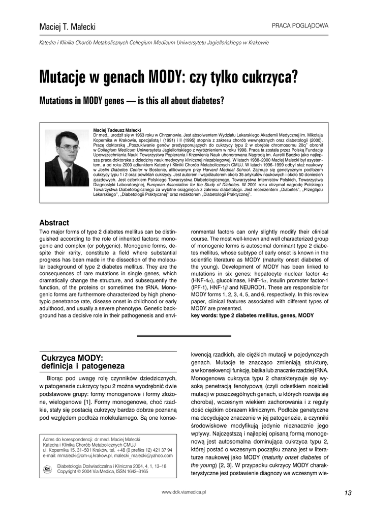 Maciej T. Małecki PRACA POGLĄDOWA Katedra i Klinika Chorób Metabolicznych Collegium Medicum Uniwersytetu Jagiellońskiego w Krakowie Mutacje w genach MODY: czy tylko cukrzyca? Mutations in MODY genes — is this all about diabetes? Maciej Tadeusz Małecki Dr med., urodził się w 1963 roku w Chrzanowie. Jest absolwentem Wydziału Lekarskiego Akademii Medycznej im. Mikołaja Kopernika w Krakowie, specjalistą I (1991) i II (1995) stopnia z zakresu chorób wewnętrznych oraz diabetologii (2000). Pracę doktorską „Poszukiwanie genów predysponujących do cukrzycy typu 2 w obrębie chromosomu 20q” obronił w Collegium Medicum Uniwersytetu Jagiellońskiego z wyróżnieniem w roku 1998. Praca ta została przez Polską Fundację Upowszechniania Nauki Towarzystwa Popierania i Krzewienia Nauk uhonorowana Nagrodą im. Aurelii Baczko jako najlepsza praca doktorska z dziedziny nauk medycyny klinicznej niezabiegowej. W latach 1988–2000 Maciej Małecki był asystentem, a od roku 2000 adiunktem Katedry i Kliniki Chorób Metabolicznych CMUJ. W latach 1996–1999 odbył staż naukowy w Joslin Diabetes Center w Bostonie, afiliowanym przy Harvard Medical School. Zajmuje się genetycznym podłożem cukrzycy typu 1 i 2 oraz powikłań cukrzycy. Jest autorem i współautorem około 35 artykułów naukowych i około 50 doniesień zjazdowych. Jest członkiem Polskiego Towarzystwa Diabetologicznego, Towarzystwa Internistów Polskich, Towarzystwa Diagnostyki Laboratoryjnej, European Association for the Study of Diabetes. W 2001 roku otrzymał nagrodę Polskiego Towarzystwa Diabetologicznego za wybitne osiągnięcia z zakresu diabetologii. Jest recenzentem „Diabetes”, „Przeglądu Lekarskiego”, „Diabetologii Praktycznej” oraz redaktorem „Diabetologii Praktycznej”. Abstract Two major forms of type 2 diabetes mellitus can be distinguished according to the role of inherited factors: monogenic and complex (or polygenic). Monogenic forms, despite their rarity, constitute a field where substantial progress has been made in the dissection of the molecular background of type 2 diabetes mellitus. They are the consequences of rare mutations in single genes, which dramatically change the structure, and subsequently the function, of the proteins or sometimes the tRNA. Monogenic forms are furthermore characterized by high phenotypic penetrance rate, disease onset in childhood or early adulthood, and usually a severe phenotype. Genetic background has a decisive role in their pathogenesis and envi- Cukrzyca MODY: definicja i patogeneza Biorąc pod uwagę rolę czynników dziedzicznych, w patogenezie cukrzycy typu 2 można wyodrębnić dwie podstawowe grupy: formy monogenowe i formy złożone, wielogenowe [1]. Formy monogenowe, choć rzadkie, stały się postacią cukrzycy bardzo dobrze poznaną pod względem podłoża molekularnego. Są one konse- Adres do korespondencji: dr med. Maciej Małecki Katedra i Klinika Chorób Metabolicznych CMUJ ul. Kopernika 15, 31–501 Kraków, tel. +48 (0 prefiks 12) 421 37 94 e-mail: [email protected], [email protected] Diabetologia Doświadczalna i Kliniczna 2004, 4, 1, 13–18 Copyright © 2004 Via Medica, ISSN 1643–3165 ronmental factors can only slightly modify their clinical course. The most well-known and well characterized group of monogenic forms is autosomal dominant type 2 diabetes mellitus, whose subtype of early onset is known in the scientific literature as MODY (maturity onset diabetes of the young). Development of MODY has been linked to mutations in six genes: hepatocyte nuclear factor 4a (HNF-4a), glucokinase, HNF-1a, insulin promoter factor-1 (IPF-1), HNF-1b and NEUROD1. These are responsible for MODY forms 1, 2, 3, 4, 5, and 6, respectively. In this review paper, clinical features associated with different types of MODY are presented. key words: type 2 diabetes mellitus, genes, MODY kwencją rzadkich, ale ciężkich mutacji w pojedynczych genach. Mutacje te znacząco zmieniają strukturę, a w konsekwencji funkcję, białka lub znacznie rzadziej tRNA. Monogenowa cukrzyca typu 2 charakteryzuje się wysoką penetracją fenotypową (czyli odsetkiem nosicieli mutacji w poszczególnych genach, u których rozwija się choroba), wczesnym wiekiem zachorowania i z reguły dość ciężkim obrazem klinicznym. Podłoże genetyczne ma decydujące znaczenie w jej patogenezie, a czynniki środowiskowe modyfikują jedynie nieznacznie jego wpływy. Najczęstszą i najlepiej opisaną formą monogenową jest autosomalna dominująca cukrzyca typu 2, której postać o wczesnym początku znana jest w literaturze naukowej jako MODY (maturity onset diabetes of the young) [2, 3]. W przypadku cukrzycy MODY charakterystyczne jest postawienie diagnozy we wczesnym wie- www.ddk.viamedica.pl 13 Diabetologia Doświadczalna i Kliniczna rok 2004, tom 4, nr 1 ku (druga, trzecia dekada życia), występowanie w kilku kolejnych pokoleniach, zaś leżący u jej podłoża niedobór insuliny ma raczej charakter względny, czemu w obrazie klinicznym odpowiada rzadkie występowanie kwasicy ketonowej [1–3]. Do chwili obecnej u ich heterozygotycznych nosicieli z powstawaniem MODY udało się połączyć mutacje w sześciu różnych genach. Szacuje się, że MODY odpowiada za kilka procent wszystkich przypadków cukrzycy [1–3]. W odniesieniu do form MODY 1, 3, 4, 5 i 6 u podłoża choroby leżą mutacje w genach kodujących białka należące do dużej grupy czynników transkrypcyjnych. Są to następujące geny: HNF-4a (hepatocyte nuclear factor; hepatocytowy czynnik jądrowy), HNF-1a, IPF-1 (insulin promotor factor-1; czynnik promotora insuliny), HNF-1b i NEUROD1 (zwany także BETA2) [1–5]. Wyjątkiem wśród form cukrzycy autosomalnej dominującej jest forma MODY 2, związana z mutacjami w genie glukokinazy, która jest enzymem katalizującym fosforylację glukozy w pozycji 6 [6, 7]. Glukokinaza odgrywa kluczową rolę w regulacji i integracji metabolizmu glukozy w komórkach b wysp tr