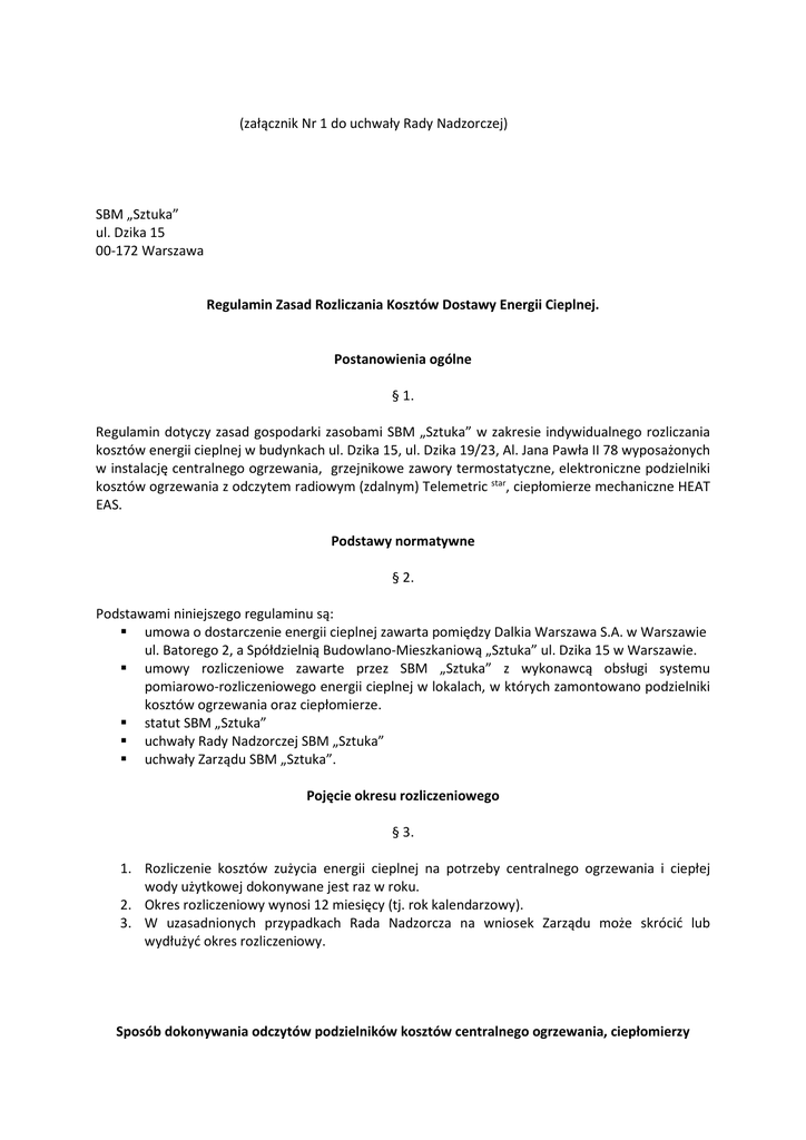 (załącznik Nr 1 do uchwały Rady Nadzorczej) SBM „Sztuka” ul. Dzika 15 00-172 Warszawa Regulamin Zasad Rozliczania Kosztów Dostawy Energii Cieplnej. Postanowienia ogólne § 1. Regulamin dotyczy zasad gospodarki zasobami SBM „Sztuka” w zakresie indywidualnego rozliczania kosztów energii cieplnej w budynkach ul. Dzika 15, ul. Dzika 19/23, Al. Jana Pawła II 78 wyposażonych w instalację centralnego ogrzewania, grzejnikowe zawory termostatyczne, elektroniczne podzielniki kosztów ogrzewania z odczytem radiowym (zdalnym) Telemetric star, ciepłomierze mechaniczne HEAT EAS. Podstawy normatywne § 2. Podstawami niniejszego regulaminu są: umowa o dostarczenie energii cieplnej zawarta pomiędzy Dalkia Warszawa S.A. w Warszawie ul. Batorego 2, a Spółdzielnią Budowlano-Mieszkaniową „Sztuka” ul. Dzika 15 w Warszawie. umowy rozliczeniowe zawarte przez SBM „Sztuka” z wykonawcą obsługi systemu pomiarowo-rozliczeniowego energii cieplnej w lokalach, w których zamontowano podzielniki kosztów ogrzewania oraz ciepłomierze. statut SBM „Sztuka” uchwały Rady Nadzorczej SBM „Sztuka” uchwały Zarządu SBM „Sztuka”. Pojęcie okresu rozliczeniowego § 3. 1. Rozliczenie kosztów zużycia energii cieplnej na potrzeby centralnego ogrzewania i ciepłej wody użytkowej dokonywane jest raz w roku. 2. Okres rozliczeniowy wynosi 12 miesięcy (tj. rok kalendarzowy). 3. W uzasadnionych przypadkach Rada Nadzorcza na wniosek Zarządu może skrócić lub wydłużyć okres rozliczeniowy. Sposób dokonywania odczytów podzielników kosztów centralnego ogrzewania, ciepłomierzy i dokonywania odczytów zużycia c.w.u. § 4. 1. Odczytów stanowiących podstawę rozliczenia dokonuje się ze wskazań podzielników kosztów centralnego ogrzewania zainstalowanych na grzejnikach w lokalu, wskazań ciepłomierzy zainstalowanych w lokalu oraz wskazań mierników zużycia c.w.u zainstalowanych w lokalach mieszkalnych i użytkowych. 2. Czynności odczytowych w zakresie c.o. dokonuje osoba upoważniona przez przedstawiciela „Wykonawcy” obsługi systemu pomiarowo-rozliczeniowego, a w zakresie c.w.u. przedstawiciel spółdzielni. 3. Odczyt ze wskazań podzielników kosztów centralnego ogrzewania zainstalowanych na grzejnikach w lokalu dokonywany jest zdalnie przez osobę upoważnioną przez przedstawiciela „Wykonawcy” obsługi systemu pomiarowo-rozliczeniowego 4. Odczyt ze wskazań ciepłomierzy zainstalowanych w lokalu dokonywany jest przez osobę upoważnioną przez przedstawiciela „Wykonawcy” obsługi systemu pomiarowo-rozliczeniowego w obecności właściciela lokalu lub osoby upoważnionej (osoby pełnoletnie). 5. Odczyt ze wskazań mierników zużycia c.w.u zainstalowanych w lokalach dokonywany jest przez przedstawiciela spółdzielni w obecności właściciela lokalu lub osoby upoważnionej (osoby pełnoletnie). 6. W przypadku odczytów ze wskazań ciepłomierzy oraz ze wskazań mierników zużycia c.w.u właściciel lokalu lub osoba upoważniona każdorazowo potwierdza czytelnym podpisem dokonanie odczytu, prawidłowy stan urządzenia oraz nienaruszalność plomb na podzielnikach i ciepłomierzach wraz z datą prowadzenia czynności. 7. W czasie odczytów ze wskazań ciepłomierzy oraz ze wskazań mierników zużycia c.w.u urządzenia muszą być dostępne dla odczytujących bez przeszkód, tzn. właściciele lokalu muszą zadbać o swobodny dostęp do urządzeń przez usunięcie obudowy mierników, mebli zastawiających urządzenia itp. 8. O terminie odczytu ze wskazań ciepłomierzy oraz ze wskazań mierników zużycia c.w.u właściciel lokalu zostanie zawiadomiony z 7 dniowym wyprzedzeniem poprzez komunikat umieszczony na tablicy ogłoszeń w klatce schodowej budynku. 9. W przypadku nie udostępnienia lokalu w podanym terminie wyznaczony będzie termin dodatkowy w czasie 7 dni od pierwszego terminu. 10. Lokal, w którym brak jest podzielników kosztów centralnego ogrzewania lub ciepłomierzy z przyczyn dotyczących właściciela lokalu, w pozycji koszty indywidualne obciążony zostanie w wysokości średniego zużycia energii cieplnej na potrzeby centralnego ogrzewania w lokalach w danym budynku, przypadającej na 1 m2 powierzchni użytkowej lokalu w okresie rozliczeniowym, powiększony o współczynnik 2,0. 11. W przypadku, jeśli odczyty w dwukrotnie ustalonym terminie nie dojdą do skutku z winy właściciela lokalu rozliczenia dokona się na zasadach określonych w pkt. 10. Obowiązki właściciela lokalu § 5. Właściciel lokalu zobowiązany jest do: a. Udostępnienia lokalu w celu: 1. Zamontowania urządzeń (termozaworów, podzielników ciepła, ciepłomierzy i mierników c.w.u.). 2. Dokonywania odczytów z ciepłomierzy i mierników zużycia c.w.u. 3. Konserwacji urządzeń 4. Naprawy lub wymiany urządzeń 5. Kontroli stanu technicznego urządzeń pomiędzy okresami rozliczeniowymi b. Ochrony przed zniszczeniem urządzeń pomiarowych i wskaźnikowych. c. Natychmiastowego zgłoszenia do administracji spółdzielni w razie: 1. Uszkodzenia urządzeń 2. Stwierdzenia niewłaściwego działania urządzeń 3. Naruszonych plomb Obowiązki wykonawcy obsługi systemu pomiarowo-rozliczeniowego c.o. § 6. 1. Koszty ogrzewania są rozliczane według systemu rozliczeniowego wykonawcy obsługi systemu pomiarowo-rozliczeniowego c.o. podzielników Telemetric star i ciepłomierzy HEAT EAS dopuszczonych do stosowania w Polsce Normą Europejską PN-EN 834. 2. Rozliczenie kosztów ogrzewania w oparciu o system podziału wraz z przynależnymi do niego współczynnikami korekcyjnymi zatwierdzonymi uchwałą Rady Nadzorczej przeprowadzane jest przez Wykonawcę systemu pomiarowo-rozliczeniowego w uzgodnieniu z Zarządem SBM „Sztuka” Sposób ustalania zaliczek § 7. 1. Właściciele lokali wnoszą miesięczne opłaty ryczałtowe tytułem zaliczki na poczet zużycia energii cieplnej na potrzeby centralnego ogrzewania i c.w.u. przez cały rok. 2. Po dokonaniu odczytu podzielników ce