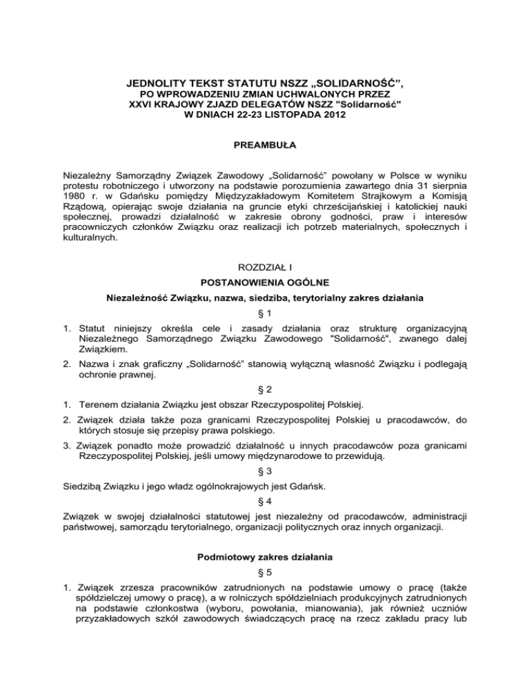JEDNOLITY TEKST STATUTU NSZZ „SOLIDARNOŚĆ”, PO WPROWADZENIU ZMIAN UCHWALONYCH PRZEZ XXVI KRAJOWY ZJAZD DELEGATÓW NSZZ "Solidarność" W DNIACH 22-23 LISTOPADA 2012 PREAMBUŁA Niezależny Samorządny Związek Zawodowy „Solidarność” powołany w Polsce w wyniku protestu robotniczego i utworzony na podstawie porozumienia zawartego dnia 31 sierpnia 1980 r. w Gdańsku pomiędzy Międzyzakładowym Komitetem Strajkowym a Komisją Rządową, opierając swoje działania na gruncie etyki chrześcijańskiej i katolickiej nauki społecznej, prowadzi działalność w zakresie obrony godności, praw i interesów pracowniczych członków Związku oraz realizacji ich potrzeb materialnych, społecznych i kulturalnych. ROZDZIAŁ I POSTANOWIENIA OGÓLNE Niezależność Związku, nazwa, siedziba, terytorialny zakres działania §1 1. Statut niniejszy określa cele i zasady działania oraz strukturę organizacyjną Niezależnego Samorządnego Związku Zawodowego "Solidarność", zwanego dalej Związkiem. 2. Nazwa i znak graficzny „Solidarność” stanowią wyłączną własność Związku i podlegają ochronie prawnej. §2 1. Terenem działania Związku jest obszar Rzeczypospolitej Polskiej. 2. Związek działa także poza granicami Rzeczypospolitej Polskiej u pracodawców, do których stosuje się przepisy prawa polskiego. 3. Związek ponadto może prowadzić działalność u innych pracodawców poza granicami Rzeczypospolitej Polskiej, jeśli umowy międzynarodowe to przewidują. §3 Siedzibą Związku i jego władz ogólnokrajowych jest Gdańsk. §4 Związek w swojej działalności statutowej jest niezależny od pracodawców, administracji państwowej, samorządu terytorialnego, organizacji politycznych oraz innych organizacji. Podmiotowy zakres działania §5 1. Związek zrzesza pracowników zatrudnionych na podstawie umowy o pracę (także spółdzielczej umowy o pracę), a w rolniczych spółdzielniach produkcyjnych zatrudnionych na podstawie członkostwa (wyboru, powołania, mianowania), jak również uczniów przyzakładowych szkół zawodowych świadczących pracę na rzecz zakładu pracy lub pobierających naukę zawodu, osoby wykonujące pracę nakładczą, osoby wykonujące prace na podstawie umowy agencyjnej, a także osoby czerpiące środki utrzymania z pracy wykonywanej na innej podstawie prawnej niż stosunek pracy. Członkami Związku mogą być także bezrobotni, emeryci i renciści oraz osoby odbywające zastępczą służbę wojskową. Utrata zatrudnienia, a także powołanie do odbycia zasadniczej służby wojskowej nie oznaczają utraty członkostwa. 2. Osobom, które w sposób szczególny zasłużyły się dla Związku, a które nie mają uprawnień do zrzeszania się w nim, Krajowy Zjazd Delegatów może nadać członkostwo honorowe Związku w oparciu o regulamin przedstawiony przez Komisję Krajową i zatwierdzony przez Krajowy Zjazd Delegatów. Cele i zadania Związku §6 Celem Związku jest obrona godności, praw i interesów pracowniczych (zawodowych i socjalnych) członków Związku, a w szczególności: 1) zabezpieczanie praw pracowniczych w zakresie wykonywanej pracy zawodowej, wynagrodzenia, warunków socjalno-bytowych oraz bezpieczeństwa i higieny pracy, 2) przeciwdziałanie zjawisku bezrobocia i pomoc członkom Związku pozostającym bez pracy, 3) dążenie do zapewniania pracownikom warunków podnoszenia kwalifikacji zawodowych, 4) ochrona interesów zdrowotnych, materialnych, socjalnych i kulturalnych członków Związku oraz ich rodzin, 5) podejmowanie działań w duchu dialogu społecznego, zmierzających do zharmonizowania interesów pracodawcy z interesami pracowników, 6) wpływanie na kształt polityki gospodarczej i społecznej, 7) szerzenie zasad demokracji i występowanie w obronie uniwersalnych wartości humanitarnych, 8) kształtowanie aktywnej postawy działania dla dobra Ojczyzny, 9) działanie na rzecz osób niepełnosprawnych i potrzebujących szczególnej troski, 10) umacnianie rodziny oraz ochrona życia rodzinnego, 11) współpraca z organizacjami międzynarodowymi w zakresie solidarnej obrony interesów pracowniczych i respektowania praw człowieka, 12) ochrona i promocja kultury oraz szeroko pojętej edukacji, 13) podejmowanie działań na rzecz ochrony naturalnego środowiska człowieka, 14) reprezentowanie interesów pracowniczych na forum międzynarodowym. §7 Związek realizuje swoje cele między innymi poprzez: 1) reprezentowanie swoich członków wobec pracodawców, władz i organów administracji państwowej, samorządu terytorialnego oraz organizacji i instytucji społecznych, 2) zawieranie i wypowiadanie układów zbiorowych pracy oraz innych porozumień z pracodawcami, 3) organizowanie i kierowanie akcjami protestacyjnymi, do strajku włącznie, w przypadku naruszenia interesów pracowniczych, 4) udzielanie pomocy prawnej i podejmowanie interwencji w sprawach dotyczących zakresu działania Związku, 5) sprawowanie kontroli nad przestrzeganiem prawa pracy oraz sprawowanie nadzoru nad przestrzeganiem przepisów, a także zasad bezpieczeństwa i higieny pracy, podejmowanie przewidzianych prawem działań w przypadku występowania zagrożeń dla życia i zdrowia pracowników oraz zapewnianie okresowej kontroli stanowisk pracy, 6) tworzenie funduszy celowych, w tym strajkowego, szkoleniowego, eksperckiego, rozwoju Związku, pomocy niepełnosprawnym, pomocy bezrobotnym oraz funduszu związanego z organizowaniem i wspieraniem sportu, turystyki i rekreacji, 7) opiniowanie i inicjowanie projektów aktów prawnych z zakresu objętego zadaniami związków zawodowych, prowadzenie działalności badawczej w celu przygotowania opinii Związku wiążących się z jego działalnością, 8) szkolenia związkowe i przekwalifikowania zawodowe, 9) tworzenie podmiotów dla prowadzenia działalności gospodarczej w celu uzyskania środków na realizację zadań statutowych, 10) powoływanie agend dla realizacji zadań statutowych, 11) współdzia