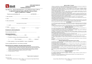 TOWARZYSKIEGO NOWOCZESNEGO WSPÓŁCZESNEGO KARTA ZGŁOSZENIA UCZESTNICTWA w zajęciach Centrum Tańca ADeeM w Nowym Sączu GRUPA: SPORTOWA / HOBBY* Umowa na czas określony od ……………..…………. do 30.06.201……. 1. Imię i nazwisko ...................................................................................................................... 2. Pesel...................................................... 3. Data urodzenia .................................................... 4. Adres zamieszkania: ................................................................................................................................................................................................. (kod, miejscowość, ulica, nr domu) e-mail: .............................................................................................................................. 5. Telefon ..................................... …………………………… (komórkowy) …….……………………. (tel. matka) (tel. ojciec) Oświadczenie rodziców(opiekunów): Przeciwwskazania zdrowotne: .................................................................................... Zobowiązanie finansowe: Wpisowe* w wysokości ………………….. PLN Wysokość czesnego za okres obowiązywania umowy …….…………..………. PLN (……………….. PLN x 2 semestry / ………………… PLN x .……... miesięcy)* Obóz wyjazdowy 7 dni: (letni 900,00PLN / zimowy 1100,00PLN)* Czesne nie podlega odliczeniu w razie absencji uczestnika. Klauzula dotycząca regulaminu, wizerunku i danych osobowych Wyrażam(y) zgodę, na wykorzystywanie przekazanych danych osobowych dla potrzeb działalności Centrum Tańca „ADeeM” z siedzibą w Nowym Sączu, mając jednocześnie zapewnione prawo wglądu do danych oraz ich poprawiania, a także do żądania zaprzestania ich przetwarzania. (TAK/NIE)* Udzielam zezwolenia na rozpowszechnianie wizerunku mojego dziecka utrwalonego za pomocą wszelkich technik fotograficznych, nagraniowych itp. przez CT „ADeeM”. Akceptuję regulamin CT ADeeM. Nowy Sącz dn. .................................... ….……………………………….. Podpis rodziców (opiekunów) REGULAMIN CT ADeeM 1. Decyzja o uczestniczeniu w zajęciach organizowanych przez Centrum Tańca ADeeM jest równoznaczna z przyjęciem do wiadomości, zaakceptowaniem i zobowiązaniem do przestrzegania poniższego regulaminu. 2. Uczestnikami zajęć organizowanych przez CT ADeeM mogą być jedynie osoby, które przestrzegają niniejszego Regulaminu, wypełniły deklarację członkowską oraz mają uregulowaną za nie opłatę zgodnie z aktualnym cennikiem dostępnym na stronie internetowej Centrum. Osoba, która przez okres 6 miesięcy nie uczestniczy w zajęciach i nie opłaca czesnego przestaje być członkiem CT ADeeM. 3. Na sali zajęć mogą przebywać jedynie osoby, które znajdują się na liście uczestników danych zajęć, czyli te, które dokonały odpowiedniej płatności. Z uwagi na komfort zajęć wszystkich uczestników, osoby towarzyszące, które nie uczestniczą w zajęciach nie mają prawa przebywać na salach tanecznych. 4. Uczestnicy zajęć dla młodzieży i dorosłych, którzy nie opłacili udziału w zajęciach, nie mają prawa uczestniczenia w nich. Powinni oni opuścić salę taneczną na prośbę osoby sprawdzającej listę obecności. Po uregulowaniu należności u instruktora mogą kontynuować naukę na tych zajęciach. W przypadku dzieci, które nie mają uregulowanej opłaty, przebywają one na Sali tanecznej pod opieką instruktora, ale nie uczestniczą w zajęciach. 5. Każdy uczestnik przychodząc na zajęcia jest zobowiązany zgłosić się u instruktora w celu weryfikacji płatności. 6. Obowiązkowa jest zmiana obuwia przed wejściem na sale taneczne. Instruktor ma prawo niedopuszczenia na salę osób w obuwiu brudzącym bądź niszczącym podłogę. 7. Instruktor ma prawo nie wpuścić osoby spóźnionej na zajęcia. 8. CT ADeeM ma prawo do wykluczenia z zajęć osoby, której zachowanie zakłóca przebieg zajęć lub jest w inny sposób niestosowne bez zwrotu wpłaconych przez uczestnika pieniędzy za te zajęcia. Uczestnicy zajęć dla dzieci i młodzieży do 13 roku życia zostają wykluczeni z udziału w zajęciach, ale pozostają na sali tanecznej pod opieką instruktora. PŁATNOŚCI 9. CT ADeeM zastrzega sobie możliwość zmiany cennika. Każdy nowy członek CT ADeeM zobowiązany jest do opłacenia wpisowego zgodnie z cennikiem. Osoba pragnąca się reaktywować jako członek CT ADeeM opłaca wpisowe lub uzupełnia zaległe czesne. 10. Opłaty za zajęcia należy dokonać na konto CT ADeeM ING Bank Śląski, nr konta: 27 1050 1722 1000 0090 9288 7612 11. CT ADeeM wystawia faktury w ciągu 7 dni od dokonania wpłaty oraz honoruje karty Mulisport i OKsystem. BEZPIECZEŃSTWO 12. CT ADeeM nie ubezpiecza uczestników zajęć od nieszczęśliwych wypadków ani nie ponosi odpowiedzialności za nieszczęśliwe wypadki powstałe bez winy CT ADeeM i osób działających z ramienia Centrum. 13. Za mienie uczestników zajęć Centrum nie ponosi odpowiedzialności. Uczestnicy zajęć powinni poinformować instruktora o kradzieży niezwłocznie po stwierdzeniu, że miała ona miejsce. 14. Zabrania się przebywania na salach tanecznych bez wiedzy i zgody instruktora. Przebywając na sali należy podporządkować się poleceniom instruktora. Za szkody powstałe w wyniku niezastosowania się przez uczestnika do poleceń instruktora odpowiedzialność ponosi uczestnik. 15. Ze względów higieny i bezpieczeństwa zabrania się wnoszenia na salę jedzenia i napoi. 16. Osoby przebywające na terenie CT ADeeM zobowiązane są do przestrzegania przepisów BHP i Ppoż. oraz zachowania czystości, poszanowania mienia CT ADeeM i innych uczestników zajęć. 17. Osoby oczekujące na zajęcia przebywają w miejscach do tego przeznaczonych, nie zakłócając porządku w 