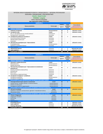 WYDZIAŁ NAUK HUMANISTYCZNYCH I SPOŁECZNYCH I WYDZIAŁ PSYCHOLOGII KIERUNEK: ZARZĄDZANIE I PRZYWÓDZTWO PROFIL: PRAKTYCZNY POZIOM: I stopnia TRYB: NIESTACJONARNY Rok rozpoczęcia studiów 2016/2017 SEMESTR 1 Godziny Lp. I II III IV V VI Nazwa przedmiotu Forma zajeć MODUŁY OBOWIĄZKOWE Podstawy zarządzania Zarządzanie sobą Kto, co i jak wpływa na nasz rozwój osobisty? Samopoznanie i autorozwój Umiejętności praktyczne menedżera I Formy komunikacji w biznesie Metody badań społecznych Statystyka Warsztat dla przedsiębiorczych - Wprowadzenie Przedsiębiorczość Spotkania z praktykami biznesu Poza modułem Wychowanie fizyczne Język angielski 1 Liczba godzin i punktów Ogółem Liczba Forma zaliczenia egzamin/zaliczenie z punktów oceną/zaliczenie bez oceny ECTS konwersatorium moduł seminarium warsztaty moduł warsztaty warsztaty warsztaty moduł konwersatorium warsztaty 24 36 24 12 48 12 12 24 36 24 12 6 6 zaliczenie z oceną zaliczenie z oceną 7 zaliczenie z oceną 6 zaliczenie z oceną ćwiczenia ćwiczenia 24 30 198 1 3 29 zaliczenie bez oceny zaliczenie z oceną SEMESTR 2 Godziny Lp. Nazwa przedmiotu Forma zajeć MODUŁY OBOWIĄZKOWE I Ekonomia i modele biznesowe moduł Mikroekonomia konwersatorium Modele biznesowe konwersatorium Warsztat dla przedsiębiorczych - Wprowadzenie do działalności II moduł gospodarczej Zasady prowadzenia własnej firmy ćwiczenia Kompetencje ćwiczenia Biznes plan ćwiczenia Komunikacja w organizacji (ang.) ćwiczenia III Zarządzanie strategiczne i projektowe moduł Zarządzanie projektami konwersatorium Zarządzanie strategiczne wykład SPECJALNOŚĆ (moduły specjalnościowe): Zarządzanie potencjałem ludzkim I Przewaga konkurencyjna oparta na wartościach moduł Zasady etyczne i wiodące wartości w kulturze biznesu konwersatorium Zmiany na rynku pracy konwersatorium Strategiczna rola ZPL w organizacjach konwersatorium SPECJALNOŚĆ (moduły specjalnościowe): Zarządzanie w branżach kreatywnych I Od teorii w praktykę moduł Spotkania z artystami, producentami, agentami i menedżerami kultury warsztaty Ekonomika kultury seminarium SPECJALNOŚĆ (moduły specjalnościowe): Zarządzanie i organizacja sprzedaży I Finanse i księgowość moduł Księgowość zarządcza ćwiczenia Kontroling ćwiczenia Finanse ćwiczenia Poza modułem Psychologia biznesu wykład Język angielski 2 ćwiczenia Tutoring. Mentoring. warsztaty Liczba godzin i punktów Ogółem Liczba Forma zaliczenia egzamin/zaliczenie z punktów oceną/zaliczenie bez oceny ECTS 36 24 12 4 zaliczenie z oceną 48 7 zaliczenie z oceną 6 zaliczenie z oceną 48 12 24 12 6 zaliczenie z oceną 48 24 24 6 zaliczenie z oceną 48 12 12 24 6 zaliczenie z oceną 24 30 24 258 3 3 zaliczenie z oceną zaliczenie z oceną zaliczenie bez oceny 12 12 12 12 48 24 24 2 31 W wyjątkowych sytuacjach składniki modułów mogą zmienić swoje nazwy w związku z doskonaleniem programu kształcenia. SEMESTR 3 Godziny Lp. Nazwa przedmiotu Forma zajeć MODUŁY OBOWIĄZKOWE I Warsztat dla przedsiębiorczych - Marketing moduł Wybrane zagadnienia z marketingu konwersatorium Zarządzanie marką firmy/ przedsiębiorstwa ćwiczenia Negocjacje i mediacje konwersatorium II Umiejętności praktyczne menedżera II moduł Wizualizacja danych i idei warsztaty Technologie informacyjne warsztaty Sztuka autoprezentacji i wystąpień publicznych warsztaty III Zarządzanie zmianą Zarządzanie zmianą konwersatorium Zarządzanie innowacją konwersatorium IV Projekt zespołowy moduł Współpraca zespołowa i podejmowanie decyzji warsztaty Realizacja projektu warsztaty SPECJALNOŚĆ (moduły specjalnościowe): Zarządzanie potencjałem ludzkim moduł I Pozyskiwanie i rozwój talentów Zarządzanie przez kompetencje konwersatorium Pozyskiwanie, rozwój i utrzymanie talentów z zastosowaniem procesów i konwersatorium narzędzi ZPL Warsztaty praktyczne z procesów ZPL/certyfikaty warsztaty SPECJALNOŚĆ (moduły specjalnościowe): Zarządzanie w branżach kreatywnych I Prawne uwarunkowania w branżach kreatywnych moduł Zamówienia publiczne konwersatorium Prawo autorskie i pokrewne konwersatorium Prawne aspekty działalności kulturalnej konwersatorium Ochrona prawa do prywatności oraz danych osobowych i informacji w konwersatorium biznesie i administracji SPECJALNOŚĆ (moduły specjalnościowe): Zarządzanie i organizacja sprzedaży I Marketing II stopnia moduł Marketing handlowy konwersatorium Cenotwórstwo konwersatorium Poza modułem Technologie kultury warsztaty Przywództwo konwersatorium Język angielski 3 ćwiczenia Liczba godzin i punktów Ogółem Liczba Forma zaliczenia egzamin/zaliczenie z punktów oceną/zaliczenie bez oceny ECTS 48 24 12 12 36 12 12 12 48 24 24 48 24 24 4 zaliczenie z oceną 3 zaliczenie z oceną 4 zaliczenie z oceną 6 zaliczenie z oceną 48 12 6 zaliczenie z oceną 6 zaliczenie z oceną 48 24 24 6 zaliczenie z oceną 12 24 30 294 2 2 3 30 zaliczenie z oceną zaliczenie z oceną zaliczenie z oceną 24 12 48 12 12 12 12 SEMESTR 4 Godziny Lp. Nazwa przedmiotu Forma zajeć MODUŁY OBOWIĄZKOWE I Kreatywność w zarządzaniu moduł Kreatywność w zarządzaniu konwersatorium Warsztaty z kreatywności warsztaty Innowacyjność, kreatywność, technologie warsztaty II Makroekonomia moduł Rynki światowe konwersatorium Makroekonomia konwersatorium III Projekt zespołowy moduł Coaching warsztaty Realizacja projektu zespołowego warsztaty Poza modułem Prawo dla menedżerów konwersatorium Język angielski 4 ćwiczenia SPECJALNOŚĆ (moduły specjalnościowe): Zarządzanie potencjałem ludzkim I Zarządzanie emocjonalnym kapitałem moduł Przywództwo konwersatorium Budowanie zaangażowania pracowników konwersatorium Budowanie skutecznych zespołów konwersatorium Odporność pracowników: pracoholizm/wypalenie zawodowe warsztaty SPECJALNOŚĆ (moduły specjalnościowe): Zarządzanie w branżach kreatywnych I Producent moduł Ekonomika mediów konwersatorium Kultura i technologia konwersa