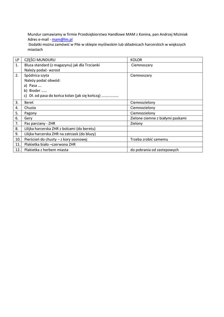 Mundur zamawiamy w firmie Przedsiębiorstwo Handlowe MAM z Konina, pan Andrzej Miziniak Adres e-mail - [email protected] Dodatki można zamówić w Pile w sklepie myśliwskim lub składnicach harcerskich w większych miastach LP 1. 2. 3. 4. 5. 6. 7. 8. 9. 10. 11. 12. CZĘŚCI MUNDURU Bluza standard (z magazynu) jak dla Trzcianki Należy podać- wzrost Spódnica szyta Należy podać obwód: a) Pasa …. b) Bioder …… c) Dł. od pasa do końca kolan (jak się kończą) ……………… KOLOR Ciemnoszary Beret Chusta Pagony Gery Pas parciany - ZHR Lilijka harcerska ZHR z bolcami (do beretu) Lilijka harcerska ZHR na zatrzask (do bluzy) Pierścień do chusty – z kory sosnowej Plakietka biało –czerwona ZHR Plakietka z herbem miasta Ciemnozielony Ciemnozielony Ciemnozielony Zielone ciemne z białymi paskami Zielony Ciemnoszary Trzeba zrobić samemu do pobrania od zastepowych