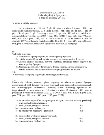 Uchwała Nr XV/128/15 Rady Miejskiej w Pyrzycach z dnia 26 listopada 2015 r. w sprawie opłaty targowej Na podstawie art. 18 ust. 2 pkt 8 ustawy z dnia 8 marca 1990 r. o samorządzie gminnym (Dz. U. z 2015 r. poz. 1515) oraz art. 15 ust. 1, art. 19 pkt 1 lit. a), pkt 2 i pkt 3 ustawy z dnia 12 stycznia 1991 roku o podatkach i opłatach lokalnych (Dz. U. z 2014 r. poz. 849; z 2015 r. poz. 528, poz. 774, poz. 699, poz. 1045, poz. 1283, poz. 1777) a także art. 47 § 4a ustawy z dnia 29 sierpnia 1997 r. ordynacja podatkowa (Dz. U. z 2015 r. poz. 613, poz. 699, poz. 978, poz. 1197) Rada Miejska w Pyrzycach uchwala, co następuje : § 1. Uchwała niniejsza: 1) Wprowadza opłatę targową na terenie gminy Pyrzyce. 2) Ustala wysokość stawek opłaty targowej na terenie gminy Pyrzyce. 3) Określa zasady ustalania, poboru i terminy płatności opłaty targowej na terenie gminy Pyrzyce. 4) Zarządza pobór opłaty targowej w drodze inkasa, określa inkasentów, termin płatności dla inkasentów oraz wynagrodzenie za inkaso. § 2. Wprowadza się opłatę targową na terenie gminy Pyrzyce. § 3. Ustala się dzienną stawkę opłaty targowej na obszarze gminy Pyrzyce pobieranej od osób fizycznych, osób prawnych oraz jednostek organizacyjnych nie posiadających osobowości prawnej, które dokonują sprzedaży na targowiskach w rozumieniu art. 15 ustawy z dnia 12 stycznia 1991 roku o podatkach i opłatach lokalnych ( Dz. U. z 2014 r. poz. 849; z 2015 r. poz. 528, poz. 774, poz. 699, poz. 1045, poz. 1283, poz. 1777): 1) za sprzedaż artykułów spożywczych warzyw, owoców własnej produkcji oraz pochodzenia rolniczego: a) z ręki, kosza, skrzynki, roweru 5 zł b) z samochodów osobowych 10 zł c) z pozostałych pojazdów i przyczep 13 zł 2) za sprzedaż artykułów przemysłowych: a) z ręki, kosza, skrzynki, roweru b) z samochodów osobowych 10 zł 15 zł c) z pozostałych pojazdów i przyczep 20 zł 3) za sprzedaż artykułów spożywczych, warzyw, owoców własnej produkcji oraz pochodzenia rolniczego, a także artykułów przemysłowych ze straganów, stołów, namiotów: - do 2m 2 12 zł 2 2 - od 2m do 5m 15 zł 2 2 - od 5m do 10 m 22 zł 2 2 - od 10 m do 20 m 34 zł 2 powyżej 20 m 45 zł 4) za sprzedaż artykułów nagrobnych ( kwiaty naturalne i sztuczne, wieńce, znicze) oraz ozdób świątecznych (choinki, ozdoby choinkowe, lampki, palmy, stroiki): a) za zajęcie powierzchni do 1 m2 20 zł 2 2 b) za zajęcie powierzchni od 1,1 m do 2,0m 40 zł 2 2 c) za zajęcie powierzchni od 2,1 m do 5,0m 60 zł 2 2 d) za zajęcie powierzchni od 5,1 m do 10,0m 80 zł 2 e) za zajęcie powierzchni powyżej 10m 100 zł § 4. 1. Zarządza się pobór opłaty targowej w drodze inkasa. 2. Poboru opłaty targowej dokonują: Konrad Ogiejko, Tomasz Posyniak, Krzysztof Dębek oraz Michał Maduzia. 3. Ustala się wynagrodzenie inkasentów, o których mowa w ust. 2, za pobór opłaty targowej w wysokości 1% pobranych i odprowadzonych kwot. § 5. 1. Opłata targowa płatna jest gotówką w dniu i miejscu dokonywania sprzedaży do rąk upoważnionego inkasenta. 2. Dowodem wpłaty dokonanej jest pokwitowanie wydane przez inkasenta. 3. Terminem płatności dla inkasentów opłaty targowej jest pierwszy roboczy dzień tygodnia następujący po tygodniu, w którym opłata targowa została pobrana. Inkasenci wpłacają pobraną opłatę targową w kasie Urzędu Miejskiego w Pyrzycach. 4. Łączna kwota dziennej opłaty targowej nie może przekroczyć określonej w Obwieszczeniu Ministra Finansów górnej granicy stawki dziennej opłaty targowej. § 6. Wykonanie uchwały powierza się Burmistrzowi Pyrzyc. § 7. Tracą moc uchwały: Nr XVI/115/07 Rady Miejskiej w Pyrzycach z dnia 25 października 2007 r. w sprawie opłaty targowej (Dz. Urz. Woj. Zachodniopom. Nr 121, poz. 2238), Nr XL/338/09 z dnia 12 marca 2009 r. o zmianie uchwały w sprawie opłaty targowej (Dz. Urz. Woj. Zachodniopom. Nr 22, poz. 833), uchwałą Nr XLIII/375/09 Rady Miejskiej w Pyrzycach z dnia 28 maja 2009 r. o zmianie uchwały w sprawie opłaty targowej (Dz. Urz. Woj. Zachodniopom. Nr 52 poz. 1374), uchwałą Nr LI/427/09 z 24 września 2009r. (Dz. Urz. Woj. Zachodniopom. Nr 76, poz. 203) o zmianie uchwały w sprawie opłaty targowej, uchwałą Nr XI/136/11 z dnia 29 września 2011 r. o zmianie uchwały w sprawie opłaty targowej ( Dz. Urz. Woj. Zachodniopom. Nr 141 poz. 2684), uchwałą Nr XXX/323/12 z dnia 29 listopada 2012 r. o zmianie uchwały w sprawie opłaty targowej (Dz. Urz. Woj. Zachodniopom. Poz. 3186) oraz uchwałą Nr XXXV/365/13 z dnia 21 lutego 2013 r. o zmianie uchwały w sprawie opłaty targowej (Dz. Urz. Woj. Zachodniopom. Poz.1155). § 8. Uchwała podlega publikacji w Dzienniku Urzędowym Województwa Zachodniopomorskiego i wchodzi w życie z dniem 01 stycznia 2016 roku. Przewodniczący Rady Paweł Chyt