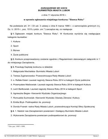 ZARZĄDZENIE NR 3/2016 BURMISTRZA MIASTA LUBOŃ z dnia 11 stycznia 2016 r. w sprawie ogłoszenia miejskiego konkursu "Siewca Roku" Na podstawie art. 31 i 33 ust. 3 ustawy z dnia 8 marca 1990 r. o samorządzie gminnym (t.j. Dz. U. 2015 r., poz. 1515 z późn. zm.1)) zarządza się, co następuje: § 1. Ogłaszam miejski konkurs "Siewca Roku". W Konkursie wyróżnia się następujące kategorie laureatów: 1. Kultura 2. Sport 3. Biznes 4. Życie publiczne § 2. Konkurs przeprowadzony zostanie zgodnie z Regulaminem stanowiącym załącznik nr 1 do niniejszego Zarządzenia. § 3. Powołuję Kapitułę konkursu w składzie: 1. Małgorzata Machalska- Burmistrz Miasta Luboń 2. Teresa Zygmanowska- Przewodnicząca Rady Miasta Luboń 3. s. Rafała Kisiel- Laureat nagrody Siewca Roku 2014 w kategorii Życie publiczne 4. Przemysław Maćkowiak- Laureat nagrody Siewca Roku 2014 w kategorii Kultura 5. Lech Bartkowiak- Laureat nagrody Siewca Roku 2014 w kategorii Sport 6. Agnieszka Begier- Kierownik Wydziału Organizacjnego 7. Romualda Suchowiak- Kierownik Wydziału Oświaty Zdrowia i Kultury 8. Emilia Bryś- Podinspektor ds. promocji 9. Dorota Franek- radna Rady Miasta Luboń, przewodnicząca Komisji Sfery Społecznej § 4. 1. Nadzór nas Zarządzeniem powierzam I Zastępcy Burmistrz Miasta Luboń 2. Wykonanie Zarządzenia powierzam podinspektorowi ds. promocji 1) Zm. poz. 1045 i 1890. Id: 7CE183D9-825E-44FE-82D3-7116B379EE63. Ogłoszony Strona 1 § 5. Zarządzenie niniejsze wraz z Regulaminem Konkursu podlega opublikowaniu na stronie miasta www.lubon.pl § 6. Zarządzenie wchodzi w życie z dniem 11 stycznia 2016 r. - Otrzymują: 1. podisnpektor ds. promocji 2. WO- a/a Id: 7CE183D9-825E-44FE-82D3-7116B379EE63. Ogłoszony Strona 2 Załącznik do Zarządzenia Nr 3/2016 Burmistrza Miasta Luboń z dnia 11 stycznia 2016 r. Regulamin konkursu "Siewca Roku" Postanowienia ogólne § 1. 1. Organizatorem konkursu „Siewca Roku”, zwanego dalej Konkursem jest Miasto Luboń. 2. Celem Konkursu jest promowanie osób i podmiotów, które mają istotny wpływ na życie kulturalne, popularyzację sportu, potencjał gospodarczy oraz aktywizację społeczności lokalnych miasta Luboń. § 2. Regulamin Konkursu jest wiążący dla Organizatora, Kapituły Konkursu oraz uczestników Konkursu, reguluje zasady i warunki uczestnictwa w Konkursie, prawa i obowiązki Organizatora oraz Kapituły Konkursu oraz prawa i obowiązki uczestników Konkursu. Kategorie laureatów § 3. W Konkursie wyróżnia się następujące kategorie laureatów: 1. Kultura; 2. Sport; 3. Biznes; 4. Życie publiczne Zgłoszenia do Konkursu § 4. Zgłoszenie kandydata do Konkursu może złożyć każda osoba fizyczna lub prawna oraz organizacja nieposiadająca osobowości prawnej prowadząca działalność na terenie Lubonia, jak również każdy z mieszkańców Lubonia. § 5. Zgłoszenia do Konkursu przyjmowane są do dnia 29 stycznia 2016 r. (decyduje data wpływu do Urzędu Miasta Luboń). § 6. Zgłoszenia należy składać na formularzu zgłoszeniowym udostępnionym na stronie www.lubon.pl , za pośrednictwem poczty elektronicznej na adres e–mail [email protected], pocztą lub osobiście w siedzibie organizatora, pod adresem: Urząd Miasta Luboń, plac Edmunda Bojanowskiego 2, 62-030 Luboń Id: 7CE183D9-825E-44FE-82D3-7116B379EE63. Ogłoszony Strona 1 Zasady Konkursu Siewca Roku. § 7. O przyjęciu zgłoszenia za pośrednictwem poczty elektronicznej decyduje data dostarczenia wiadomości e-mail na serwer Organizatora. § 8. Zgłoszenie kandydata do Konkursu winno spełniać wymogi formalne – każde z pól formularza zgłoszeniowego powinno być wypełnione. § 9. Kandydatem do Konkursu może być osoba fizyczna i osoba prawna związana poprzez swoją działalność z miastem; nie ma wymogu zamieszkiwania przez kandydata na terenie Miasta Luboń. Zgłoszony kandydat winien w ocenie zgłaszającego swą postawą, działalnością, osiągnięciami zasługiwać na miano „Siewcy Roku” w danej kategorii. § 10. Kandydatem do konkursu nie może być osoba zatrudniona w instytucji miejskiej, zgłoszona do konkursu za swoje działania w ramach wykonywania obowiązków służbowych, oraz radny obecnej kadencji Rady Miasta Luboń. § 11. Procedura wyłaniania nominowanych oraz laureatów Konkursu w kategoriach: kultura, sport, biznes i życie publiczne jest realizowana przez Kapitułę Konkursu. Kapituła Konkursu § 12. Nagroda przyznawana jest przez Kapitułę Konkursu, którą stanowią przedstawiciele różnych nurtów społecznych, urzędnicy oraz laureaci poprzedniej edycji konkursu. § 13. Członków kapituły powołuje zarządzeniem Burmistrz Miasta Luboń. § 14. Kapitule przewodniczy Burmistrz Miasta Luboń. § 15. Członkowie Kapituły oraz Przewodniczący pełnią swoje funkcje przez okres trwania Konkursu. § 16. W posiedzeniu Kapituły członkowie uczestniczą osobiście. Posiedzenie Kapituły jest prawomocne bez względu na liczbę przybyłych na posiedzenie Członków, pod warunkiem, że wszyscy Członkowie zostali skutecznie powiadomieni drogą listowną lub elektroniczną o terminie posiedzenia, co najmniej na 7 dni przed jego terminem. Procedura wyłonienia nominowanych § 17. Listę nominowanych dla każdej z kategorii spośród zgłoszonych kandydatów ustalają Członkowie Kapituły w oparciu o następujące kryteria: 1. w kategorii kultura – wpływ kandydata na życie kulturalne Miasta Luboń, osiągnięcia w upowszechnianiu kultury, ze szczególnym naciskiem na rok 2015, uzyskane nagrody i wyróżnienia. Id: 7CE183D9-825E-44FE-82D3-7116B379EE63. Ogłoszony Strona 2 2. w kategorii sport – wpływ na popularyzację sportu w mieście Luboń, ranga odniesionych sukcesów w roku 2015 i dotychczasowej karierze sportowej. 3. w kategorii biznes – oddziaływanie na potencjał gospodarczy miasta Luboń, działalność społeczna i charytatywna, jakość zarządzania zasobami ludzkimi, uzyskane certyfikaty i wyróżnienia 4. życi