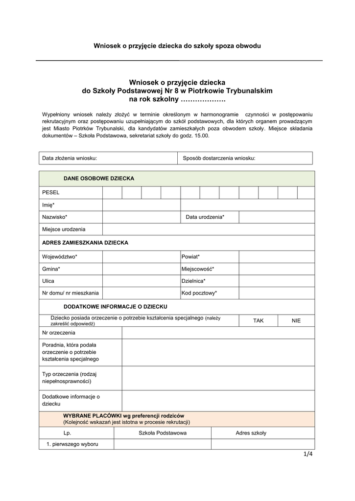 Wniosek o przyjęcie dziecka do szkoły spoza obwodu Wniosek o przyjęcie dziecka do Szkoły Podstawowej Nr 8 w Piotrkowie Trybunalskim na rok szkolny ………………. Wypełniony wniosek należy złożyć w terminie określonym w harmonogramie czynności w postępowaniu rekrutacyjnym oraz postępowaniu uzupełniającym do szkół podstawowych, dla których organem prowadzącym jest Miasto Piotrków Trybunalski, dla kandydatów zamieszkałych poza obwodem szkoły. Miejsce składania dokumentów – Szkoła Podstawowa, sekretariat szkoły do godz. 15.00. Data złożenia wniosku: Sposób dostarczenia wniosku: DANE OSOBOWE DZIECKA PESEL Imię* Nazwisko* Data urodzenia* Miejsce urodzenia ADRES ZAMIESZKANIA DZIECKA Województwo* Powiat* Gmina* Miejscowość* Ulica Dzielnica* Nr domu/ nr mieszkania Kod pocztowy* DODATKOWE INFORMACJE O DZIECKU Dziecko posiada orzeczenie o potrzebie kształcenia specjalnego (należy zakreślić odpowiedź) TAK NIE Nr orzeczenia Poradnia, która podała orzeczenie o potrzebie kształcenia specjalnego Typ orzeczenia (rodzaj niepełnosprawności) Dodatkowe informacje o dziecku WYBRANE PLACÓWKI wg preferencji rodziców (Kolejność wskazań jest istotna w procesie rekrutacji) Lp. Szkoła Podstawowa Adres szkoły 1. pierwszego wyboru 1/4 2. drugiego wyboru 3. trzeciego wyboru DANE OSOBOWE MATKI/OPIEKUNKI PRAWNEJ Opiekun (właściwe zakreślić) Rodzic Opiekun prawny Imię* Nie udzieli informacji Nie żyje Nieznany Rodzic mieszka za granicą Nieznany Rodzic mieszka za granicą Drugie imię* Nazwisko* ADRES ZAMIESZKANIA MATKI/OPIEKUNKI PRAWNEJ Województwo* Powiat* Gmina* Miejscowość* Ulica Dzielnica* Nr domu/ nr mieszkania Kod pocztowy* DANE KONTAKTOWE MATKI/OPIEKUNKI PRAWNEJ Telefon dom/komórka* Adres e-mail** DANE OSOBOWE OJCA/OPIEKUNA PRAWNEGO Opiekun (właściwe zakreślić) Imię* Rodzic Opiekun prawny Nie udzieli informacji Nie żyje Drugie imię* Nazwisko* ADRES ZAMIESZKANIA OJCA/OPIEKUNA PRAWNEGO Województwo* Powiat* Gmina* Miejscowość* Ulica Dzielnica* Nr domu/ nr mieszkania Kod pocztowy* DANE KONTAKTOWE OJCA/OPIEKUNA PRAWNEGO Telefon dom/komórka* Adres e-mail** *oznaczone pola wymagane ** adres email jest wykorzystywany do przesłania nowego hasła w przypadku zagubienia oraz poinformowania o wynikach kwalifikacji. Nadawca informacji przesłanej pocztą internetową nie gwarantuje jej skutecznego dostarczenia do skrzynki pocztowej adresata. 2/4 KRYTERIA PRZYJĘĆ (przy spełnionych kryteriach proszę postawić znak „x”) Kryteria wynikające ze statutu szkoły/ustalane przez gminę lub dyrektora w uzgodnieniu z organem prowadzącym Rodzeństwo kandydata w roku szkolnym, na który prowadzona jest rekrutacja, będzie uczęszczało do tej szkoły 1. 2. Kandydat, który uczęszczał do przedszkola mającego swoją siedzibę w obwodzie tej szkoły 3. Wielodzietność rodziny kandydata 4. Miejsce pracy co najmniej jednego z rodziców znajduje się w obwodzie szkoły 5 pkt. 3 pkt. 2 pkt. 1 pkt. Uwagi. Przewodniczący Komisji Rekrutacyjnej może prosić o przedłożenie dokumentów potwierdzających spełnianie kryteriów kwalifikacyjnych zaznaczonych we wniosku. W przypadku nieprzedłożenia w terminie wskazanym przez Przewodniczącego dokumentów potwierdzających spełnienie kryteriów przyjmuje się, że dziecko nie spełnia danego kryterium. W przypadku braku potwierdzenia wyrażam zgodę na wykreślenie dziecka z listy zakwalifikowanych do przyjęcia do szkoły. Oświadczam, że podane powyżej dane są zgodne ze stanem faktycznym. ……………………………………………… Podpis matki lub opiekunki prawnej ………………………………………. podpis ojca lub opiekuna prawnego Specyfikacja załączników do wniosku: Kolejny numer załącznika 1. 2. 3. 4. Rodzaj załącznika Forma załącznika1 Uwagi Potwierdzenie dyrektora szkoły na podstawie dokumentacji szkoły Zaświadczenie dyrektora przedszkola Oświadczenie rodzica o wielodzietności rodziny, w której wychowuje się kandydat Zaświadczenie z zakładu pracy o zatrudnieniu rodzica 5. 6. 7. 8. 1 Formy załączników: oryginał, notarialnie poświadczona kopia, urzędowo poświadczona kopia, kopia poświadczona za zgodność z oryginałem przez rodzica/ opiekuna, oświadczenie 3/4 Do wniosku dołączono łącznie ......... załączników OŚWIADCZENIA DOTYCZĄCE TREŚCI ZGŁOSZENIA I OCHRONY DANYCH OSOBOWYCH Podstawą prawną danych osobowych dziecka, jego rodziców lub opiekunów prawnych w celu rekrutacji dziecka do szkoły jest art. 23 ust. 1 pkt 1 i art. 27 ust.2 pkt 1 ustawy o ochronie danych osobowych (t.j. Dz. U. z 2002 r. nr poz. 926 z późniejszymi zmianami), zgodnie z którymi przetwarzanie jest dopuszczalne, jeżeli osoba, której dane dotyczą, wyrazi na to zgodę. Ponadto zgodnie z art. 23 ust. 1 pkt 2 ustawy przetwarzanie danych jest dopuszczalne, gdy jest to niezbędne do zrealizowania uprawnienie lub spełnienie obowiązku wynikającego z przepisu prawa, natomiast na podstawie art. 27 ust. 2 pkt 2 ustawy przetwarzanie danych, o których mowa w art. 27 ust. 1, jest dopuszczalne, jeżeli przepis szczególny innej ustawy zezwala na przetwarzanie takich danych bez zgody osoby, której dane dotyczą i stwarza pełne gwarancje ich ochrony. Przepisem takimi jest: ustawa z dnia 6 grudnia 2013 r. o zmianie ustawy o systemie oświaty oraz niektórych innych ustaw (Dz. U. z 2014 r. poz. 7). Zgodnie z art. 23 ust. 1 pkt 1 i art. 27 ust. 2 pkt 1 ustawy z dnia 29 sierpnia 1997 r. o ochronie danych osobowych wyrażam zgodę na przetwarzanie danych osobowych zawartych we wniosku w celu przyjęcia dziecka do szkoły w roku szkolnym …………/……..…. . Administratorem danych jest dyrektor szkoły pierwszego wyboru. Mam świadomość przysługującego mi prawa wglądu do treści danych oraz ich poprawiania. Dane podaję dobrowolnie. Wyrażam zgodę/nie wyrażam zgody *** na opublikowanie imienia i nazwiska mojego dziecka na tablicy ogłoszeń w szkole pierwszego w