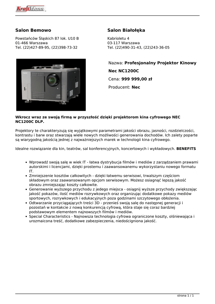 Salon Bemowo Salon Białołęka Powstańców Śląskich 87 lok. U10 B 01-466 Warszawa Tel. (22)427-89-95, (22)398-73-32 Kabrioletu 4 03-117 Warszawa Tel. (22)490-31-43, (22)243-36-05 Nazwa: Profesjonalny Projektor Kinowy Nec NC1200C Cena: 999 999,00 zł Producent: Nec Wkrocz wraz ze swoją firmą w przyszłość dzięki projektorom kina cyfrowego NEC NC1200C DLP. Projektory te charakteryzują się wyjątkowymi parametrami jakości obrazu, jasności, rozdzielczości, kontrastu i barw oraz stwarzają wiele nowych możliwości generowania dochodów. Ich zalety poparte są wiarygodną jakością jednej z najważniejszych marek w technologii kina cyfrowego. Idealne rozwiązanie dla kin, teatrów, sal konferencyjnych, koncertowych i wykładowych. BENEFITS Wprowadź swoją salę w wiek IT - łatwa dystrybucja filmów i mediów z zarządzaniem prawami autorskimi i licencjami, dzięki prostemu i zaawansowanemu wykorzystaniu nowego formatu IT. Zmniejszenie kosztów całkowitych - dzięki łatwemu serwisowi, trwalszym częściom składowym oraz zaawansowanym opcjom serwisowym. Możesz osiagnąć lepszą jakość obrazu zmniejszając koszty całkowite. Generowanie wyższego przychodu z jedego miejsca - osiągnij wyższe przychody zwiększając jakość pokazów, ilość mediów rozrywkowych oraz organizując dodatkowe pokazy mediów sportowych, rozrywkowych i edukacyjnych poza godzinami szczytowego obłożenia. Odtwarzanie przyciągających treści 3D - przenieś swoją salę do następnej generacji i pozostań w kontakcie z nową konkurencją cyfrową, która staje się coraz bardziej podstawowym elementem najnowszych filmów i mediów. Special Characteristics - Najnowsza technologia cyfrowa ograniczone koszty, olśniewająca i urozmaicona treść, dodatkowe zabezpieczenia, niedościgniona jakość. strona 1 / 1 Powered by TCPDF (www.tcpdf.org)