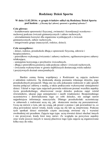 Rodzinny Dzień Sportu W dniu 11.02.2014r. w grupie 6-latków odbył się Rodzinny Dzień Sportu pod hasłem : „Chcemy być zdrowi, sprawni o zgrabnej sylwetce”. Cele główne: - kształtowanie sprawności fizycznej, zwinności i koordynacji wzrokowo – ruchowej podczas ćwiczeń gimnastycznych i zabaw ruchowych, - uświadamianie korzyści dla organizmu wynikających z ćwiczeń gimnastycznych, zabaw ruchowych, - integrowanie grupy (nauczyciel, rodzice, dzieci). Cele szczegółowe: - dzieci, rodzice, przedszkole dbają o sprawność fizyczną, zdrowie i bezpieczeństwo, - prawidłowo wykonują ćwiczenia i zabawy ruchowe, ogólnorozwojowe zabawy relaksujące, - umiejętnie korzystają z przyborów ćwiczebnych, - dbają o prawidłową postawę ciała podczas zabaw i ćwiczeń ruchowych, - ćwiczenia wykonywane w gronie najbliższych dostarczają wielu radości i pozytywnych doznań emocjonalnych. Bardzo cenną formą współpracy z Rodzicami są zajęcia ruchowe z udziałem rodziców. Są doskonałą okazją poznania własnego dziecka, jego przedszkolnych przyjaciół. Mają one na celu pokazanie rodzicom w jaki sposób można połączyć zabawę z nauką, a także praktycznie wykorzystać umiejętności dzieci. Udział w tego typu zajęciach pozwala rodzicom poznać wszelkie aspekty życia przedszkolnego, obserwować swoje dziecko podczas zajęć wśród rówieśników, ukazać jego umiejętności i zasób wiadomości. Bezpośredniego uczestnictwa i doświadczenia tego co robi dziecko, nie zastąpi nawet najpełniejsza informacja nauczyciela. Dlatego przedszkolaki uczestnicząc w zabawach z rodzicami uczą się, jak skutecznie można się porozumiewać. Uczą się mówić o tym, jak się czują, jak prosić o pomoc i jak powiedzieć to, co chcą powiedzieć nawet wtedy, kiedy czują się źle lub są zmartwione. Podczas tych spotkań dzieci nieśmiałe często zaczynają otwierać się i wyrażać swobodniej niż przedtem. Zajęcia tego typu uczą również dzieci słuchać innych i nie przerywać, kiedy ktoś inny mówi. Ze względu na powyższe aspekty oraz wiele jeszcze innych w naszej placówce tego typu zajęcia są organizowane kilka razy do roku.