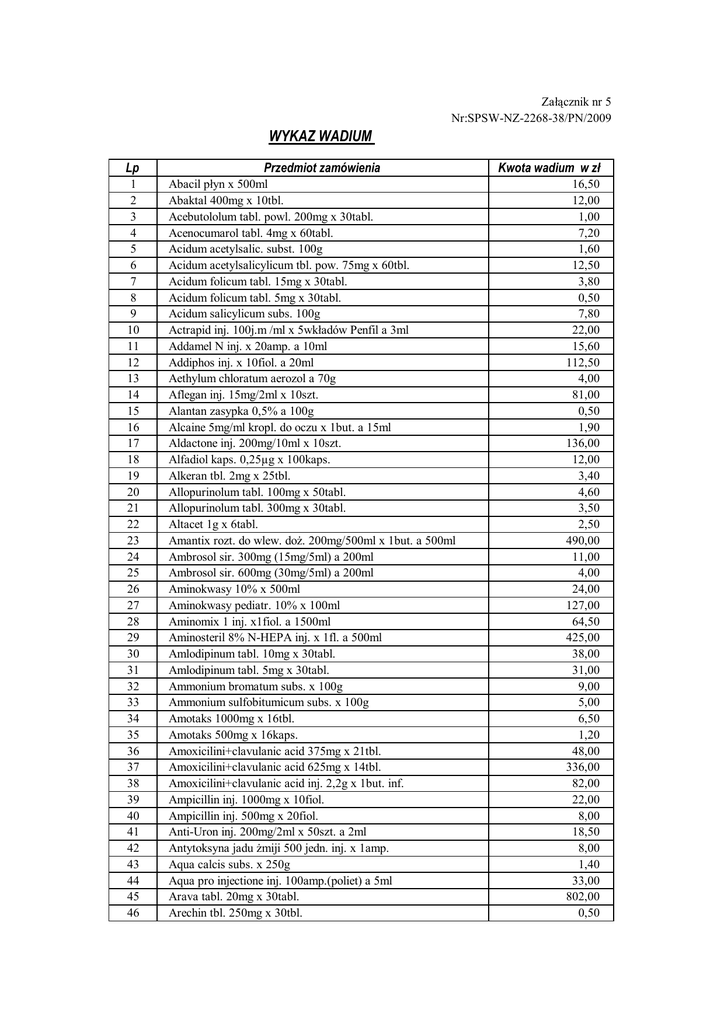 Załącznik nr 5 Nr:SPSW-NZ-2268-38/PN/2009 WYKAZ WADIUM Lp 1 2 3 4 5 6 7 8 9 10 11 12 13 14 15 16 17 18 19 20 21 22 23 24 25 26 27 28 29 30 31 32 33 34 35 36 37 38 39 40 41 42 43 44 45 46 Przedmiot zamówienia Abacil płyn x 500ml Abaktal 400mg x 10tbl. Acebutololum tabl. powl. 200mg x 30tabl. Acenocumarol tabl. 4mg x 60tabl. Acidum acetylsalic. subst. 100g Acidum acetylsalicylicum tbl. pow. 75mg x 60tbl. Acidum folicum tabl. 15mg x 30tabl. Acidum folicum tabl. 5mg x 30tabl. Acidum salicylicum subs. 100g Actrapid inj. 100j.m /ml x 5wkładów Penfil a 3ml Addamel N inj. x 20amp. a 10ml Addiphos inj. x 10fiol. a 20ml Aethylum chloratum aerozol a 70g Aflegan inj. 15mg/2ml x 10szt. Alantan zasypka 0,5% a 100g Alcaine 5mg/ml kropl. do oczu x 1but. a 15ml Aldactone inj. 200mg/10ml x 10szt. Alfadiol kaps. 0,25µg x 100kaps. Alkeran tbl. 2mg x 25tbl. Allopurinolum tabl. 100mg x 50tabl. Allopurinolum tabl. 300mg x 30tabl. Altacet 1g x 6tabl. Amantix rozt. do wlew. doż. 200mg/500ml x 1but. a 500ml Ambrosol sir. 300mg (15mg/5ml) a 200ml Ambrosol sir. 600mg (30mg/5ml) a 200ml Aminokwasy 10% x 500ml Aminokwasy pediatr. 10% x 100ml Aminomix 1 inj. x1fiol. a 1500ml Aminosteril 8% N-HEPA inj. x 1fl. a 500ml Amlodipinum tabl. 10mg x 30tabl. Amlodipinum tabl. 5mg x 30tabl. Ammonium bromatum subs. x 100g Ammonium sulfobitumicum subs. x 100g Amotaks 1000mg x 16tbl. Amotaks 500mg x 16kaps. Amoxicilini+clavulanic acid 375mg x 21tbl. Amoxicilini+clavulanic acid 625mg x 14tbl. Amoxicilini+clavulanic acid inj. 2,2g x 1but. inf. Ampicillin inj. 1000mg x 10fiol. Ampicillin inj. 500mg x 20fiol. Anti-Uron inj. 200mg/2ml x 50szt. a 2ml Antytoksyna jadu żmiji 500 jedn. inj. x 1amp. Aqua calcis subs. x 250g Aqua pro injectione inj. 100amp.(poliet) a 5ml Arava tabl. 20mg x 30tabl. Arechin tbl. 250mg x 30tbl. Kwota wadium w zł 16,50 12,00 1,00 7,20 1,60 12,50 3,80 0,50 7,80 22,00 15,60 112,50 4,00 81,00 0,50 1,90 136,00 12,00 3,40 4,60 3,50 2,50 490,00 11,00 4,00 24,00 127,00 64,50 425,00 38,00 31,00 9,00 5,00 6,50 1,20 48,00 336,00 82,00 22,00 8,00 18,50 8,00 1,40 33,00 802,00 0,50 47 48 49 50 51 52 53 54 55 56 57 58 59 60 61 62 63 64 65 66 67 68 69 70 71 72 73 74 75 76 77 78 79 80 81 82 83 84 85 86 87 88 89 90 91 92 93 94 95 96 97 Argentum nitricum subs. x 10g Argosulfan 2% krem a 400g Ascodan x 10tbl. Atenolol tabl. 50mg x 30tabl. Atropinum sulfur. inj. 0,5mg/ml x 10szt. Atropinum sulfur. inj. 1mg/ml x 10szt. Atrovent N areozol 200dawek x 1but. Atrovent roz. do inhal. 0,25mg/ml x 1but. x 20ml Avastin inj. 100mg x 1fiol. Avastin inj. 400mg x 1fiol. Baclofen 10mg x 50tbl. Baclofen 25mg x 50tbl. Balsamum Peruvianum subs. x 100g Barium sulfuricum zaw. 1g/ml a 200ml Bebilon Pepti 1 prosz. x puszka a 450g Bebilon Pepti 2 prosz. x puszka a 450g Benzyna apteczna płyn x 1000ml Betahistine dihydrochloride 24mg x 20tbl. Betaloc inj. 1mg/ml x 5amp. a 5ml Biodacyna gutt. opht. 3mg/ml x 1but. a 5ml Biodacyna inj. 250ml/2ml x 1fiol. a 2ml Biodacyna inj. 500ml/2ml x 1fiol. a 2ml Biodribin inj. 10mg/10ml x 1fiol. a 10ml Bisacodyl 10mg x 5supp. doodbytniczych Bisacodyl 5mg x 30tbl. Biseptol inj. 480mg/5ml x 10szt. Bisoprololum fumarate tabl. 10mg x 30tabl. Bisoprololum fumarate tabl. 5mg x 30tabl. Bleocin inj. 15mg x 1fiol. Bromocriptine tabl. 2,5mg x 30tabl. Bupivacaina Spinal 0,5% Heavy inj. 5mg/ml x 5fiol. a 4ml Bupivacainum h/chloridum WZF 0,5% 5mg/ml x 10amp.a10ml Butapirazol 250mg czop. x 5szt Butapirazol 5% maść x 30g Calcium carb. preaecip. subst. 1000g Calcium Resonium proszek dous. x 300g Captoprilum 12,5mg x 30tabl. Carbo medicinalis 300mg x 20tbl. Carboplatin inj. 150mg/45ml x 1fiol. Carboplatin inj. 450mg/15ml x 1fiol. Carboplatin inj. 50mg/5ml x 1fiol. Carvedilolum tabl. 12,5mg x 30tabl. Carvedilolum tabl. 6,25mg x 30tabl. Cefotaximum inj. 1000mg x 1fiol. Ceftazydym inj. 1g x 1fiol. Ceftriaxone inj. 1g x 1fiol. Cefuroksym inj. 1,5g x 1fiol. Cefuroksym inj. 750mg x 1fiol. Cefuroksym inj. 750mg x 1fiol. Cefuroksym zaw. doust. 125mg/5ml x 1but. a 100ml Cefuroxime axetil 250mg x 10tbl. Powl. 5,50 33,00 1,70 0,20 75,50 19,00 53,00 139,00 745,00 959,00 2,00 1,20 1,00 28,00 12,00 12,00 60,00 35,00 90,00 14,00 44,00 251,50 75,00 23,00 2,00 111,00 8,50 23,00 125,00 2,85 496,00 9,00 5,70 14,00 15,50 35,40 3,50 6,80 16,00 54,00 6,00 18,00 24,00 210,00 3 132,00 277,50 1 625,00 632,00 8,00 6,50 9,50 98 99 100 101 102 103 104 105 106 107 108 109 110 111 112 113 114 115 116 117 118 119 120 121 122 123 124 125 126 127 128 129 130 131 132 133 134 135 136 137 138 139 140 141 142 143 144 145 146 147 148 Cefuroxime axetil 500mg x 10tbl. powl. Celipres 100mg x 30tabl. Celipres 200mg x 30tabl. Cetirizinum kropl. doust. 10mg/ml x 1but. a 10ml Cetirizinum tabl. powl. 10mg x 20tabl. Chlorhexidinum Glucon. 20% płyn a 500ml Chlorsuccilin inj. 200mg x 10szt. Cilazaprilum 0,5mg x 30tbl. Cilazaprilum tabl. 1mg x 30tabl. Cilazaprilum tabl. 2,5mg x 30tabl. Cilazaprilum tabl. 5mg x 30tabl. Ciprofloxacin lactate inj. 100mg/10ml x 10amp. a 10ml Ciprofloxacinum tabl. powl. 250mg x 10tabl. Ciprofloxacinum tabl. powl. 500mg x 10tabl. Clarithromycin 500mg x 14tbl. Clemastin 1mg x 30tbl. Clemastin inj. 2mg/2ml x 5szt. Clemastin sir. 0,5mg/5ml x 1but. a 100ml Clexane inj. 20mg/0,2ml x 10amp-strz. Clexane inj. 40mg/0,4ml x 10amp-strz. Clexane inj. 60mg/0,6ml x 2amp-strz. Clexane inj. 80mg/0,8ml x 2amp-strz. Clindamycin 300mg x 16szt. Clindamycinum inj. 150mg/ml x 5amp. a 2ml Clindamycinum inj. 150mg/ml x 5amp. a 4ml Clonazepamum tabl. 0,5mg x 30tabl. Clonazepamum tabl. 2mg x 30tabl. Clotrimazol 100mg x 6tbl. dopochwowych Clotrimazolum 1% krem x 1tuba a 20g Co-trimoxazolum tabl. (480mg) x 20tabl. Co-trimoxazolum zaw. doust. (syrop) 240mg/5ml a 100ml Coaxil 12,5mg x 30tabl. Codofix nr 14 x 1m Codofix nr 4 x 1m Codofix nr 6 x 1m Codofix nr 8 x 1m Colchicum-Dispert tabl. 0,5mg x 50tabl. Colistin inj. 1mln. x 1szt. Concor Cor 1,25mg x 28tbl. Concor Cor 2,5mg x 28tbl. Cordarone inj. 50mg/ml x 6amp.a 3ml Corhydron inj. 100mg/2ml x 5szt. + rozp. Corhydron inj. 25