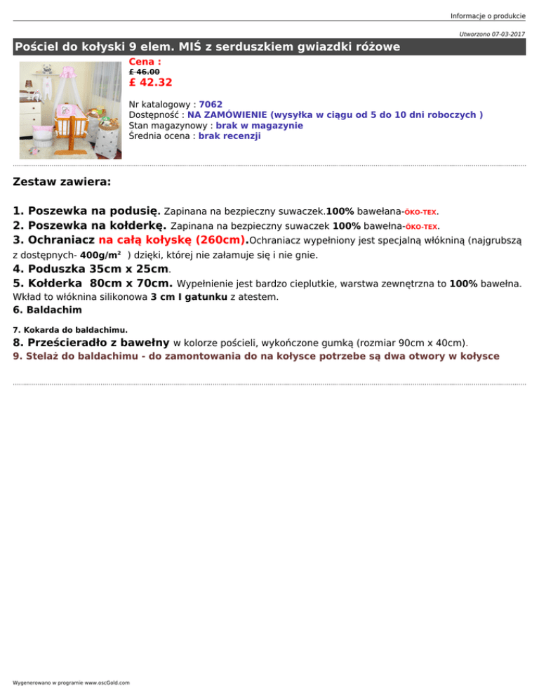 Informacje o produkcie Utworzono 07-03-2017 Pościel do kołyski 9 elem. MIŚ z serduszkiem gwiazdki różowe Cena : £ 46.00 £ 42.32 Nr katalogowy : 7062 Dostępność : NA ZAMÓWIENIE (wysyłka w ciągu od 5 do 10 dni roboczych ) Stan magazynowy : brak w magazynie Średnia ocena : brak recenzji Zestaw zawiera: 1. Poszewka na podusię. Zapinana na bezpieczny suwaczek.100% bawełana-ÖKO-TEX. 2. Poszewka na kołderkę. Zapinana na bezpieczny suwaczek 100% bawełna-ÖKO-TEX. 3. Ochraniacz na całą kołyskę (260cm).Ochraniacz wypełniony jest specjalną włókniną (najgrubszą z dostępnych- 400g/m2 ) dzięki, której nie załamuje się i nie gnie. 4. Poduszka 35cm x 25cm. 5. Kołderka 80cm x 70cm. Wypełnienie jest bardzo cieplutkie, warstwa zewnętrzna to 100% bawełna. Wkład to włóknina silikonowa 3 cm I gatunku z atestem. 6. Baldachim 7. Kokarda do baldachimu. 8. Prześcieradło z bawełny w kolorze pościeli, wykończone gumką (rozmiar 90cm x 40cm). 9. Stelaż do baldachimu - do zamontowania do na kołysce potrzebe są dwa otwory w kołysce Wygenerowano w programie www.oscGold.com