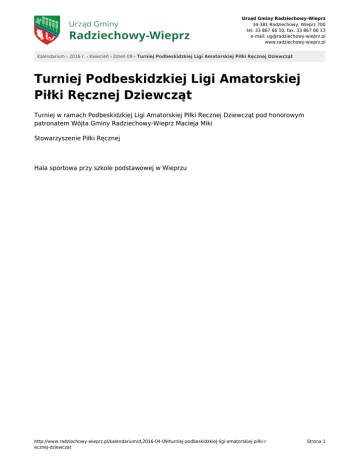 Urząd Gminy Radziechowy-Wieprz 34-381 Radziechowy, Wieprz 700 tel. 33 867 66 10, fax. 33 867 66 13 e-mail: [email protected] www.radziechowy-wieprz.pl Kalendarium › 2016 r. › Kwiecień › Dzień 09 › Turniej Podbeskidzkiej Ligi Amatorskiej Piłki Ręcznej Dziewcząt Turniej Podbeskidzkiej Ligi Amatorskiej Piłki Ręcznej Dziewcząt Turniej w ramach Podbeskidzkiej Ligi Amatorskiej Piłki Recznej Dziewcząt pod honorowym patronatem Wójta Gminy Radziechowy-Wieprz Macieja Miki Stowarzyszenie Piłki Ręcznej Hala sportowa przy szkole podstawowej w Wieprzu http://www.radziechowy-wieprz.pl/kalendarium/d,2016-04-09/turniej-podbeskidzkiej-ligi-amatorskiej-pilki-r ecznej-dziewczat Strona 1