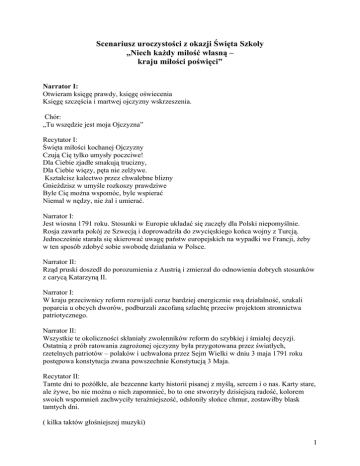 Scenariusz uroczystości z okazji Święta Szkoły „Niech każdy miłość własną – kraju miłości poświęci” Narrator I: Otwieram księgę prawdy, księgę oświecenia Księgę szczęścia i martwej ojczyzny wskrzeszenia. Chór: „Tu wszędzie jest moja Ojczyzna” Recytator I: Święta miłości kochanej Ojczyzny Czują Cię tylko umysły poczciwe! Dla Ciebie zjadłe smakują trucizny, Dla Ciebie więzy, pęta nie zelżywe. Kształcisz kalectwo przez chwalebne blizny Gnieździsz w umyśle rozkoszy prawdziwe Byle Cię można wspomóc, byle wspierać Niemal w nędzy, nie żal i umierać. Narrator I: Jest wiosna 1791 roku. Stosunki w Europie układać się zaczęły dla Polski niepomyślnie. Rosja zawarła pokój ze Szwecją i doprowadziła do zwycięskiego końca wojny z Turcją. Jednocześnie starała się skierować uwagę państw europejskich na wypadki we Francji, żeby w ten sposób zdobyć sobie swobodę działania w Polsce. Narrator II: Rząd pruski doszedł do porozumienia z Austrią i zmierzał do odnowienia dobrych stosunków z carycą Katarzyną II. Narrator I: W kraju przeciwnicy reform rozwijali coraz bardziej energicznie swą działalność, szukali poparcia u obcych dworów, podburzali zacofaną szlachtę przeciw projektom stronnictwa patriotycznego. Narrator II: Wszystkie te okoliczności skłaniały zwolenników reform do szybkiej i śmiałej decyzji. Ostatnią z prób ratowania zagrożonej ojczyzny była przygotowana przez światłych, rzetelnych patriotów – polaków i uchwalona przez Sejm Wielki w dniu 3 maja 1791 roku postępowa konstytucja zwana powszechnie Konstytucją 3 Maja. Recytator II: Tamte dni to pożółkłe, ale bezcenne karty historii pisanej z myślą, sercem i o nas. Karty stare, ale żywe, bo nie można o nich zapomnieć, bo to one stworzyły dzisiejszą radość, kolorem swoich wspomnień zachwyciły teraźniejszość, odsłoniły słońce chmur, zostawiłby blask tamtych dni. ( kilka taktów głośniejszej muzyki) 1 Recytator III: Korzystam z najstarszego prawa wyobraźni i przywołuję zmarłych, Wypatruję ich twarzy, nadsłuchuję kroków, chociaż wiem, że kto umarł, ten umarł dokładnie, Umarłych wieczność dotąd trwa, dokąd pamięcią się im płaci. Ziemia wre – a to oni, którzy ś już ziemią, wstają grudka po grudce, garstka obok garstki Wychodzą z przemilczenia, wracają do imion, do pamięci narodu, do wieńców i barw. Recytator I: Oto oni: Stanisław Małachowski – marszałek Sejmu Wielkiego Ignacy i Stanisław Potoccy Hugo Kołłątaj Józef Wybicki Stanisław Staszic Stanisław August Poniatowski. Chór: „Mazurek 3 Maja”. Recytator IV: Nie stawali w szeregu, nie przelewali krwi Piersi nie zdobiły nie zagojone blizny A jednak za wolność, za całość swej Ojczyzny Przeciw przemocy wroga z odwagą w sercu szli Prawość, mądrość i miłość – taką była ich broń Budowali od podstaw, tworzyli nowe życie Jad, który w polską duszę wróg tajny sączył skrycie, Zwalczali, losy Polski w męską ujmując dłoń I nadszedł oto wielki, niezapomniany dzień Majowa pieśń zabrzmiała po wszystkie polski krańce Przeciwko wrogiej sile wzniesione oto szańce, Szlachetnej myśli płomień zwyciężył mroków cień I taka popłynęła słoneczna w tym wieść, By płynąć przez wieki, serc wiernych głosząc sławę… Za trudy ich, za walki zwycięskie a bezkrwawe Twórcom Dnia Majowego po wieczne czasy cześć. Recytator II: (podkład muzyczny) Zatrzepotały się chorągwie nasze, Polska przywdziała piękny strój godowy; Pod błękitami nuci śpiewne ptaszę W ranek majowy Zajaśniał w złotym słońcu dzień radosny, Niezapomniany nigdy a uroczy. Uczuciem dumy dzień ów polskiej wiosny Wszystkich jednoczy. Nad całym krajem pieśń dzwonów zabrzmiała I na dziękczynną modlitwę nas woła: 2 Cześć Bogu wieczna! Maryi Pannie chwała. Pochylmy czoła! Uczcijmy wszyscy pamięć dnia wielkiego Niech radość niesie nam dzień Trzeci Maja Niech wśród nas żyje duch Małachowskiego i Kołłątaja Chór: „Zgoda sejmu”. Recytator III: Brzmi Polonez 3 Maja - skoczne jego dźwięki Radością oddychają, radością słuch poją Dziewki chcą tańczyć chłopcy w miejscu nie dostoją Lecz starców myśli z dźwiękiem w przeszłość się uniosły, W owe lata szczęśliwe, gdy senat i posły Po dniu Trzeciego Maja w ratuszowej Sali Zgodzonego z narodem króla fetowali Gdy przy tańcu śpiewano: Wiwat król kochany! Wiwat Sejm, wiwat Naród, Wiwat wszystkie Stany. Narrator II: Stronnictwo patriotyczne Sejmu Czteroletniego przeprowadziło ważne reformy w politycznym i społecznym ustroju Polski. Zniesiono liberum veto i wolną elekcję. Konstytucja zapowiadała chłopom „opiekę prawa i rządu krajowego”, ustalała podstawy ustroju Rzeczypospolitej. Narrator I: Oto słowa sejmowego manifestu: „Ojczyzna nasza jest już ocalona. Swobody nasze zabezpieczone. Jesteśmy odtąd narodem wolnymi niepodległym. Opadły pęta niewoli i nierządu”. Narrator II: Niestety, nie wszyscy chcieli się pogodzić z nowym porządkiem: „Ażeby w Polszcze równo chłop, mieszczuch, duchowny Miał być tak dobry człowiek jak szlachcic herbowy”. Recytator: Tego się pióro boi dotknąć przy pisaniu, Ale myśli niech będą twarde i surowe, Bo już nieraz w kochaniu traciliśmy głowę Obłapiając Ojczyznę! A ona musi co dzień być na miarę oczu, Inaczej łeb z jej ramion w przepaść się potoczy Krew tryśnie z boku…. Narrator II: 3 Przeciwnicy reform – zdrajcy narodu zawiązali konfederację targowicką. Targowiczanie przy pomocy Katarzyny II kilka miesięcy rządzili krajem. Ostatecznie doszło do II rozbioru Polski w 1793r. Targowica stała się symbolem zdrady narodowej. Recytator III: Mistrz coraz takty nagli i tony natęża, A wtem, puścił fałszywy akord jak syk węża Jak zgrzyt żelaza po szkle i przejął wszystkich dreszczem I wesołość pomieszał z poczuciem złowieszczem. Nie zmyli