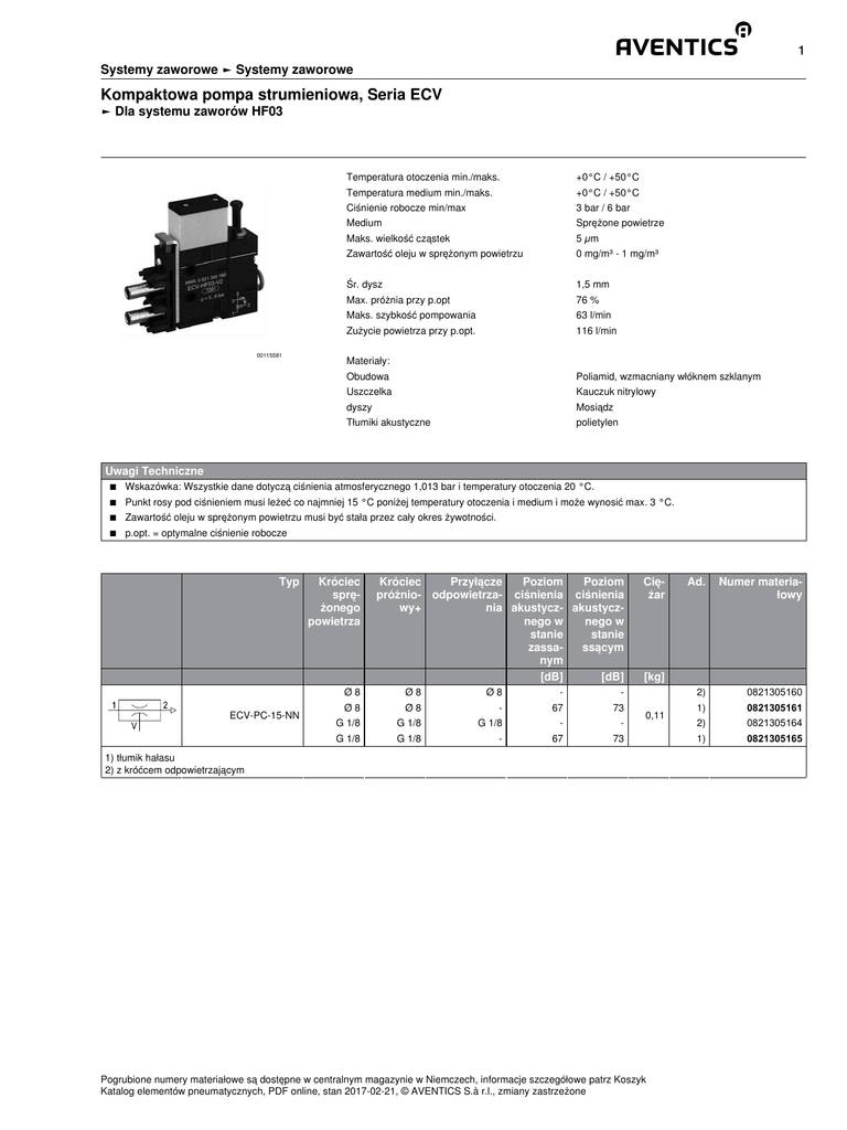 1 Systemy zaworowe ► Systemy zaworowe Kompaktowa pompa strumieniowa, Seria ECV ► Dla systemu zaworów HF03 Temperatura otoczenia min./maks. +0°C / +50°C Temperatura medium min./maks. +0°C / +50°C Ciśnienie robocze min/max 3 bar / 6 bar Medium Sprężone powietrze Maks. wielkość cząstek 5 µm Zawartość oleju w sprężonym powietrzu 0 mg/m³ - 1 mg/m³ Śr. dysz 1,5 mm Max. próżnia przy p.opt 76 % Maks. szybkość pompowania 63 l/min Zużycie powietrza przy p.opt. 00115581 116 l/min Materiały: Obudowa Poliamid, wzmacniany włóknem szklanym Uszczelka Kauczuk nitrylowy dyszy Mosiądz Tłumiki akustyczne polietylen Uwagi Techniczne ■ Wskazówka: Wszystkie dane dotyczą ciśnienia atmosferycznego 1,013 bar i temperatury otoczenia 20 °C. ■ Punkt rosy pod ciśnieniem musi leżeć co najmniej 15 °C poniżej temperatury otoczenia i medium i może wynosić max. 3 °C. ■ Zawartość oleju w sprężonym powietrzu musi być stała przez cały okres żywotności. ■ p.opt. = optymalne ciśnienie robocze Typ Króciec sprężonego powietrza Ø8 ECV-PC-15-NN Króciec Przyłącze Poziom Poziom próżnio- odpowietrza- ciśnienia ciśnienia wy+ nia akustycz- akustycznego w nego w stanie stanie zassassącym nym [dB] [dB] Ø8 Ø8 - - Ø8 Ø8 - 67 73 G 1/8 G 1/8 G 1/8 - - G 1/8 G 1/8 - 67 73 Ciężar [kg] 0,11 1) tłumik hałasu 2) z króćcem odpowietrzającym Pogrubione numery materiałowe są dostępne w centralnym magazynie w Niemczech, informacje szczegółowe patrz Koszyk Katalog elementów pneumatycznych, PDF online, stan 2017-02-21, © AVENTICS S.à r.l., zmiany zastrzeżone Ad. Numer materiałowy 2) 0821305160 1) 0821305161 2) 0821305164 1) 0821305165 2 Systemy zaworowe ► Systemy zaworowe Kompaktowa pompa strumieniowa, Seria ECV ► Dla systemu zaworów HF03 Próżnia p2 w zależności od ciśnienia roboczego p1 p2 [%] 90 1) 80 70 60 50 40 30 20 2 2,5 3 3,5 4 4,5 5 5,5 6 p1 [bar] 00115828 1) optymalne ciśnienie robocze Szybkość pompowania qs w zależności od ciśnienia roboczego p1 q S [l/min] 70 1) 65 60 55 50 45 40 2 2,5 3 3,5 4 4,5 5 5,5 6 p1 [bar] 00115827 1) optymalne ciśnienie robocze czas ewakuacji tE w zależności od próżni p2 dla objętości 1 l (przy optymalnym ciśnieniu roboczym p1opt) tE [s/l] 1,8 1,6 1,4 1,2 1 0,8 0,6 0,4 0,2 0 5 10 20 30 40 50 60 70 p 2 [%] 00127803 Pogrubione numery materiałowe są dostępne w centralnym magazynie w Niemczech, informacje szczegółowe patrz Koszyk Katalog elementów pneumatycznych, PDF online, stan 2017-02-21, © AVENTICS S.à r.l., zmiany zastrzeżone 3 Systemy zaworowe ► Systemy zaworowe Kompaktowa pompa strumieniowa, Seria ECV ► Dla systemu zaworów HF03 Zużycie powietrza qv w zależności od ciśnienia roboczego p1 q V [l/min] 160 140 1) 120 100 80 60 40 20 0 2,5 2 3 3,5 4 4,5 5 5,5 6 p1 [bar] 00115829 1) optymalne ciśnienie robocze ECV-PC-15-A, z króćcem odpowietrzającym 82,50 69 45 5,20 6 70,70 54,60 49 8 8 18,75 10,70 16 28,50 17 8 17 3) 58,65 4) 15,30 88,10 2) 1) 5) 6) 8 00115835 1. króciec powietrza (ssanie) 2) króciec próżniowy 3) przyłącze impulsu odrzutowego 4) dławik impulsu odrzutowego 5) króciec odpowietrzający 6) Element dystansowy Pogrubione numery materiałowe są dostępne w centralnym magazynie w Niemczech, informacje szczegółowe patrz Koszyk Katalog elementów pneumatycznych, PDF online, stan 2017-02-21, © AVENTICS S.à r.l., zmiany zastrzeżone 4 Systemy zaworowe ► Systemy zaworowe Kompaktowa pompa strumieniowa, Seria ECV ► Dla systemu zaworów HF03 ECV-HF03-...z zasterowaniem NO ECV-HF03-...z zasterowaniem NC 5 (R) 2 (V) 1 3 4 2 5 (R) 2 (V) 1 3 4 2 B) A) 3 3 3 3 1 1 1 1 5 5 5 A) B) 5 00127821 00127822 A) króciec powietrza (ssanie) B) króciec powietrza impulsu odrzutowego ECV-PC-15-A, tłumik hałasu 82,50 69 45 5,20 5) 6 3) 75 49 8 8 17 18,75 10,70 16 28,50 17 8 58,65 4) 15,30 88,10 2) 1) 8) 00115836 1. króciec powietrza (ssanie) 2) króciec próżniowy 3) przyłącze impulsu odrzutowego 4) dławik impulsu odrzutowego 5) tłumik akustyczny 6) Element dystansowy Pogrubione numery materiałowe są dostępne w centralnym magazynie w Niemczech, informacje szczegółowe patrz Koszyk Katalog elementów pneumatycznych, PDF online, stan 2017-02-21, © AVENTICS S.à r.l., zmiany zastrzeżone 5 Systemy zaworowe ► Systemy zaworowe Kompaktowa pompa strumieniowa, Seria ECV ► Dla systemu zaworów HF03 ECV-HF03-...z zasterowaniem NO ECV-HF03-...z zasterowaniem NC 2 (V) 2 (V) 5 (R) A) 5 (R) 1 3 4 2 B) A) 1 3 4 2 B) 3 3 3 3 1 1 1 1 5 5 5 5 00127824 00127823 A) króciec powietrza (ssanie) B) króciec powietrza impulsu odrzutowego ECV-PC-15-A, z króćcem odpowietrzającym 76 69 45 5,20 49 G1/8 G1/8 17 18,75 10,70 16 28,50 17 G1/8 61 3) 58,65 4) 70,70 6 15,30 6 2) 77,20 1) 5) G1/8 00115839 1. króciec powietrza (ssanie) 2) króciec próżniowy 3) przyłącze impulsu odrzutowego 4) dławik impulsu odrzutowego 5) króciec odpowietrzający Pogrubione numery materiałowe są dostępne w centralnym magazynie w Niemczech, informacje szczegółowe patrz Koszyk Katalog elementów pneumatycznych, PDF online, stan 2017-02-21, © AVENTICS S.à r.l., zmiany zastrzeżone 6 Systemy zaworowe ► Systemy zaworowe Kompaktowa pompa strumieniowa, Seria ECV ► Dla systemu zaworów HF03 ECV-HF03-...z zasterowaniem NO ECV-HF03-...z zasterowaniem NC 5 (R) 2 (V) 1 3 4 2 5 (R) 2 (V) 1 3 4 2 B) A) 3 3 3 3 1 1 1 1 5 5 5 A) B) 5 00127821 00127822 A) króciec powietrza (ssanie) B) króciec powietrza impulsu odrzutowego ECV-PC-15-A, tłumik hałasu 76 69 45 5,20 5) 6 3) 49 G1/8 15,30 G1/8 17 18,75 10,70 16 28,50 17 G1/8 58,65 75 4) 6 2) 1) 77,20 00115840 1. króciec powietrza (ssanie) 2) króciec próżniowy 3) przyłącze impulsu odrzutowego 4) dławik impulsu odrzutowego 5) tłumik akustyczny Pogrubione numery materiałowe są dostępne w centralnym magazynie w Niemczech, informacje szczegółowe patrz Koszyk Katalog elementów pneumatycznych, PDF online, stan 2017-02-21, © AVENTICS S.à r.l., zmiany zastr