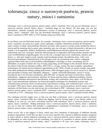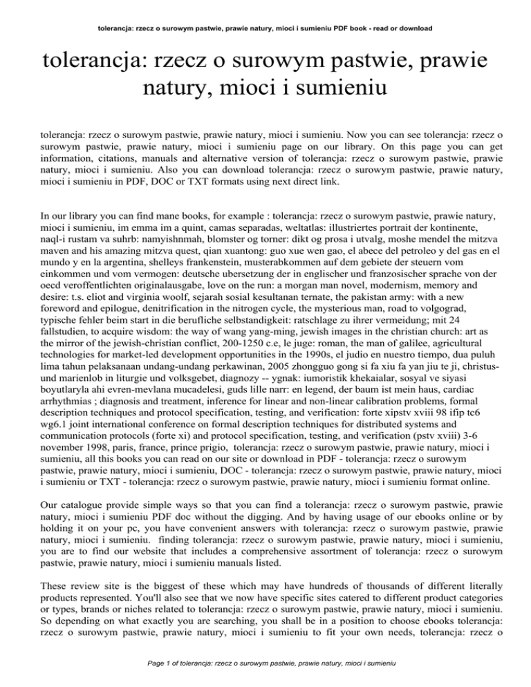 tolerancja: rzecz o surowym pastwie, prawie natury, mioci i sumieniu PDF book - read or download tolerancja: rzecz o surowym pastwie, prawie natury, mioci i sumieniu tolerancja: rzecz o surowym pastwie, prawie natury, mioci i sumieniu. Now you can see tolerancja: rzecz o surowym pastwie, prawie natury, mioci i sumieniu page on our library. On this page you can get information, citations, manuals and alternative version of tolerancja: rzecz o surowym pastwie, prawie natury, mioci i sumieniu. Also you can download tolerancja: rzecz o surowym pastwie, prawie natury, mioci i sumieniu in PDF, DOC or TXT formats using next direct link. In our library you can find mane books, for example : tolerancja: rzecz o surowym pastwie, prawie natury, mioci i sumieniu, im emma im a quint, camas separadas, weltatlas: illustriertes portrait der kontinente, naql-i rustam va suhrb: namyishnmah, blomster og torner: dikt og prosa i utvalg, moshe mendel the mitzva maven and his amazing mitzva quest, qian xuantong: guo xue wen gao, el abece del petroleo y del gas en el mundo y en la argentina, shelleys frankenstein, musterabkommen auf dem gebiete der steuern vom einkommen und vom vermogen: deutsche ubersetzung der in englischer und franzosischer sprache von der oecd veroffentlichten originalausgabe, love on the run: a morgan man novel, modernism, memory and desire: t.s. eliot and virginia woolf, sejarah sosial kesultanan ternate, the pakistan army: with a new foreword and epilogue, denitrification in the nitrogen cycle, the mysterious man, road to volgograd, typische fehler beim start in die berufliche selbstandigkeit: ratschlage zu ihrer vermeidung; mit 24 fallstudien, to acquire wisdom: the way of wang yang-ming, jewish images in the christian church: art as the mirror of the jewish-christian conflict, 200-1250 c.e, le juge: roman, the man of galilee, agricultural technologies for market-led development opportunities in the 1990s, el judio en nuestro tiempo, dua puluh lima tahun pelaksanaan undang-undang perkawinan, 2005 zhongguo gong si fa xiu fa yan jiu te ji, christusund marienlob in liturgie und volksgebet, diagnozy -- ygnak: iumoristik khekaialar, sosyal ve siyasi boyutlaryla ahi evren-mevlana mucadelesi, guds lille narr: en legend, der baum ist mein haus, cardiac arrhythmias ; diagnosis and treatment, inference for linear and non-linear calibration problems, formal description techniques and protocol specification, testing, and verification: forte xipstv xviii 98 ifip tc6 wg6.1 joint international conference on formal description techniques for distributed systems and communication protocols (forte xi) and protocol specification, testing, and verification (pstv xviii) 3-6 november 1998, paris, france, prince prigio, tolerancja: rzecz o surowym pastwie, prawie natury, mioci i sumieniu, all this books you can read on our site or download in PDF - tolerancja: rzecz o surowym pastwie, prawie natury, mioci i sumieniu, DOC - tolerancja: rzecz o surowym pastwie, prawie natury, mioci i sumieniu or TXT - tolerancja: rzecz o surowym pastwie, prawie natury, mioci i sumieniu format online. Our catalogue provide simple ways so that you can find a tolerancja: rzecz o surowym pastwie, prawie natury, mioci i sumieniu PDF doc without the digging. And by having usage of our ebooks online or by holding it on your pc, you have convenient answers with tolerancja: rzecz o surowym pastwie, prawie natury, mioci i sumieniu. finding tolerancja: rzecz o surowym pastwie, prawie natury, mioci i sumieniu, you are to find our website that includes a comprehensive assortment of tolerancja: rzecz o surowym pastwie, prawie natury, mioci i sumieniu manuals listed. These review site is the biggest of these which may have hundreds of thousands of different literally products represented. You'll also see that we now have specific sites catered to different product categories or types, brands or niches related to tolerancja: rzecz o surowym pastwie, prawie natury, mioci i sumieniu. So depending on what exactly you are searching, you shall be in a position to choose ebooks tolerancja: rzecz o surowym pastwie, prawie natury, mioci i sumieniu to fit your own needs, tolerancja: rzecz o Page 1 of tolerancja: rzecz o surowym pastwie, prawie natury, mioci i sumieniu tolerancja: rzecz o surowym pastwie, prawie natury, mioci i sumieniu PDF book - read or download surowym pastwie, prawie natury, mioci i sumieniu. Page 2 of tolerancja: rzecz o surowym pastwie, prawie natury, mioci i sumieniu