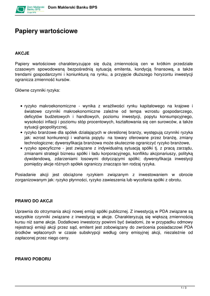 Dom Maklerski Banku BPS Papiery wartościowe AKCJE Papiery wartościowe charakteryzujące się dużą zmiennością cen w krótkim przedziale czasowym spowodowaną bezpośrednią sytuacją emitenta, kondycją finansową, a także trendami gospodarczymi i koniunkturą na rynku, a przyjęcie dłuższego horyzontu inwestycji ogranicza zmienność kursów. Główne czynniki ryzyka: ryzyko makroekonomiczne - wynika z wrażliwości rynku kapitałowego na krajowe i światowe czynniki makroekonomiczne zależne od tempa wzrostu gospodarczego, deficytów budżetowych i handlowych, poziomu inwestycji, popytu konsumpcyjnego, wysokości inflacji i poziomu stóp procentowych, kształtowania się cen surowców, a także sytuacji geopolitycznej, ryzyko branżowe dla spółek działających w określonej branży, występują czynniki ryzyka jak: wzrost konkurencji i wahania popytu na towary oferowane przez branżę, zmiany technologiczne; dywersyfikacja branżowa może skutecznie ograniczyć ryzyko branżowe, ryzyko specyficzne - jest związane z indywidualną sytuacją spółki tj. z pracą zarządu, zmianami strategii biznesu spółki i ładu korporacyjnego, konfliktu akcjonariuszy, polityką dywidendową, zdarzeniami losowymi dotyczącymi spółki; dywersyfikacja inwestycji pomiędzy akcje różnych spółek ograniczy znacząco ten rodzaj ryzyka. Posiadanie akcji jest obciążone ryzykiem związanym z inwestowaniem w obrocie zorganizowanym jak: ryzyko płynności, ryzyko zawieszenia lub wycofania spółki z obrotu. PRAWO DO AKCJI Uprawnia do otrzymania akcji nowej emisji spółki publicznej. Z inwestycją w PDA związane są wszystkie czynniki związane z inwestycją w akcje. Charakteryzują się większą zmiennością kursu niż same akcje. Dodatkowo inwestorzy powinni być świadomi, że w przypadku odmowy rejestracji emisji akcji przez sąd, emitent jest zobowiązany do zwrócenia posiadaczowi PDA środków wpłaconych w czasie subskrypcji według ceny emisyjnej akcji, niezależnie od zapłaconej przez niego ceny. PRAWO POBORU 1/3 Dom Maklerski Banku BPS Jest to prawo do objęcia emisji nowych akcji, charakteryzuje się dużą zmiennością cen. Z inwestycją związane są wszystkie czynniki związane z akcjami, ponadto czas notowań jest bardzo krótki, a po określonym terminie wygasa. W przypadku nie sprzedania prawa poboru w określonym terminie, Klient powinien rozważyć potrzebę zapisania się na akcje nowej emisji. WARRANTY SUBSKRYPCYJNE Wystawcą warrantu subskrypcyjnego może być tylko emitent (spółka). Wyróżniamy warrant europejski (może być wykonany tylko w dniu określonym przez emitenta, jako dniu wygaśnięcia), warrant amerykański (może być wykonany w dowolnym dniu, aż do wygaśnięcia). Charakteryzują się dużą zmiennością notowań, występuje ryzyko płynności notowań i inne czynniki tożsame z występujące przy pozycji długiej na opcjach. Warranty opcyjne różnią się wystawcą: mogą być wystawiane przez banki i instytucje finansowe na akcje spółek znajdujących się w obrocie zorganizowanym. OBLIGACJE Są papierem wartościowym o charakterze dłużnym z występującym ryzykiem niewypłacalności emitenta, gwaranta lub poręczyciela i brakiem możliwości wywiązania się z zobowiązań. Występuje ryzyko stopy procentowej w przypadku zmiany rynkowej stopy procentowej dla obligacji o stałym oprocentowaniu. W przypadku wzrostu stóp procentowych cena obligacji maleje, a w przypadku spadku rośnie. CERTYFIKATY INWESTYCYJNE Papiery wartościowe emitowane przez zamknięte fundusze inwestycyjne, o wartości uzależnionej od wartości portfela inwestycyjnego funduszu. Niska płynność powoduje odchylenie ceny rynkowej od ich rzeczywistej wyceny. Występuje ryzyko selekcji papierów do funduszu przez zarządzającego, ale ograniczone przez dywersyfikację. Inwestor nie posiada aktualnego dostępu do składu portfela. PRODUKTY STRUKTURYZOWANE Cena jest uzależniona od wartości przyjętego wskaźnika, a emitent zobowiązuje się nabywcy do wykupu instrumentu w określonym czasie według ustalonego wzoru. Posiadają nieograniczone możliwości konstruowania strategii inwestycyjnych uniemożliwiającą określenie 2/3 Dom Maklerski Banku BPS czynników ryzyka. Produkty w krótkim horyzoncie czasowym odznaczają się dużą zmiennością cen, lecz wydłużenie terminu inwestycyjnego ogranicza poziom zmienności. 3/3