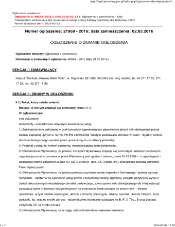 1z3 http://bzp1.portal.uzp.gov.pl/index.php?ogloszenie=show&pozycja=21... Ogłoszenie powiązane: Ogłoszenie nr 40564-2016 z dnia 2016-02-23 r. Ogłoszenie o zamówieniu - Łódź Przedmiotem zamówienia jest świadczenie usługi prania bielizny szpitalnej dla Instytutu CZMP Termin składania ofert: 2016-03-02 Numer ogłoszenia: 21969 - 2016; data zamieszczenia: 02.03.2016 OGŁOSZENIE O ZMIANIE OGŁOSZENIA Ogłoszenie dotyczy: Ogłoszenia o zamówieniu. Informacje o zmienianym ogłoszeniu: 40564 - 2016 data 23.02.2016 r. SEKCJA I: ZAMAWIAJĄCY Instytut "Centrum Zdrowia Matki Polki", ul. Rzgowska 281/289, 93-338 Łódź, woj. łódzkie, tel. 42 271 17 52; 271 17 53, fax. 42 271 17 50. SEKCJA II: ZMIANY W OGŁOSZENIU II.1) Tekst, który należy zmienić: Miejsce, w którym znajduje się zmieniany tekst: III.5). W ogłoszeniu jest: inne dokumenty Dokumenty i oświadczenia dotyczące świadczonej usługi 1) Zaświadczenie o wdrożeniu w pralni procedur zapewniających odpowiednią jakość mikrobiologiczną pranej bielizny szpitalnej ujętych w normie PN-EN 14065:2005 Tekstylia poddawane obróbce w pralni - System kontroli skażenia biologicznego wydane przez uprawnioną do certyfikacji jednostkę. 2) Protokół z ostatniej kontroli sanitarnej, niestwierdzający nieprawidłowości. 3) Oświadczenie Wykonawcy, że pralnia i transport Wykonawcy znajduje się pod stałym nadzorem sanitarnym, organizacja prania stosowana w pralni Wykonawcy jest zgodna z ustawą z dnia 05.12.2008 r. o zapobieganiu i zwalczaniu chorób zakaźnych u ludzi (t.j. Dz.U. z 2013r., poz. 947 z późn. zm.) oraz pralnia posiada wdrożony Planu higieny pralni 4) Oświadczenie Wykonawcy, że pralnia posiada pozytywną opinię Inspektora Sanitarnego i spełnia wymogi techniczno - sanitarne na wykonanie usługi prania i dezynfekcji bielizny szpitalnej, posiada pozytywne wyniki z badań laboratoryjnych niezależnego ośrodka badawczego, towarzystwa mikrobiologicznego lub innej instytucji wydającej opinie o środkach dezynfekcyjnych na stosowane środki piorące na asortyment: - bielizna pościelowa, w tym bielizna operacyjna, ubrania i fartuchy operacyjne, piżamy, ręczniki, ubrania robocze, koce, poduszki, itp. oraz na środki piorąco - dezynfekcyjne skutecznie działające na B, F, V, Tbc., S oraz posiada certyfikaty CE na środki piorące 5) Oświadczenie Wykonawcy, że w ciągu ostatnich dwóch lat wykonano minimum: 2016-03-02 15:50 2z3 http://bzp1.portal.uzp.gov.pl/index.php?ogloszenie=show&pozycja=21... - 2 wymazy czystościowe wykonane z bielizny operacyjnej po cyklu prania i dezynfekcji, - 2 wymazy czystościowe wykonane z materacy po dezynfekcji komorowej w pralni Wykonawcy, - 2 wymazy z powierzchni ładunkowej samochodu przeznaczonego do transportu bielizny szpitalnej, - 2 wymazy z rąk pracowników, - 2 wymazy z maszyny szwalniczej, - 2 wymazy z magla, - 2 wymazy z regałów na których jest przechowywana czysta bielizna, które zostały potwierdzone przez właściwą stację sanitarno-epidemiologiczną lub akredytowane przez Polskie Centrum Akredytacji Laboratorium wpisane na listę Laboratoriów Badawczych lub inną jednostkę uprawnioną do przeprowadzenia ww. badań i nie wykazały one nieprawidłowości. W ogłoszeniu powinno być: inne dokumenty Dokumenty i oświadczenia dotyczące świadczonej usługi 1) Zaświadczenie o wdrożeniu w pralni procedur zapewniających odpowiednią jakość mikrobiologiczną pranej bielizny szpitalnej ujętych w normie PN-EN 14065:2005 Tekstylia poddawane obróbce w pralni - System kontroli skażenia biologicznego wydane przez uprawnioną do certyfikacji jednostkę. 2) Protokół z ostatniej kontroli sanitarnej, niestwierdzający nieprawidłowości. 3) Oświadczenie Wykonawcy, że pralnia i transport Wykonawcy znajduje się pod stałym nadzorem sanitarnym, organizacja prania stosowana w pralni Wykonawcy jest zgodna z ustawą z dnia 05.12.2008 r. o zapobieganiu i zwalczaniu chorób zakaźnych u ludzi (t.j. Dz.U. z 2013r., poz. 947 z późn. zm.) oraz pralnia posiada wdrożony Planu higieny pralni 4) Oświadczenie Wykonawcy, że pralnia posiada pozytywną opinię Inspektora Sanitarnego i spełnia wymogi techniczno - sanitarne na wykonanie usługi prania i dezynfekcji bielizny szpitalnej, posiada pozytywne wyniki z badań laboratoryjnych niezależnego ośrodka badawczego, towarzystwa mikrobiologicznego lub innej instytucji wydającej opinie o środkach dezynfekcyjnych na stosowane środki piorące na asortyment: - bielizna pościelowa, w tym bielizna operacyjna, ubrania i fartuchy operacyjne, piżamy, ręczniki, ubrania robocze, koce, poduszki, itp. oraz na środki piorąco - dezynfekcyjne skutecznie działające na B, F, V, Tbc., S oraz posiada certyfikaty CE na środki piorące 5) Oświadczenie Wykonawcy, że w ciągu ostatnich dwóch lat wykonano minimum: - 2 wymazy czystościowe wykonane z bielizny operacyjnej po cyklu prania i dezynfekcji, - 2 wymazy czystościowe wykonane z materacy po dezynfekcji komorowej w pralni Wykonawcy Zamawiający dopuszcza metodę odciskową pod warunkiem, iż w wyniku tej metody podane są (poza ilością jednostek tworzących kolonie tzw. CFU) również nazwy gatunkowe drobnoustrojów stwierdzonych na płytce, - 2 wymazy z powierzchni ładunkowej samochodu przeznaczonego do transportu bielizny szpitalnej, - 2 wymazy z rąk pracowników, - 2 wymazy z maszyny szwalniczej, Zamawiający dopuszcza metodę odciskową pod warunkiem, iż w wyniku tej metody podane są (poza ilością jednostek tworzących kolonie tzw. CFU) również nazwy gatunkowe drobnoustrojów stwierdzonych na płytce, 2016-03-02 15:50 3z3 http://bzp1.portal.uzp.gov.pl/index.php?ogloszenie=show&pozycja=21... - 2 wymazy z magla, - 2 wymazy z regałów na których jest przechowywana czysta bielizna, które zostały potwierdzone przez właściwą stację sanitarno-epidemiologiczną lub akredytowane przez Polskie Centrum Akredytacji Laboratorium wpisane na listę Laboratoriów Badawczyc